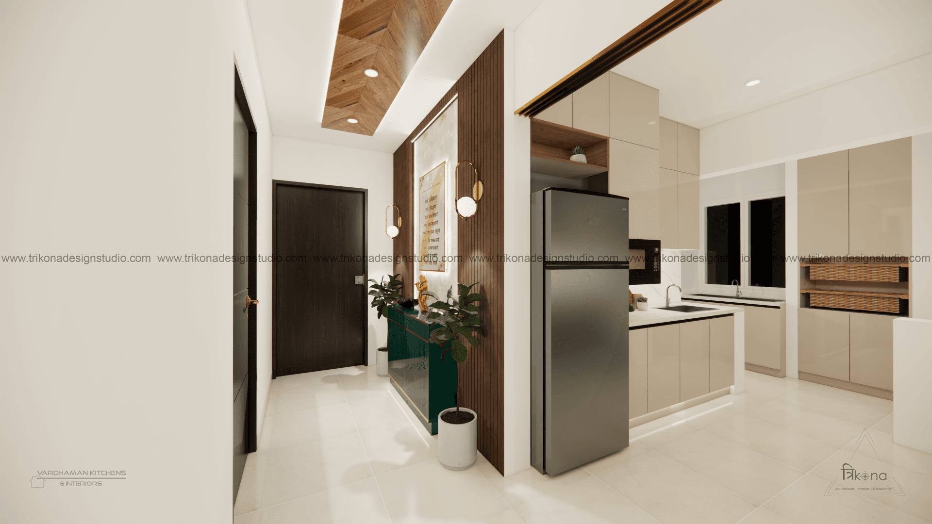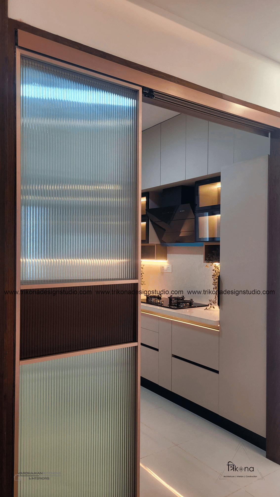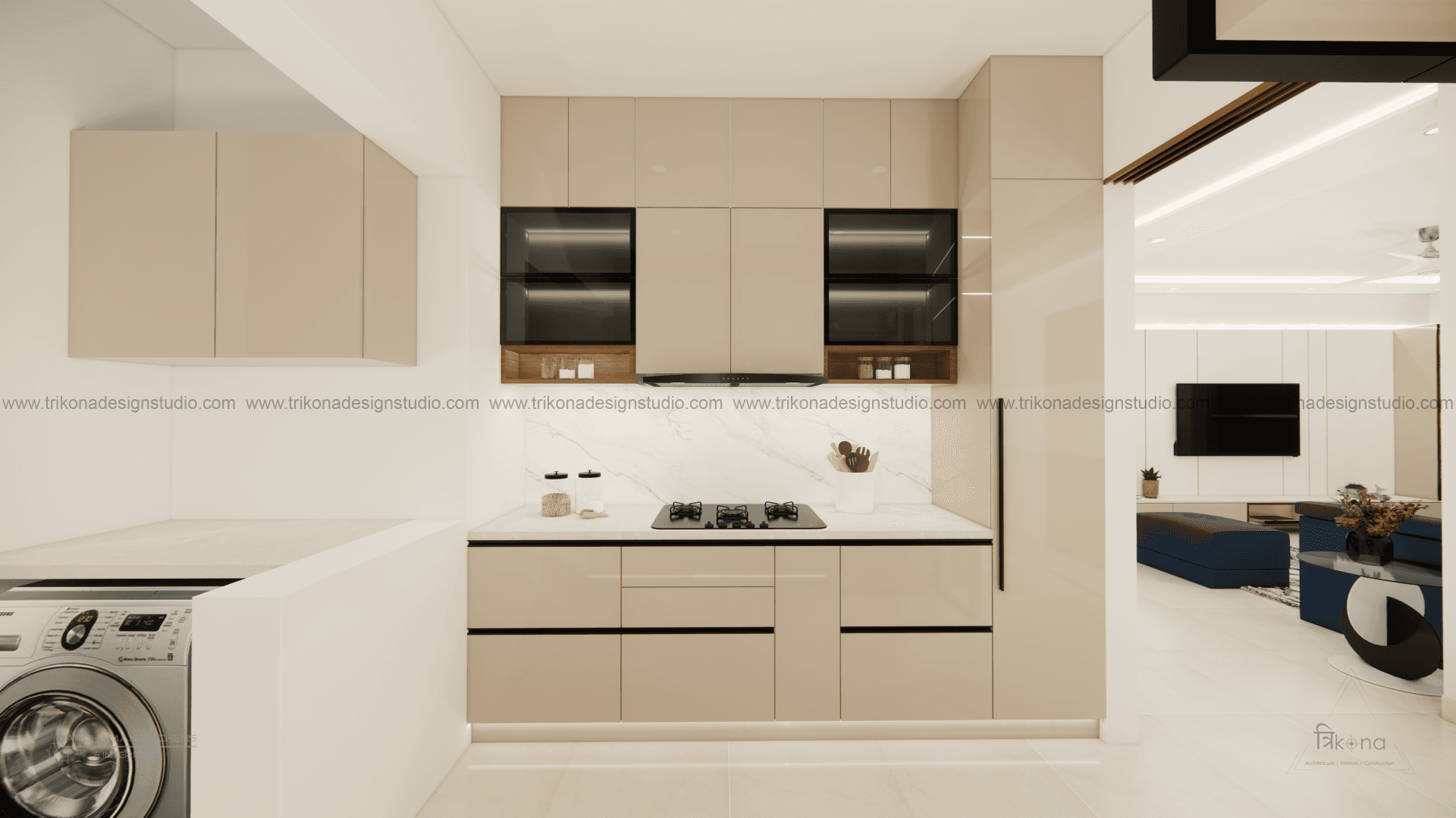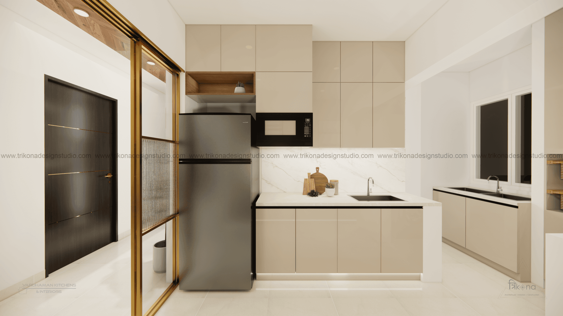 A stunning 3-bedroom apartment nestled in vibrant Bangalore. Embrace contemporary elegance in the living room adorned with French moldings and a chic cool blue couch. The dining area dazzles with a multifunctional crockery cum pooja unit. Experience culinary delights in the parallel kitchen, bathed in soothing beige tones, concealed by a sleek fluted sliding door with rose gold accents. Retreat to the master bedroom accented with rich browns, while the parents' bedroom exudes warmth with wooden accents. Let the kids' room enchant with soft pink hues.