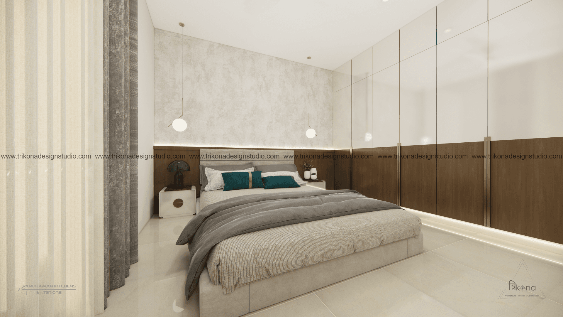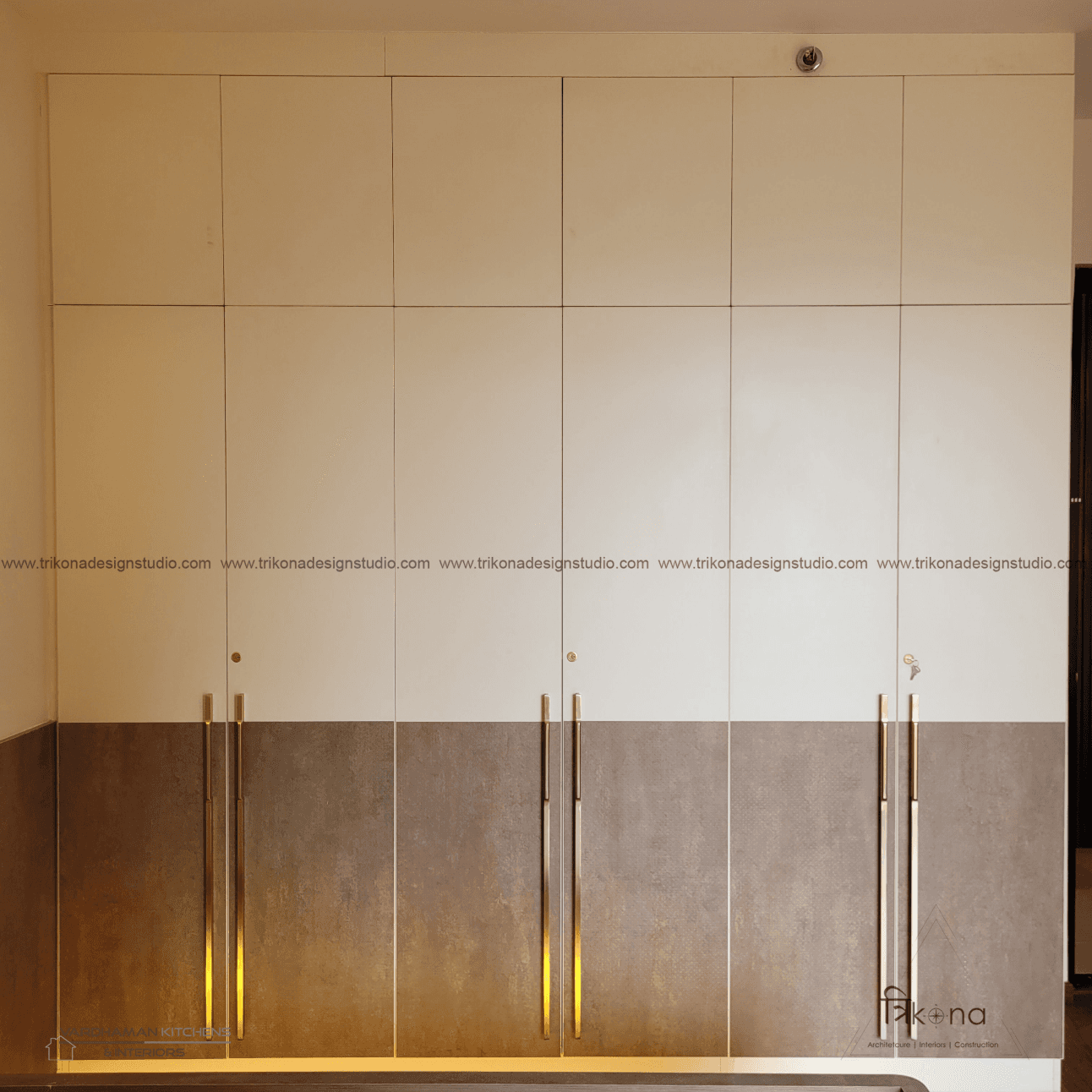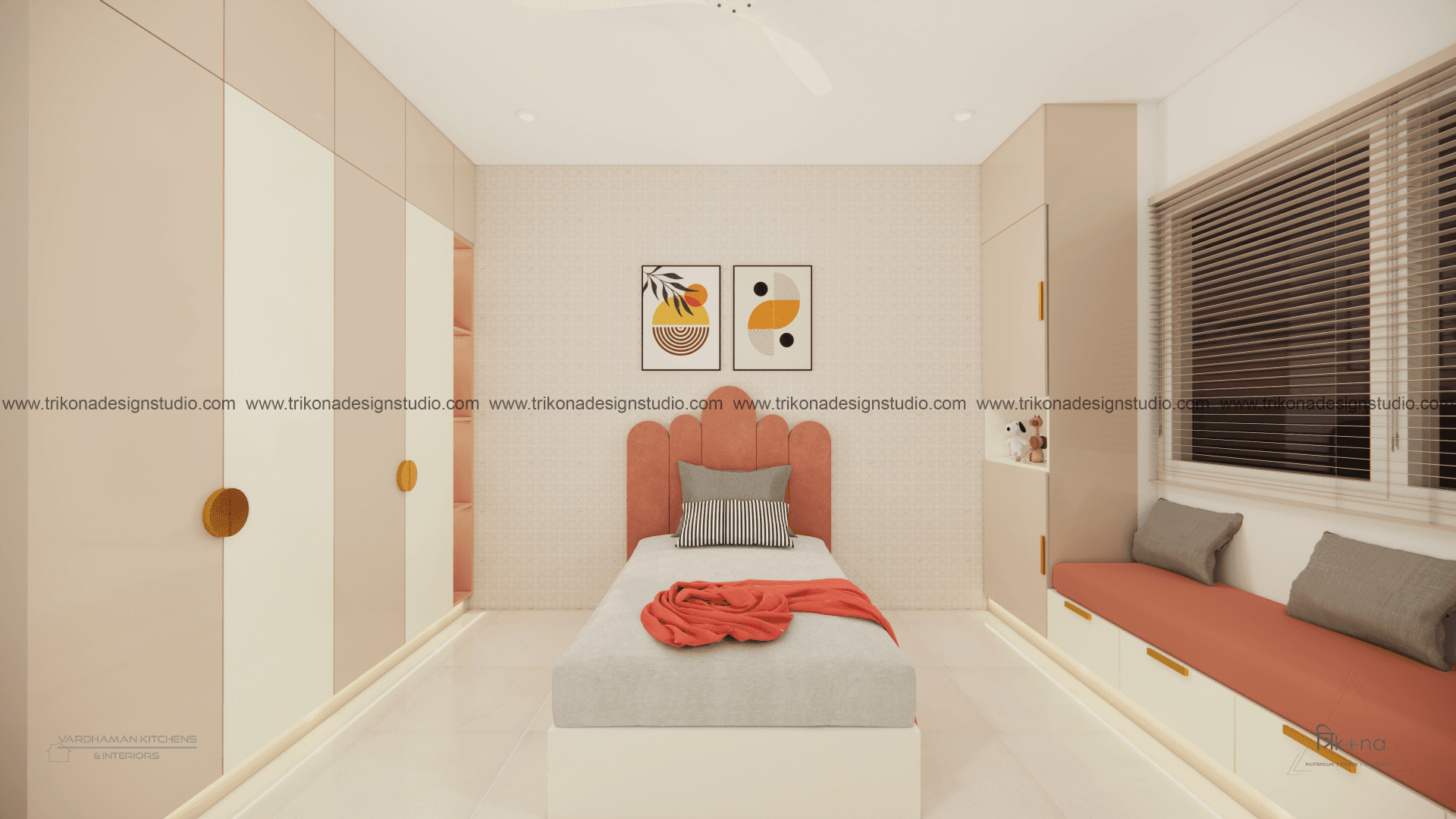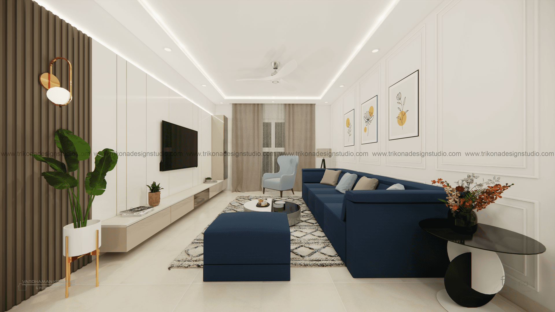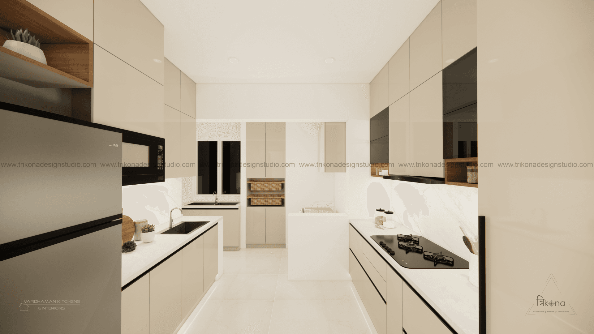 A stunning 3-bedroom apartment nestled in vibrant Bangalore. Embrace contemporary elegance in the living room adorned with French moldings and a chic cool blue couch. The dining area dazzles with a multifunctional crockery cum pooja unit. Experience culinary delights in the parallel kitchen, bathed in soothing beige tones, concealed by a sleek fluted sliding door with rose gold accents. Retreat to the master bedroom accented with rich browns, while the parents' bedroom exudes warmth with wooden accents. Let the kids' room enchant with soft pink hues.