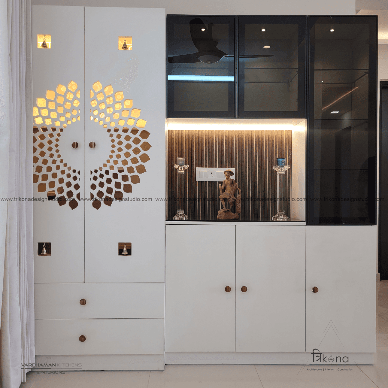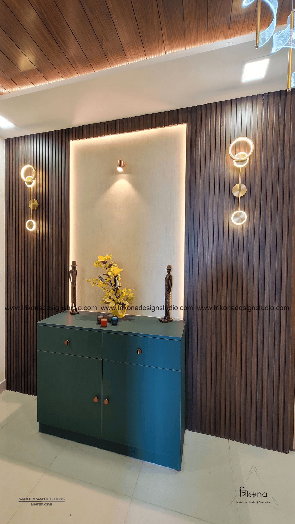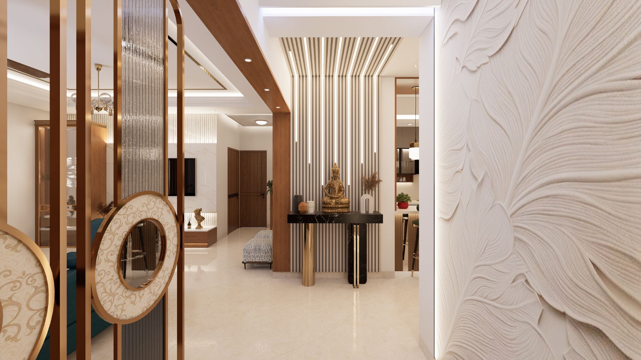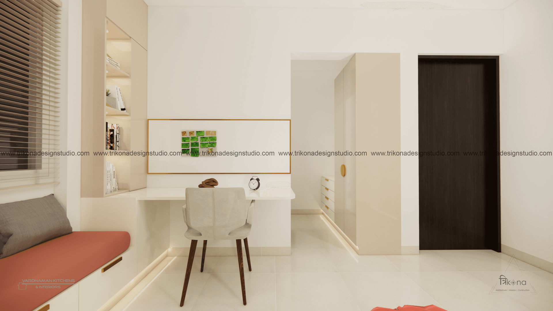 A stunning 3-bedroom apartment nestled in vibrant Bangalore. Embrace contemporary elegance in the living room adorned with French moldings and a chic cool blue couch. The dining area dazzles with a multifunctional crockery cum pooja unit. Experience culinary delights in the parallel kitchen, bathed in soothing beige tones, concealed by a sleek fluted sliding door with rose gold accents. Retreat to the master bedroom accented with rich browns, while the parents' bedroom exudes warmth with wooden accents. Let the kids' room enchant with soft pink hues.