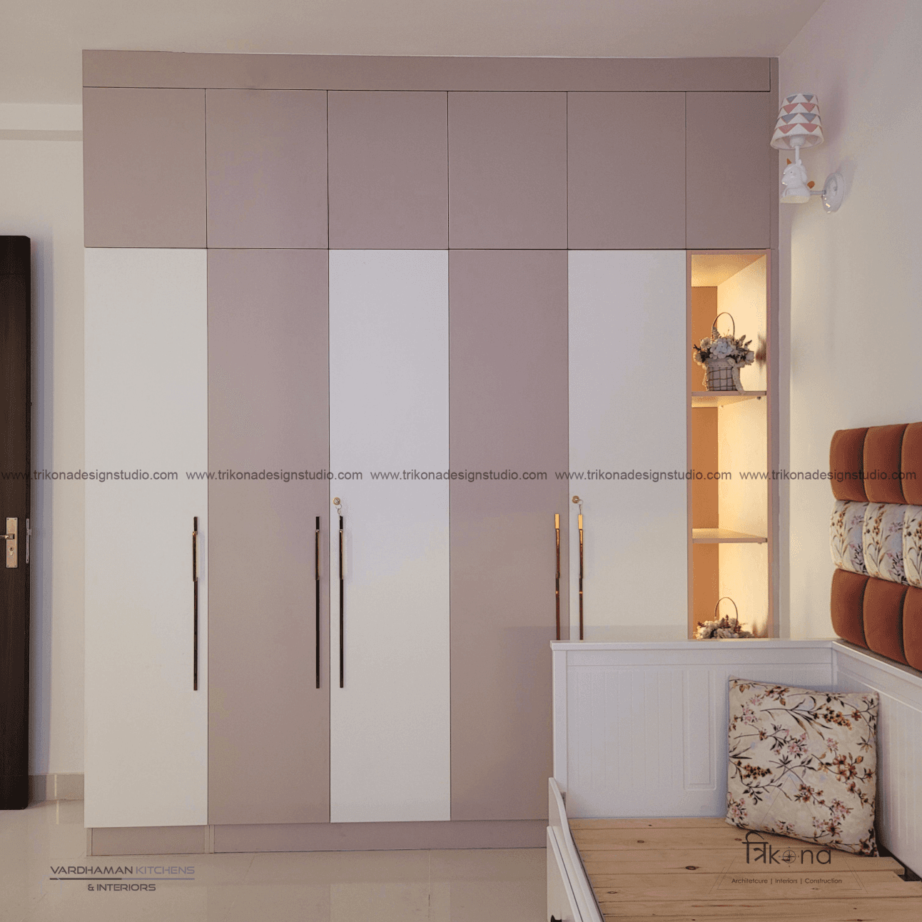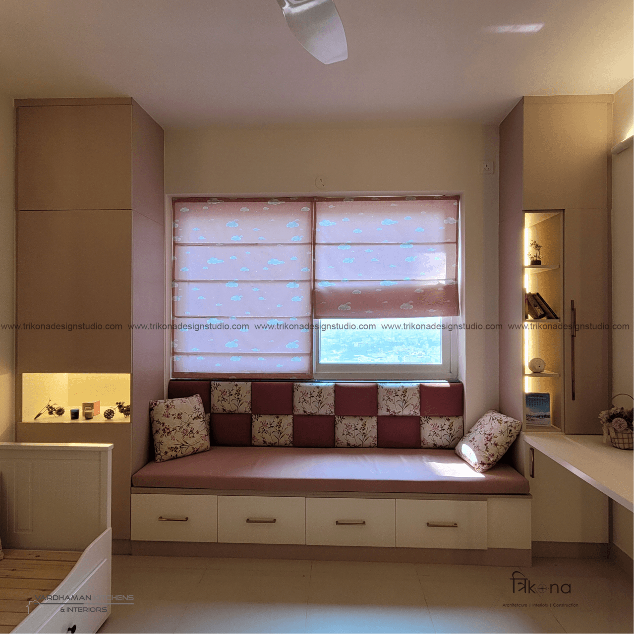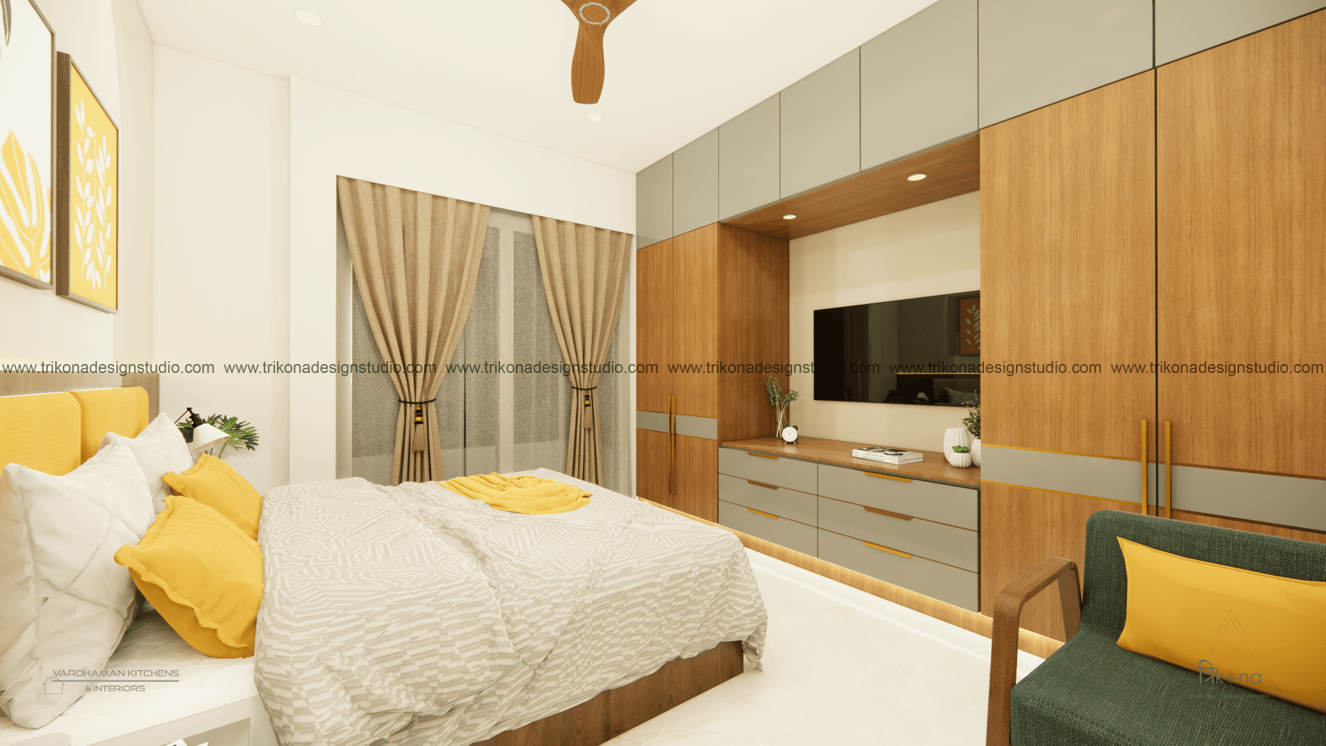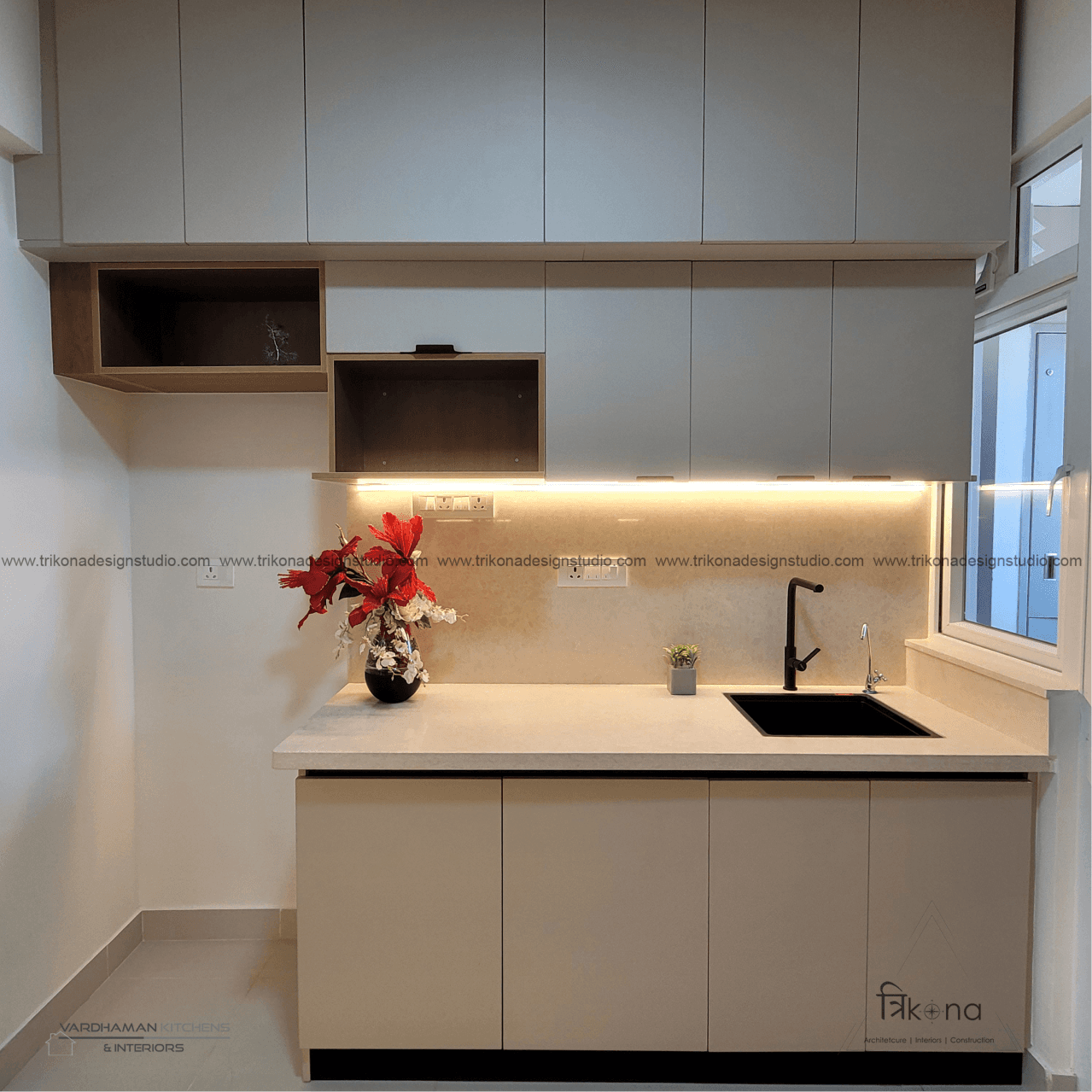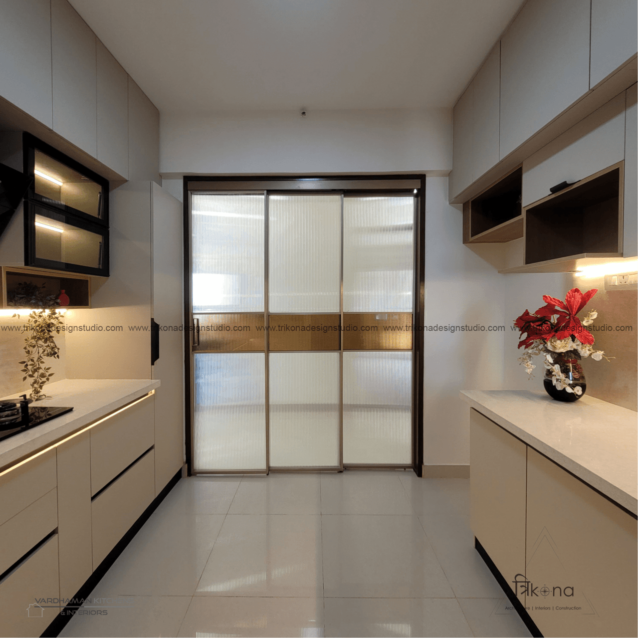 A stunning 3-bedroom apartment nestled in vibrant Bangalore. Embrace contemporary elegance in the living room adorned with French moldings and a chic cool blue couch. The dining area dazzles with a multifunctional crockery cum pooja unit. Experience culinary delights in the parallel kitchen, bathed in soothing beige tones, concealed by a sleek fluted sliding door with rose gold accents. Retreat to the master bedroom accented with rich browns, while the parents' bedroom exudes warmth with wooden accents. Let the kids' room enchant with soft pink hues.