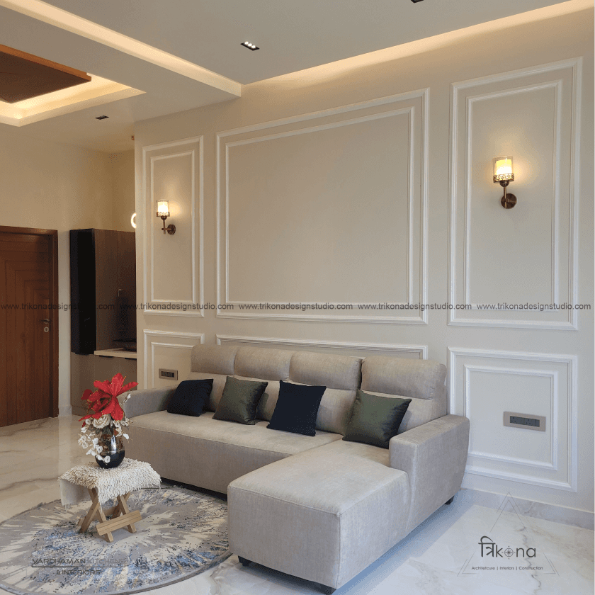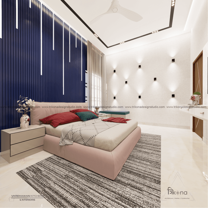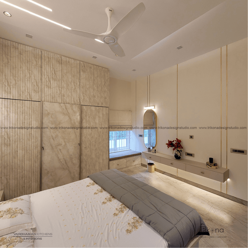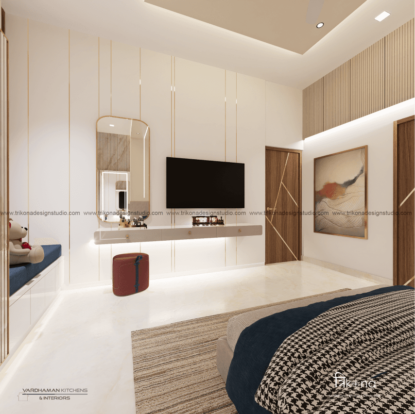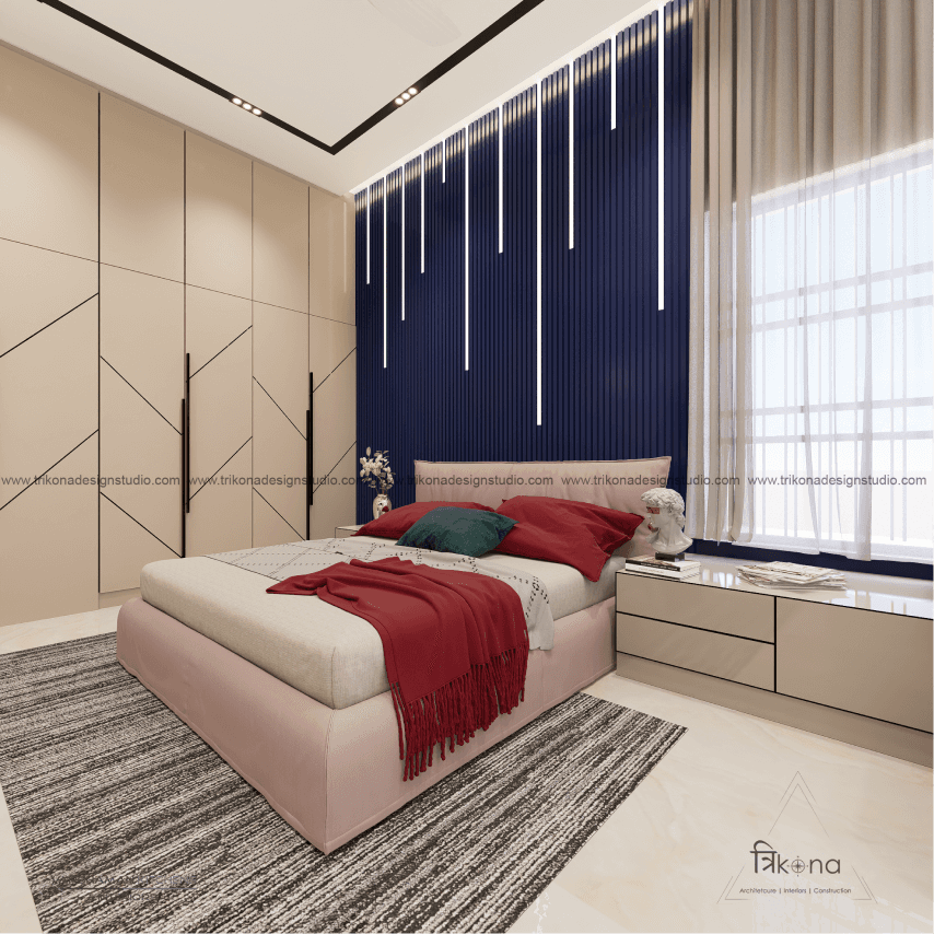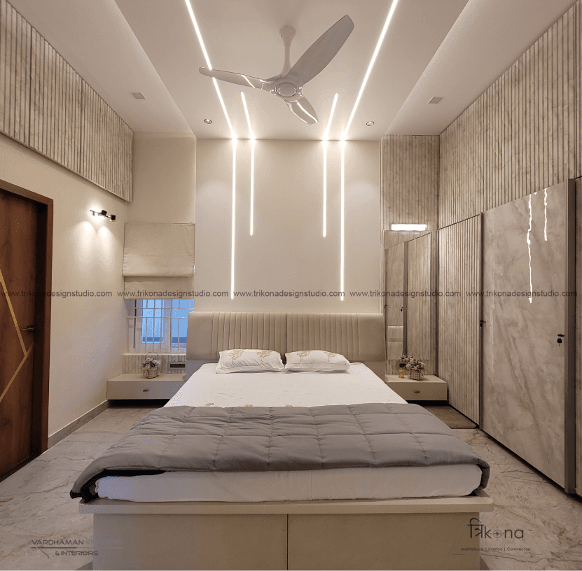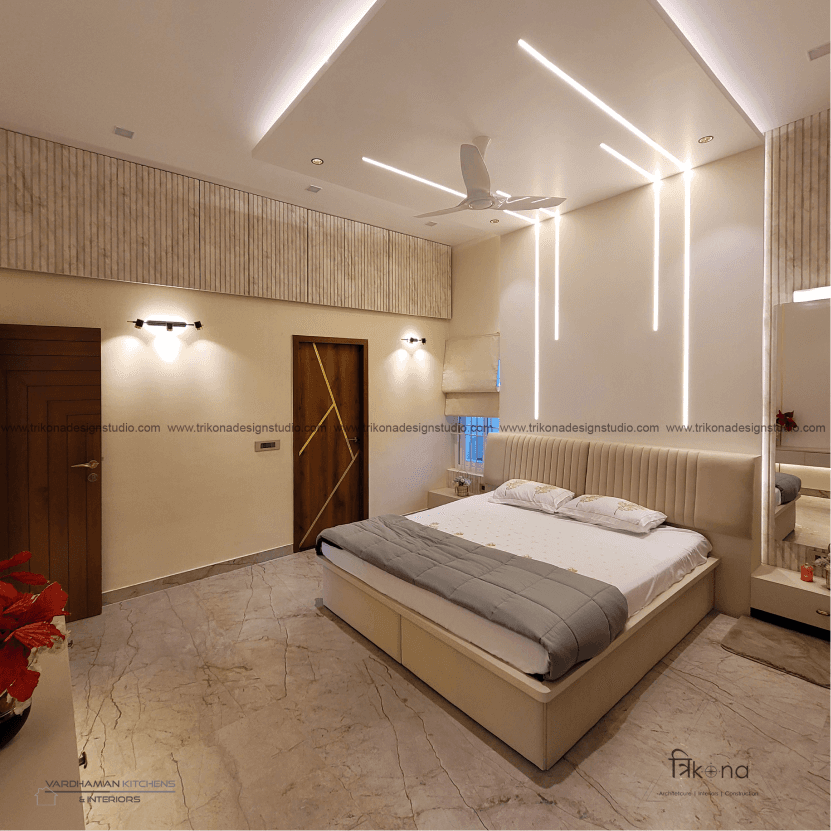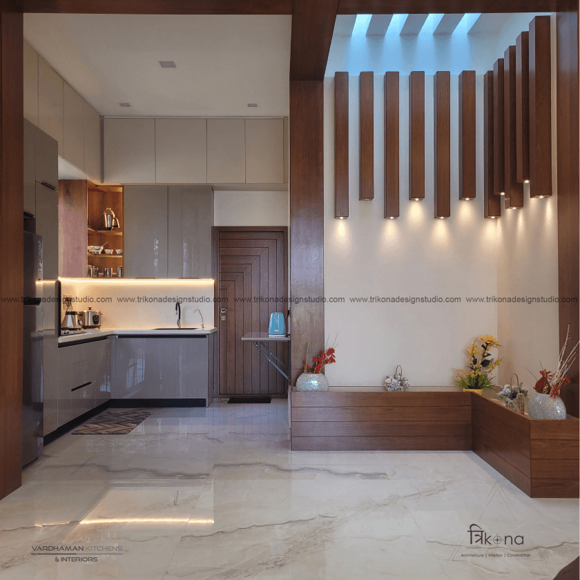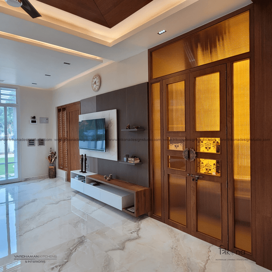 Discover the epitome of contemporary elegance at our villa nestled in Kolar. Step into a living room adorned with neutral hues and accentuated by warm wooden textures. Adjacent, find solace in our elegant pooja room, boasting exquisite wooden and fluted glass doors. Our compact kitchenette and master bedroom echo the serene neutrals, while another bedroom offers a striking contrast with a deep blue louvered bed wall illuminated by linear lights. Welcome to a harmonious blend of modernity and tranquility.