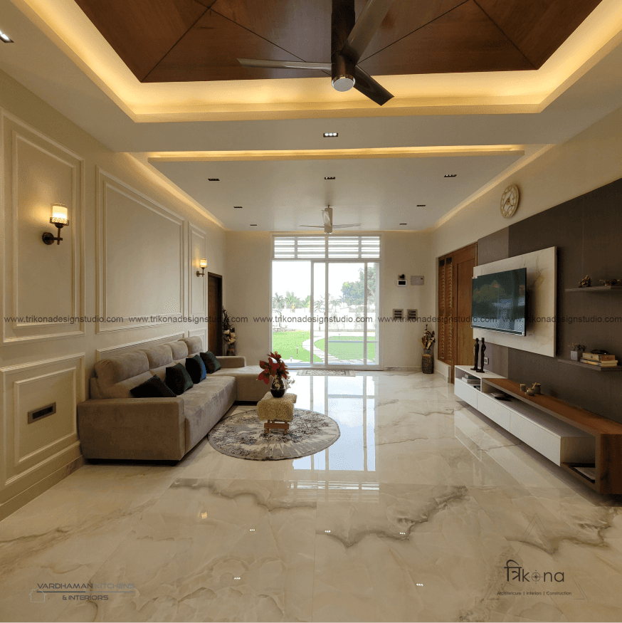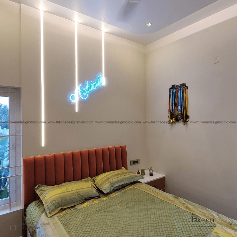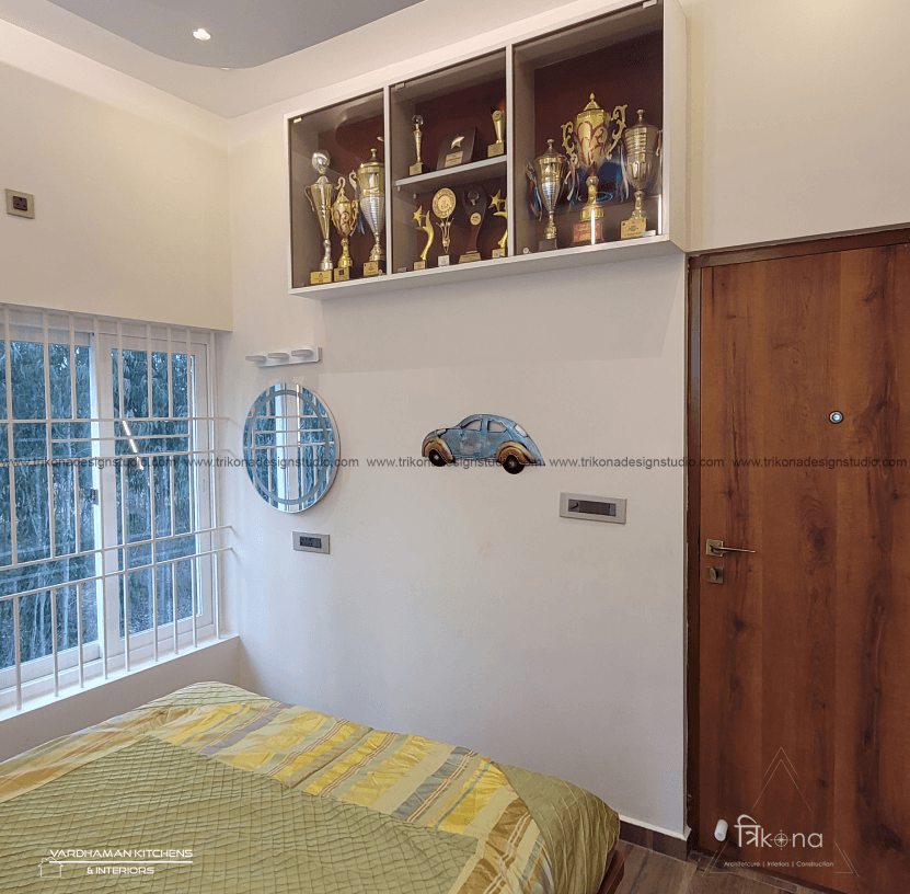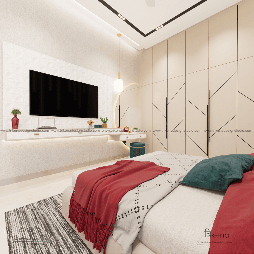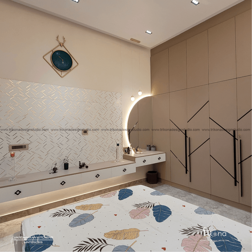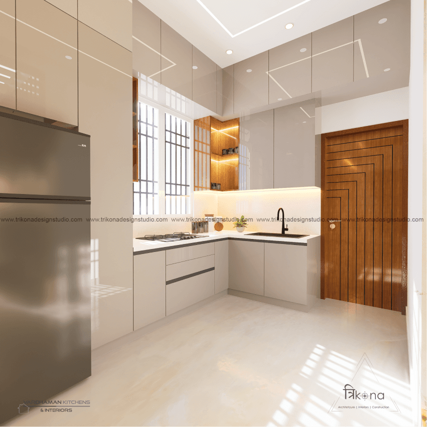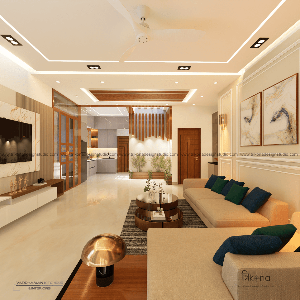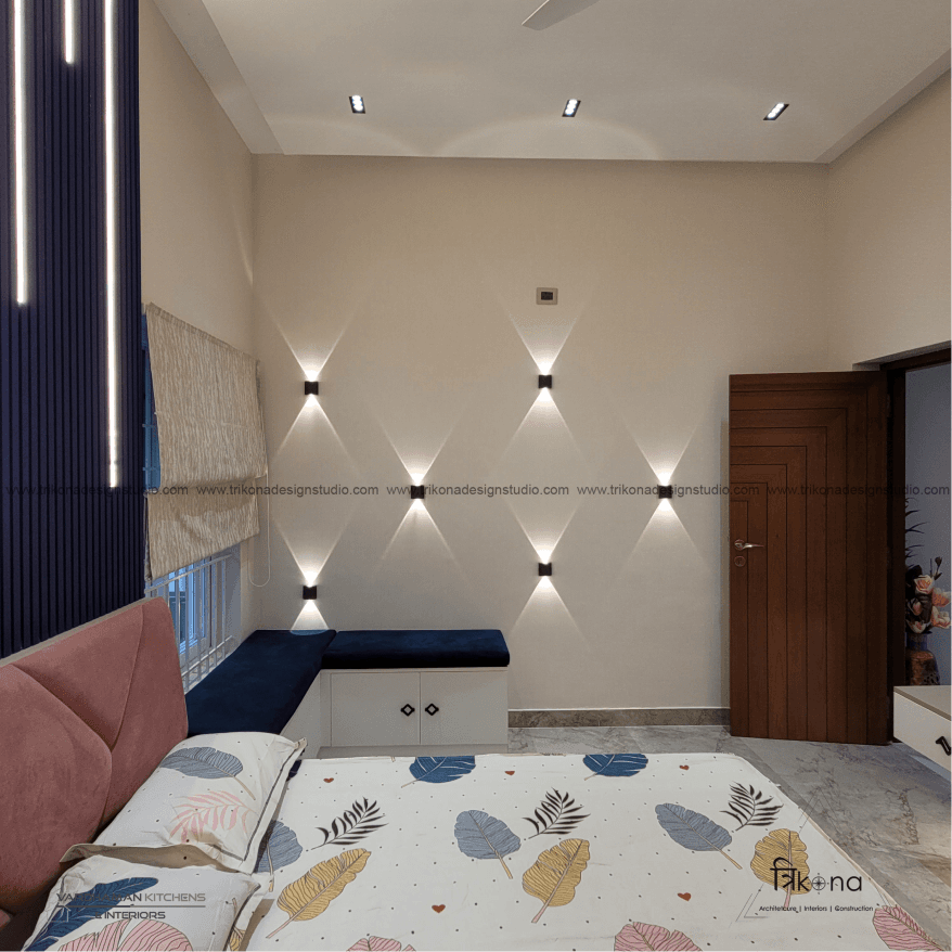 Discover the epitome of contemporary elegance at our villa nestled in Kolar. Step into a living room adorned with neutral hues and accentuated by warm wooden textures. Adjacent, find solace in our elegant pooja room, boasting exquisite wooden and fluted glass doors. Our compact kitchenette and master bedroom echo the serene neutrals, while another bedroom offers a striking contrast with a deep blue louvered bed wall illuminated by linear lights. Welcome to a harmonious blend of modernity and tranquility.
