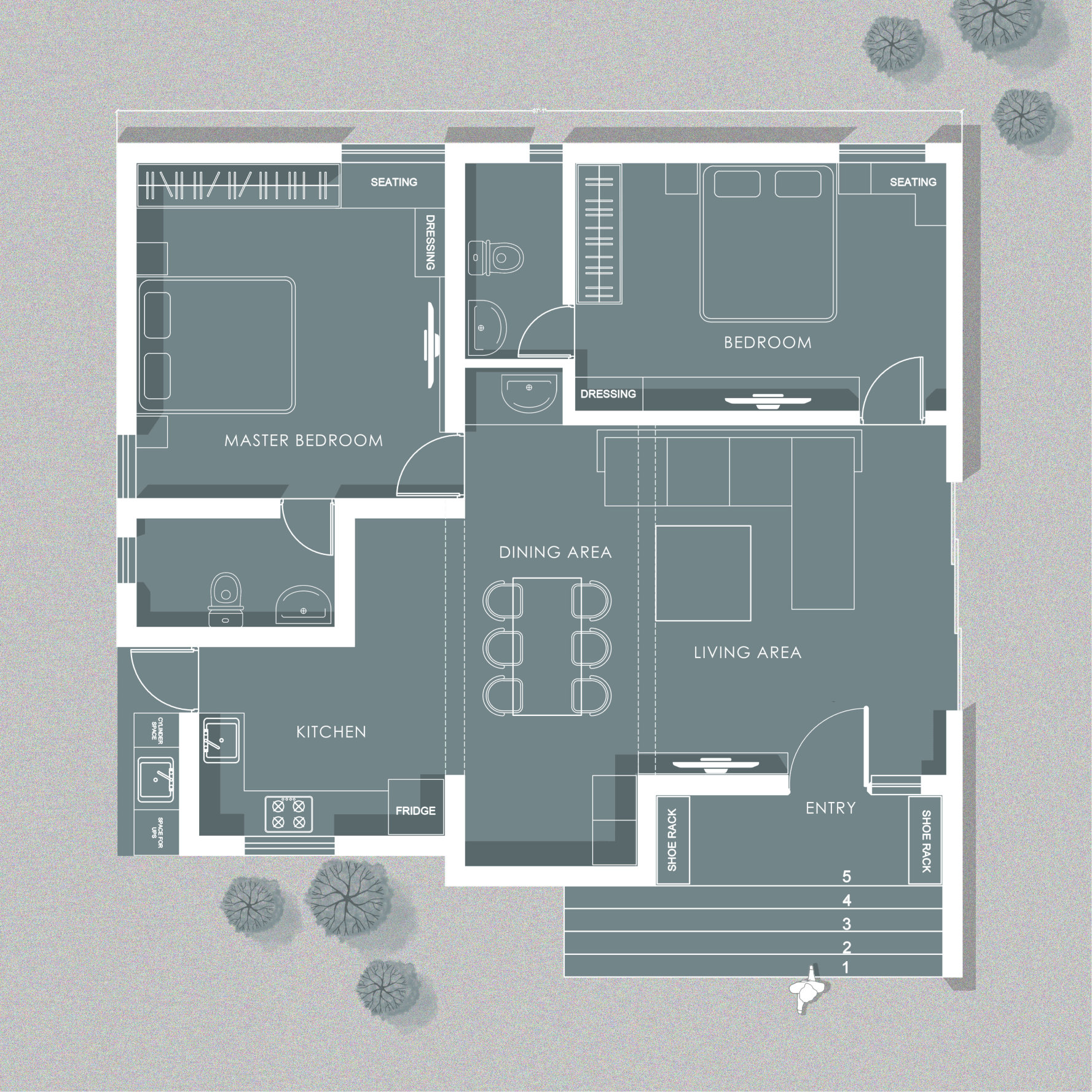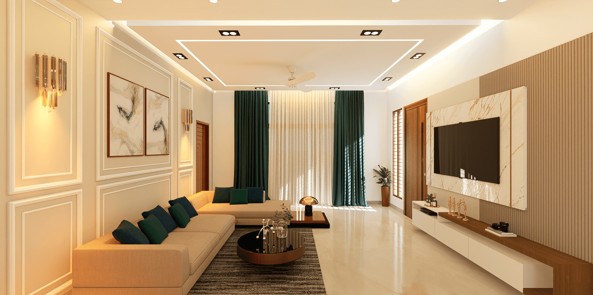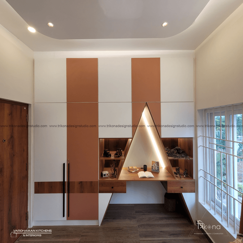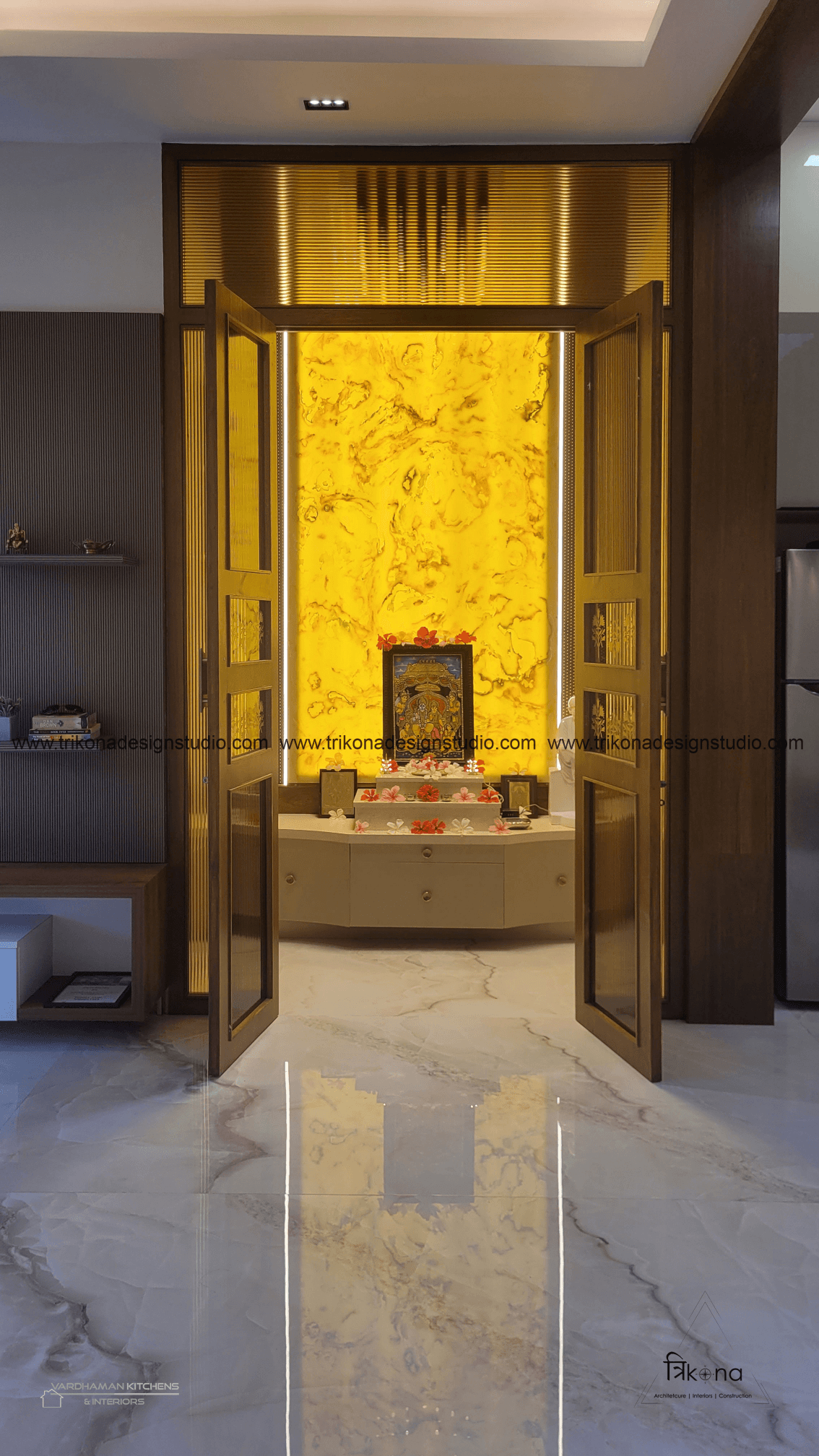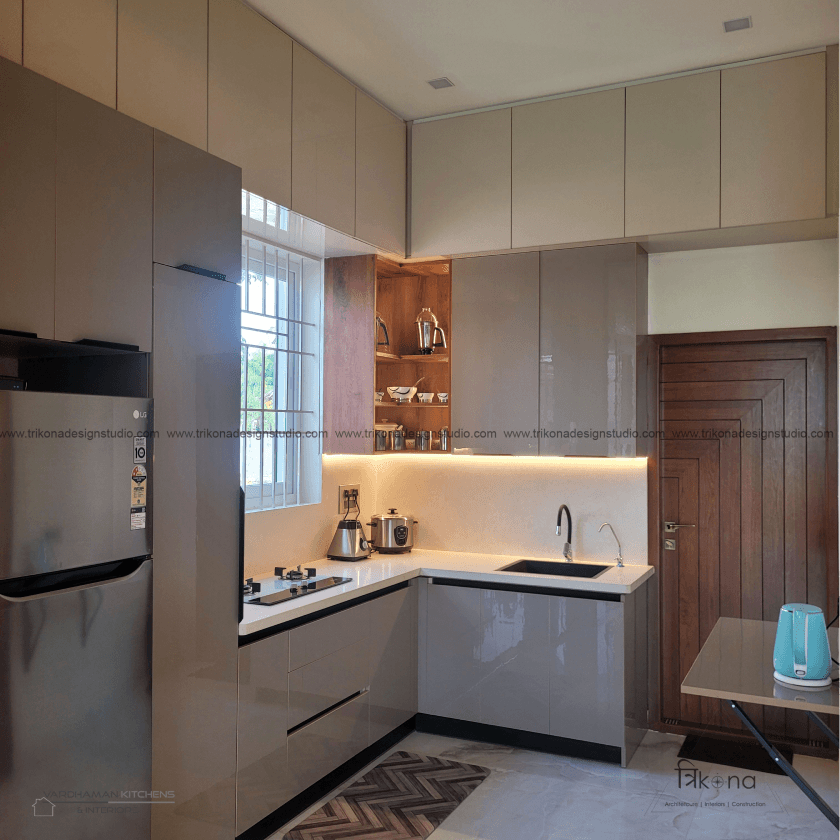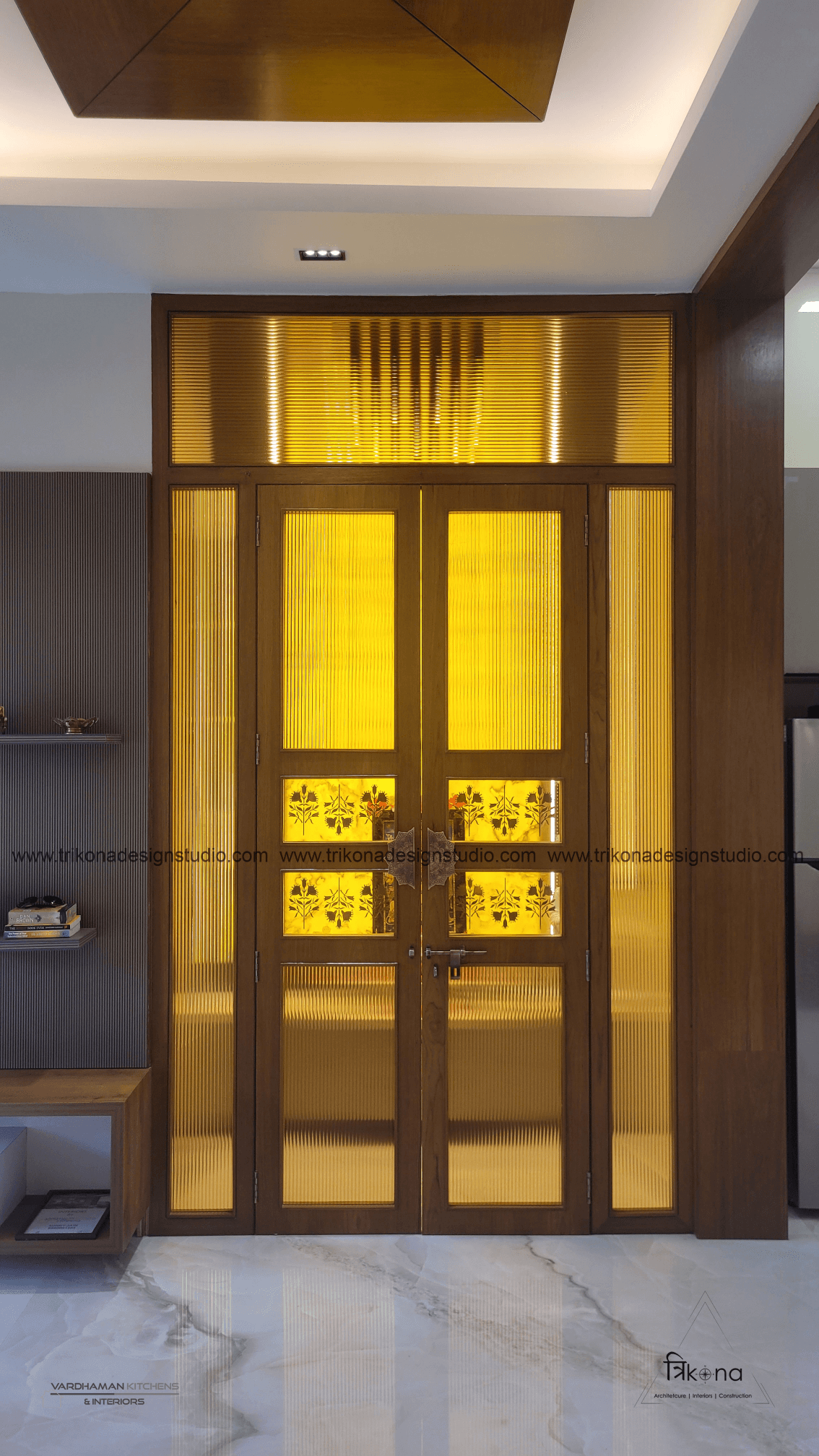 Discover the epitome of contemporary elegance at our villa nestled in Kolar. Step into a living room adorned with neutral hues and accentuated by warm wooden textures. Adjacent, find solace in our elegant pooja room, boasting exquisite wooden and fluted glass doors. Our compact kitchenette and master bedroom echo the serene neutrals, while another bedroom offers a striking contrast with a deep blue louvered bed wall illuminated by linear lights. Welcome to a harmonious blend of modernity and tranquility.