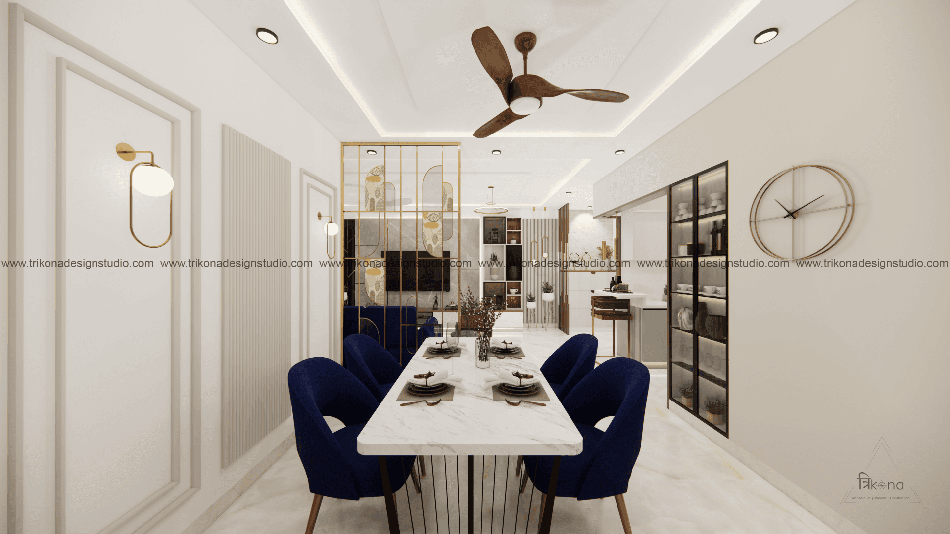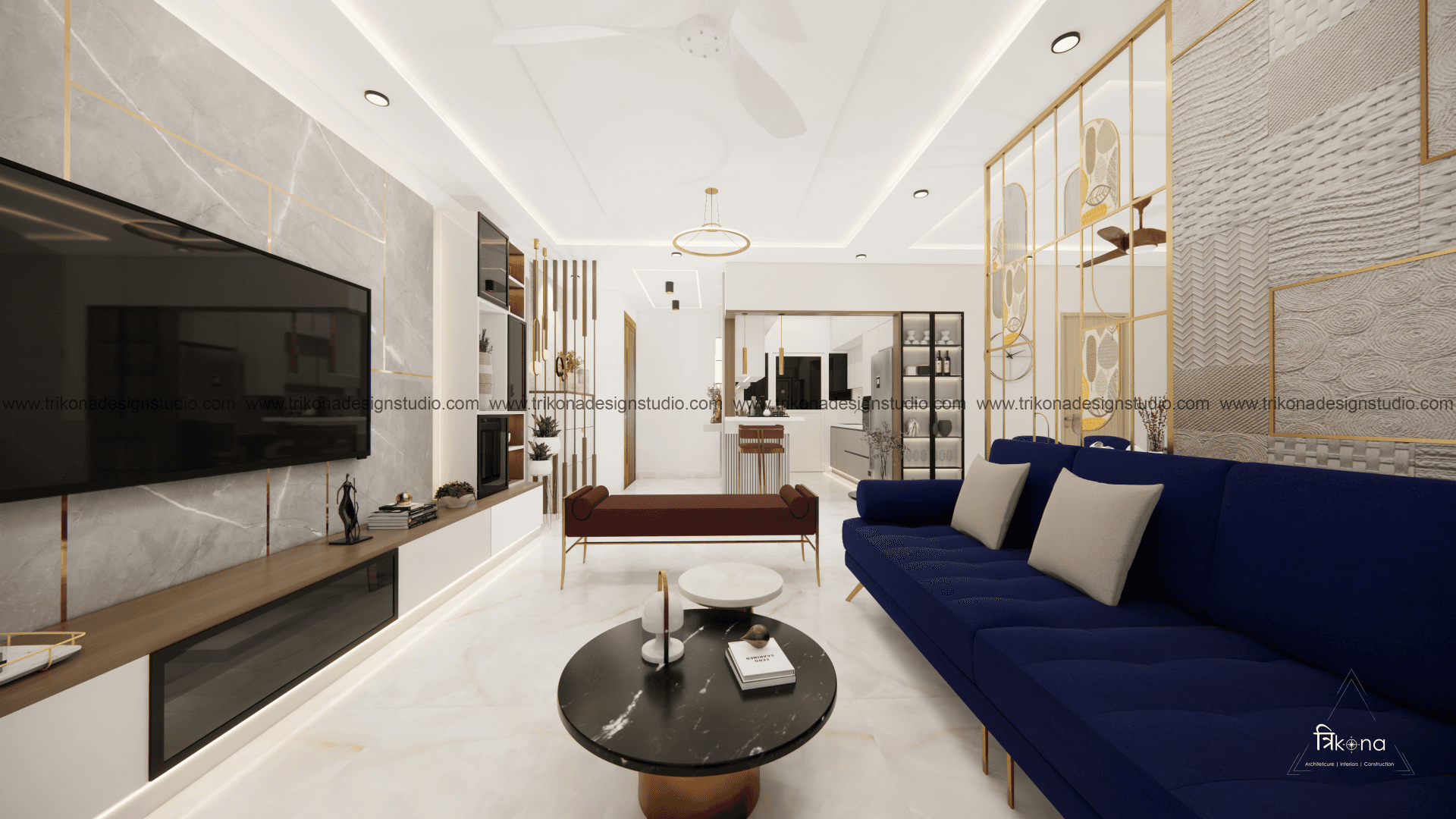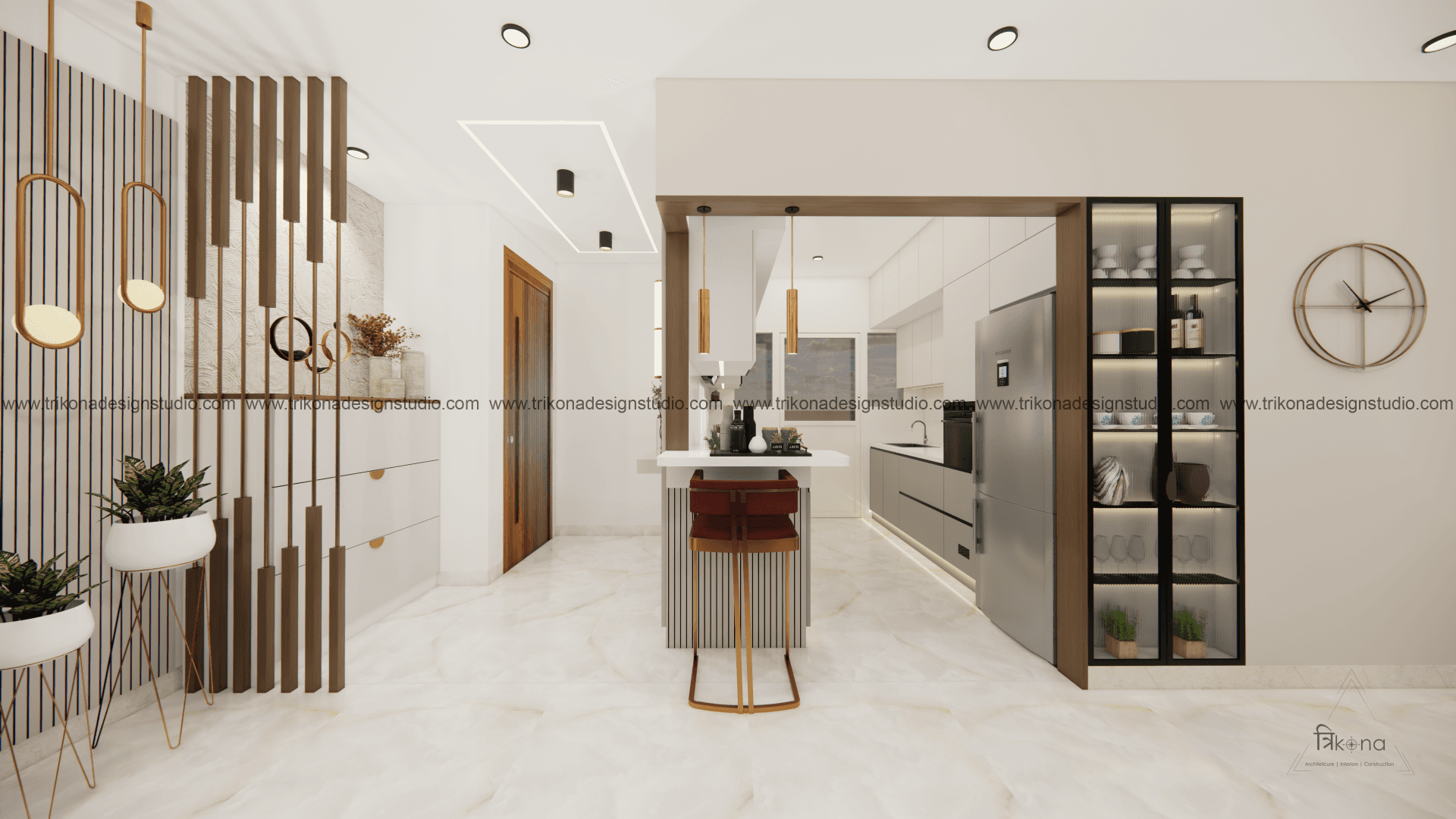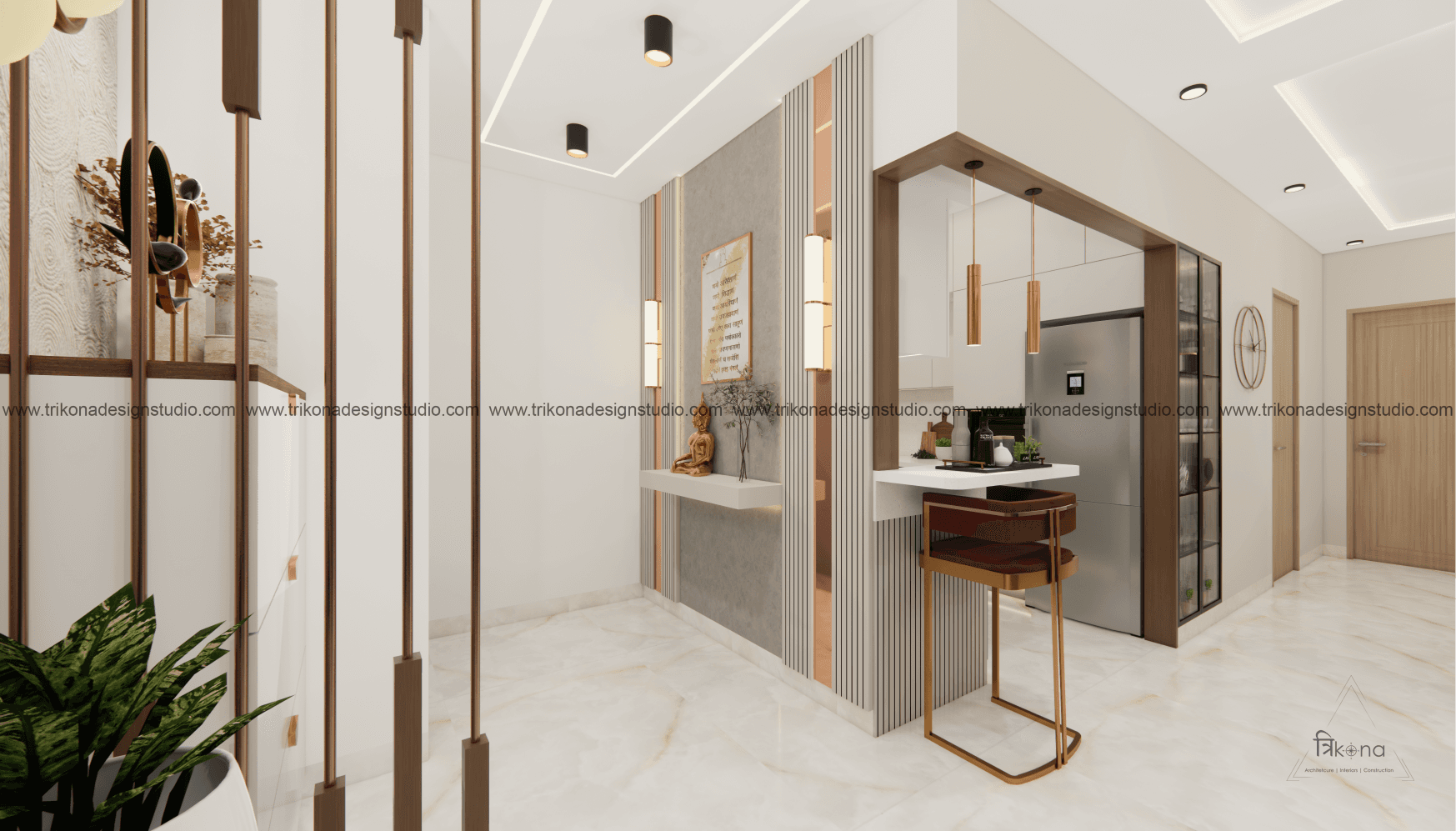 A luxurious 3-bedroom apartment in Bangalore where every corner exudes sophistication. The entrance boasts a stunning statement wall with louvered and rose gold mirror paneling, housing a serene Buddha idol. In the living room, a sleek TV unit and semi-open storage add modern flair. The kitchen dazzles in gray tones with a sleek crockery unit in fluted glass. Each bedroom is a masterpiece - from the kids' room with textured waves to the guest room's smart storage solutions, to the master bedroom's olive green accents and versatile wardrobe design. Welcome to a realm of timeless elegance at Modern Mirage.