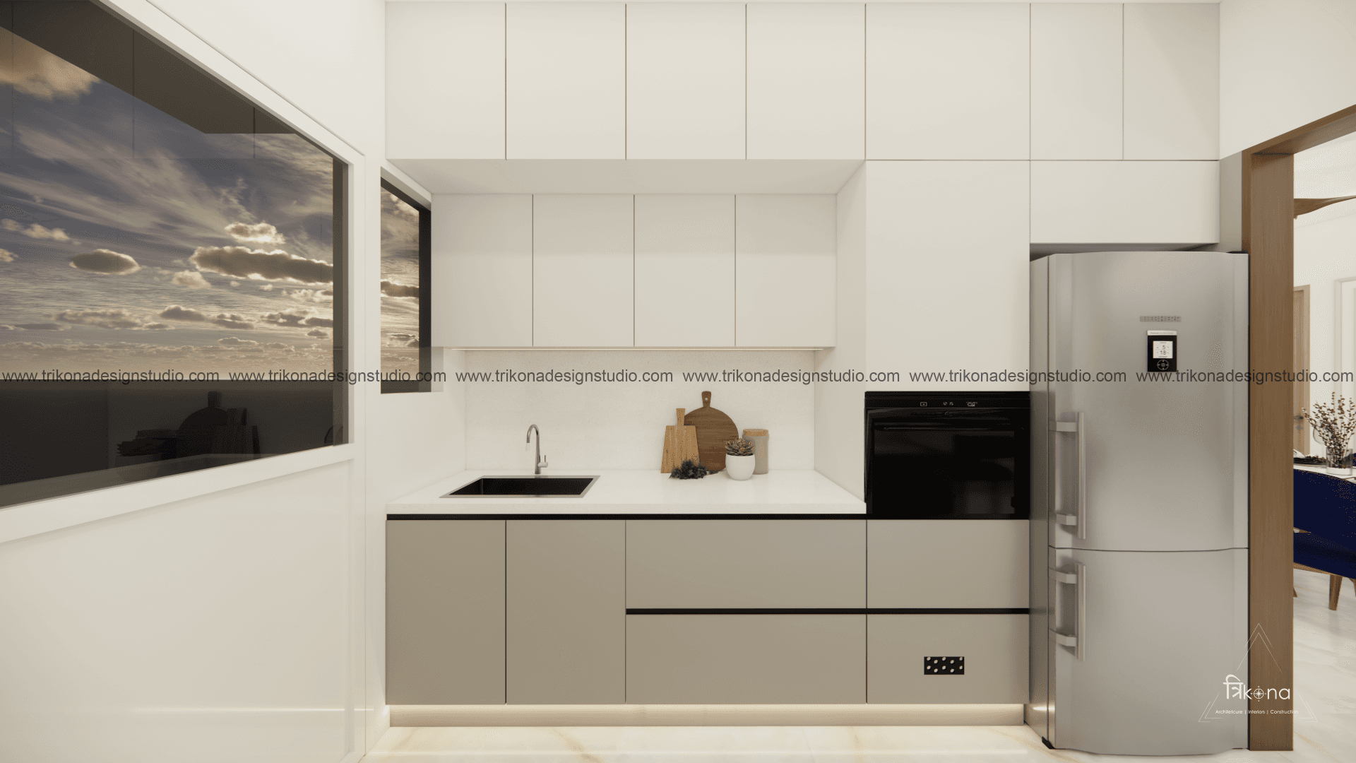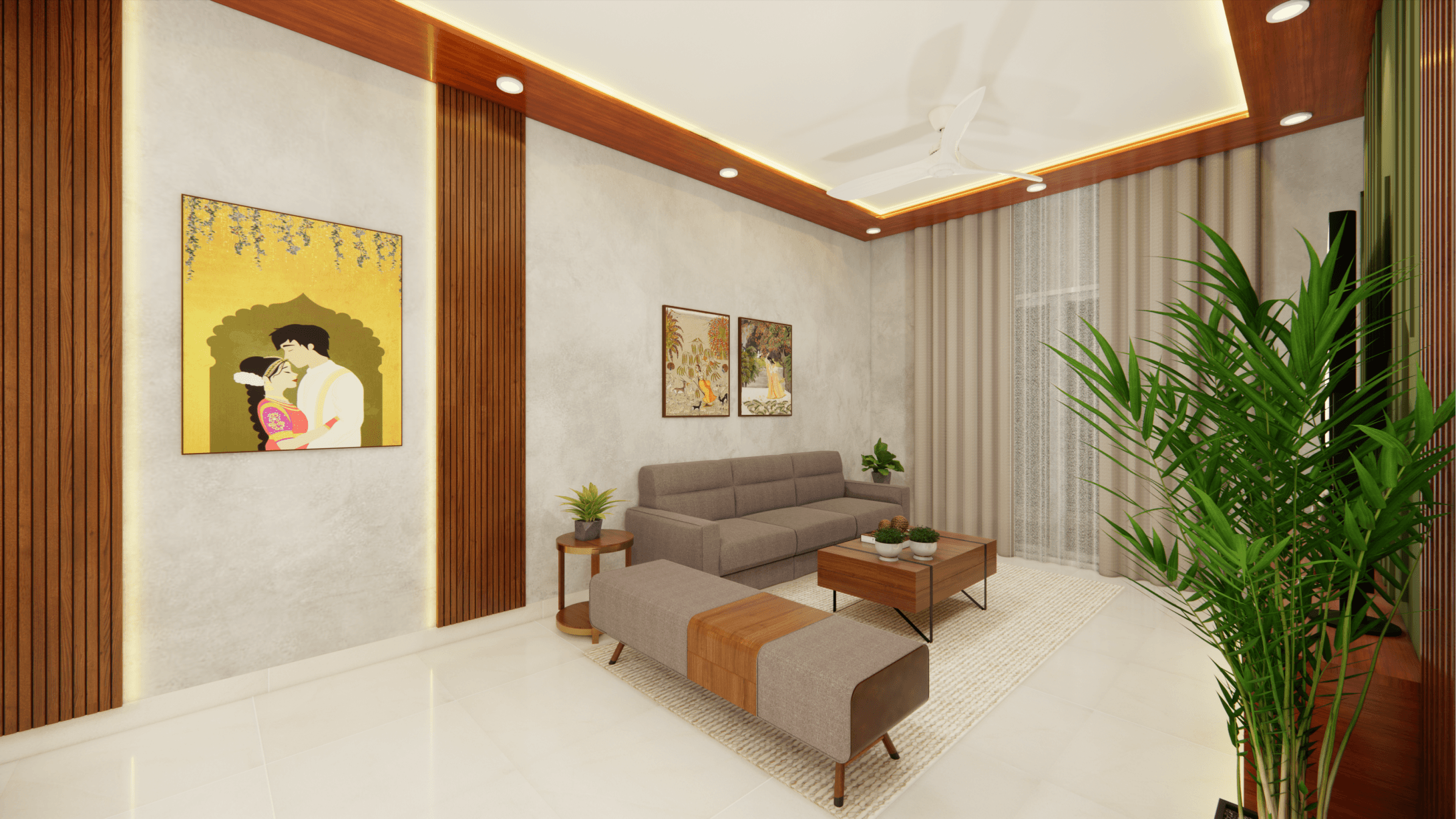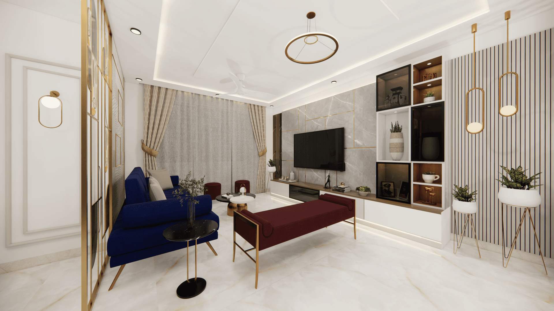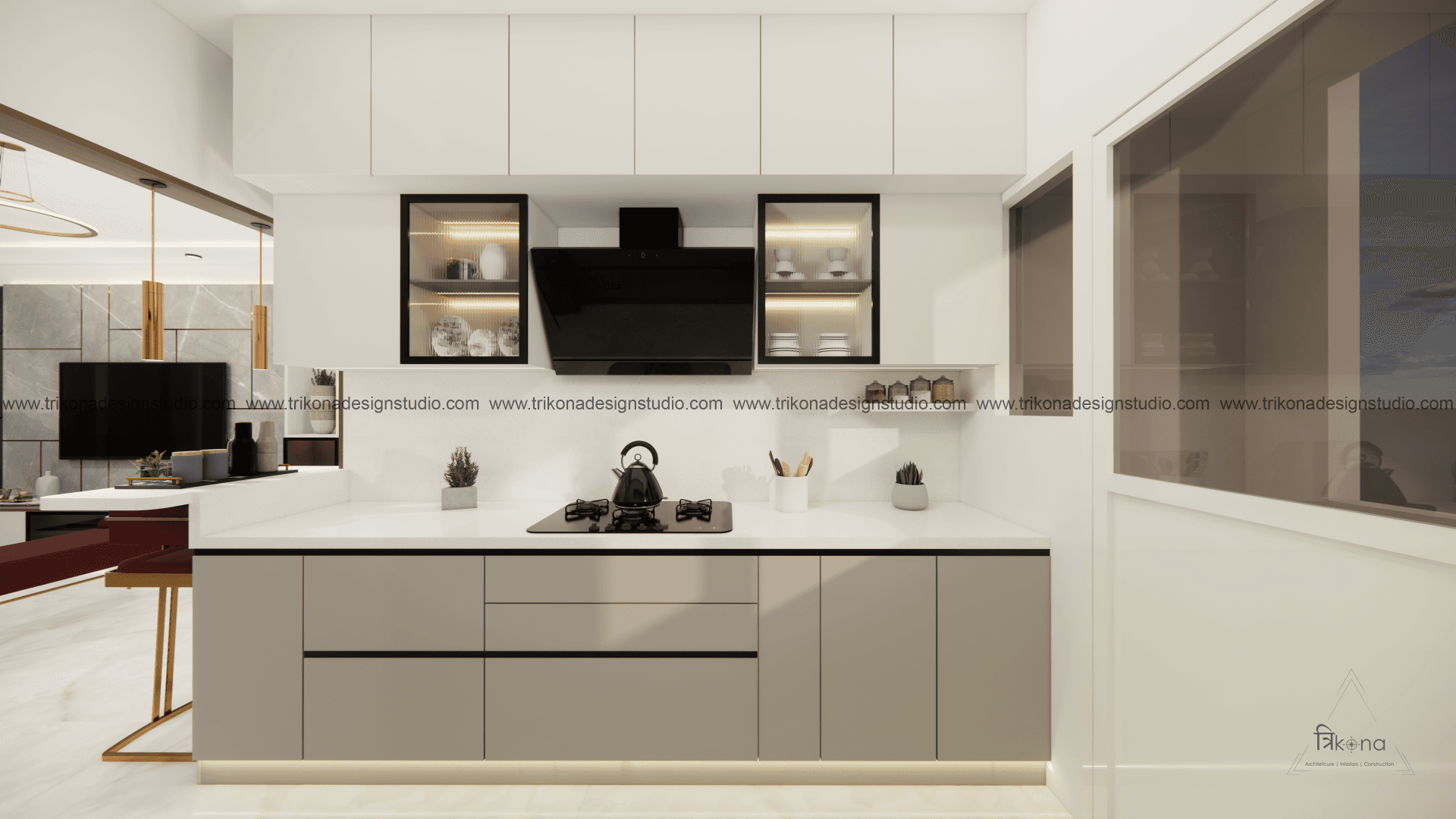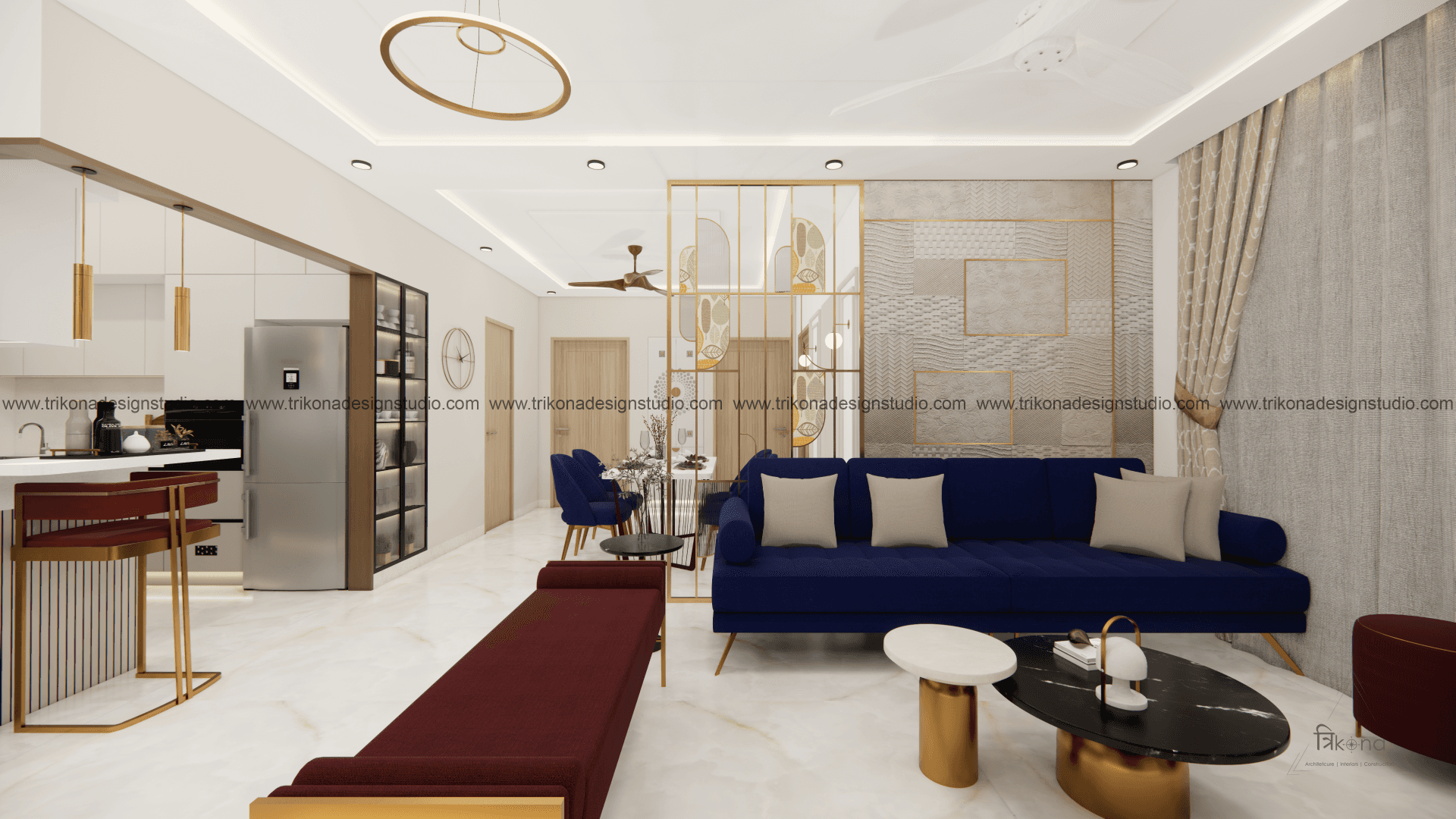 A luxurious 3-bedroom apartment in Bangalore where every corner exudes sophistication. The entrance boasts a stunning statement wall with louvered and rose gold mirror paneling, housing a serene Buddha idol. In the living room, a sleek TV unit and semi-open storage add modern flair. The kitchen dazzles in gray tones with a sleek crockery unit in fluted glass. Each bedroom is a masterpiece - from the kids' room with textured waves to the guest room's smart storage solutions, to the master bedroom's olive green accents and versatile wardrobe design. Welcome to a realm of timeless elegance at Modern Mirage.