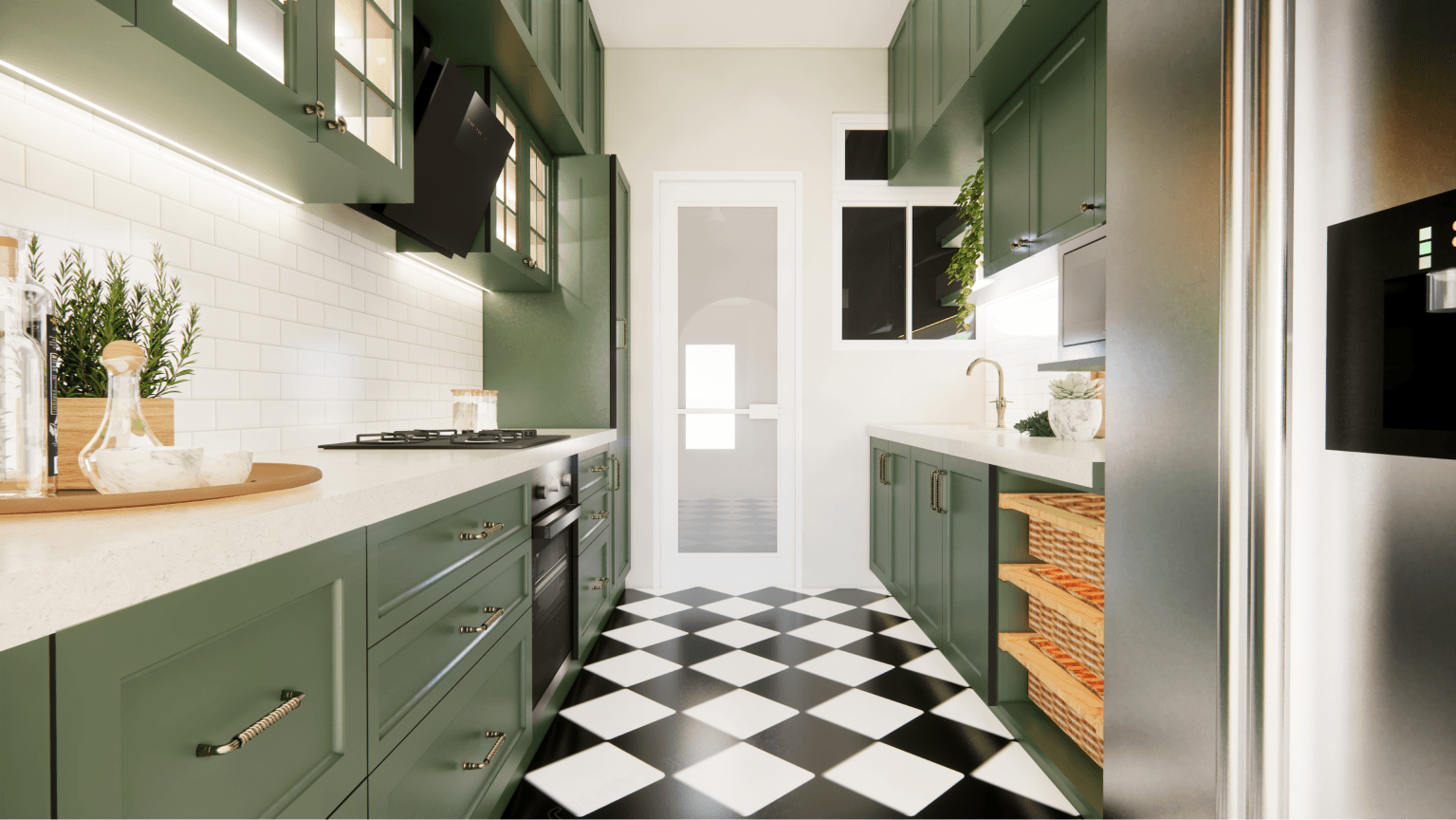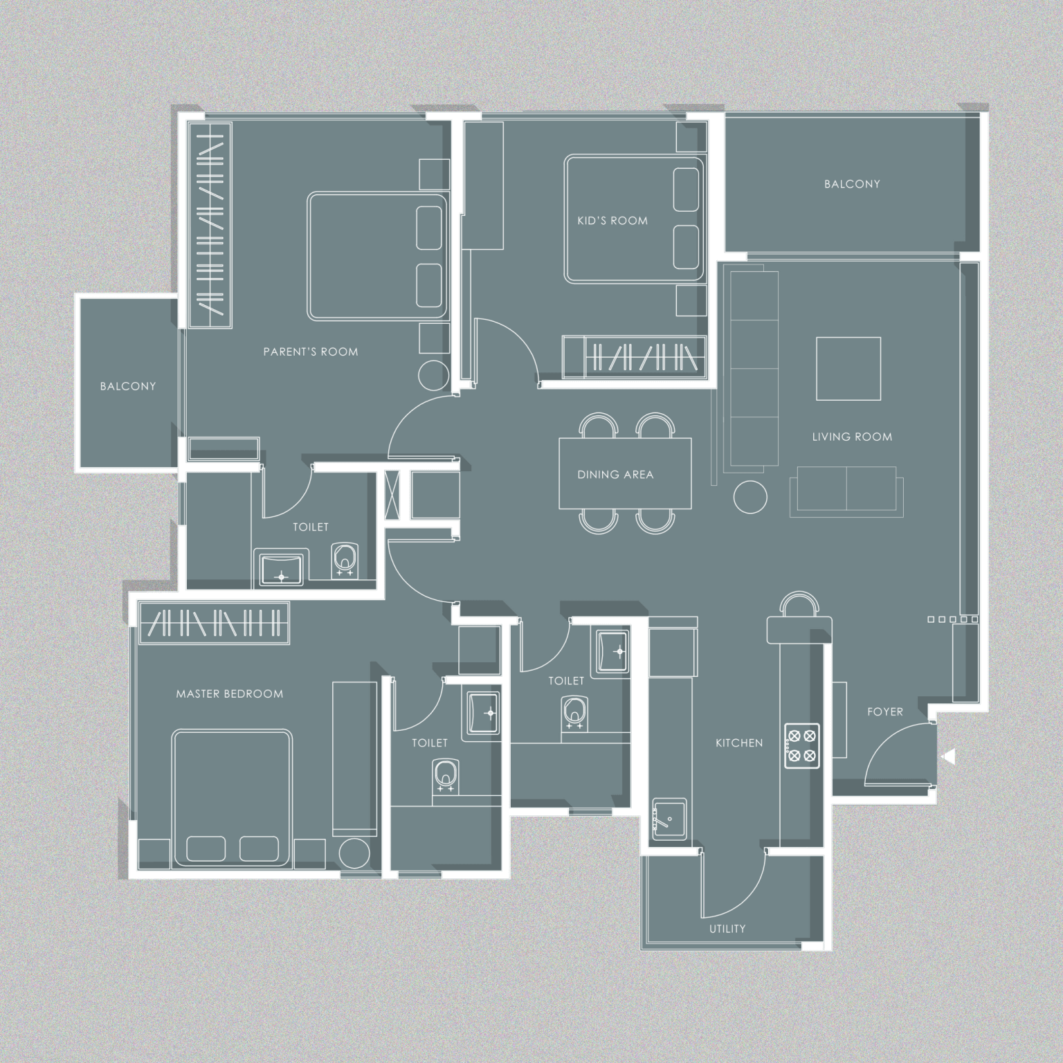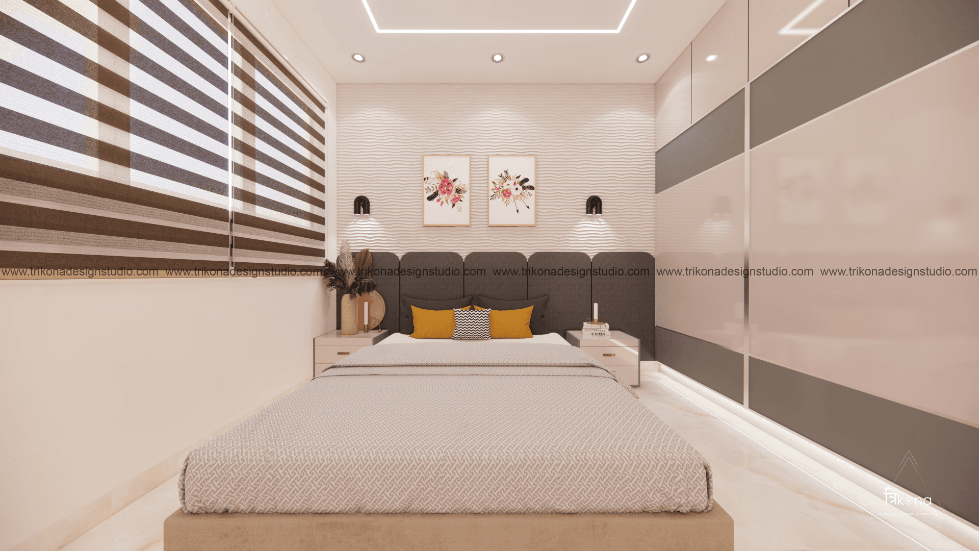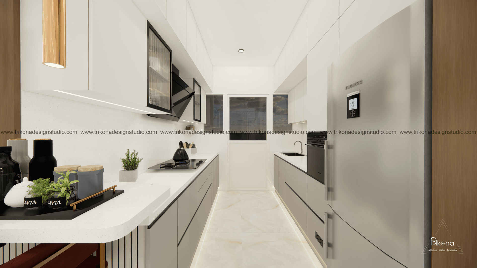 A luxurious 3-bedroom apartment in Bangalore where every corner exudes sophistication. The entrance boasts a stunning statement wall with louvered and rose gold mirror paneling, housing a serene Buddha idol. In the living room, a sleek TV unit and semi-open storage add modern flair. The kitchen dazzles in gray tones with a sleek crockery unit in fluted glass. Each bedroom is a masterpiece - from the kids' room with textured waves to the guest room's smart storage solutions, to the master bedroom's olive green accents and versatile wardrobe design. Welcome to a realm of timeless elegance at Modern Mirage.