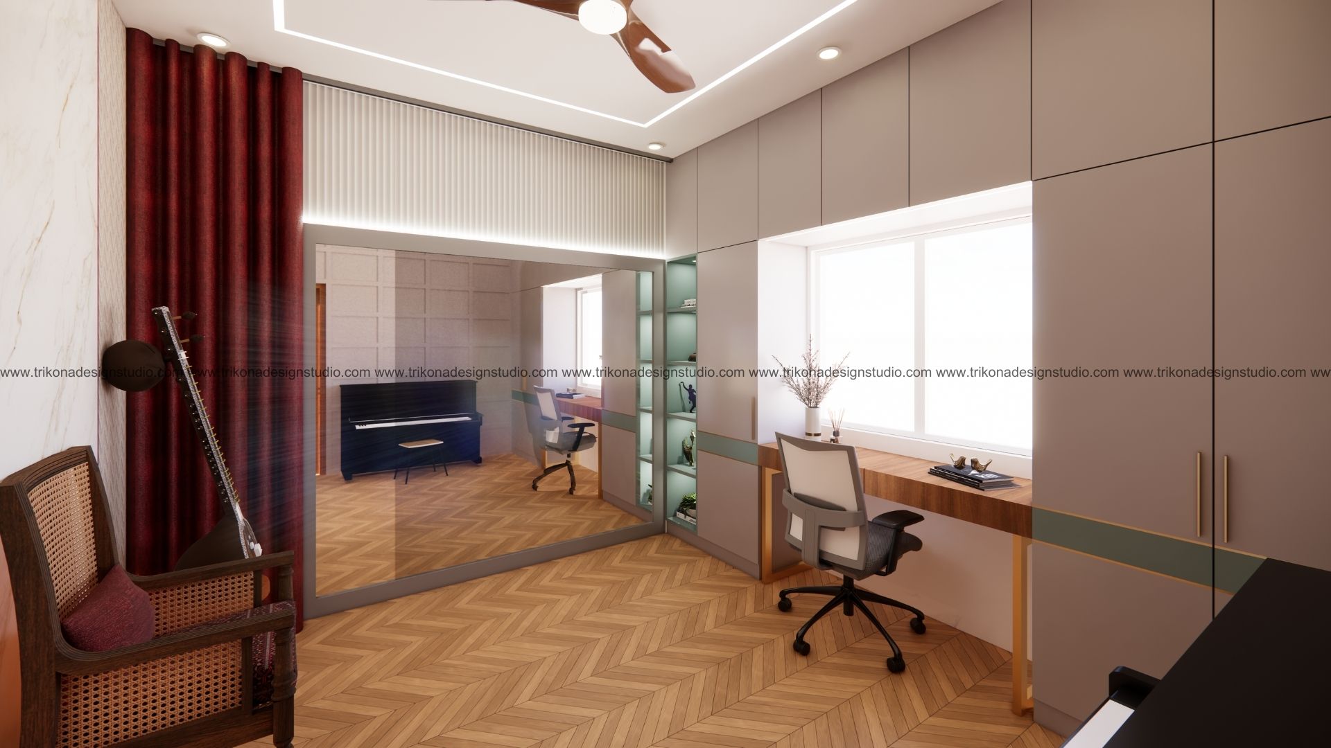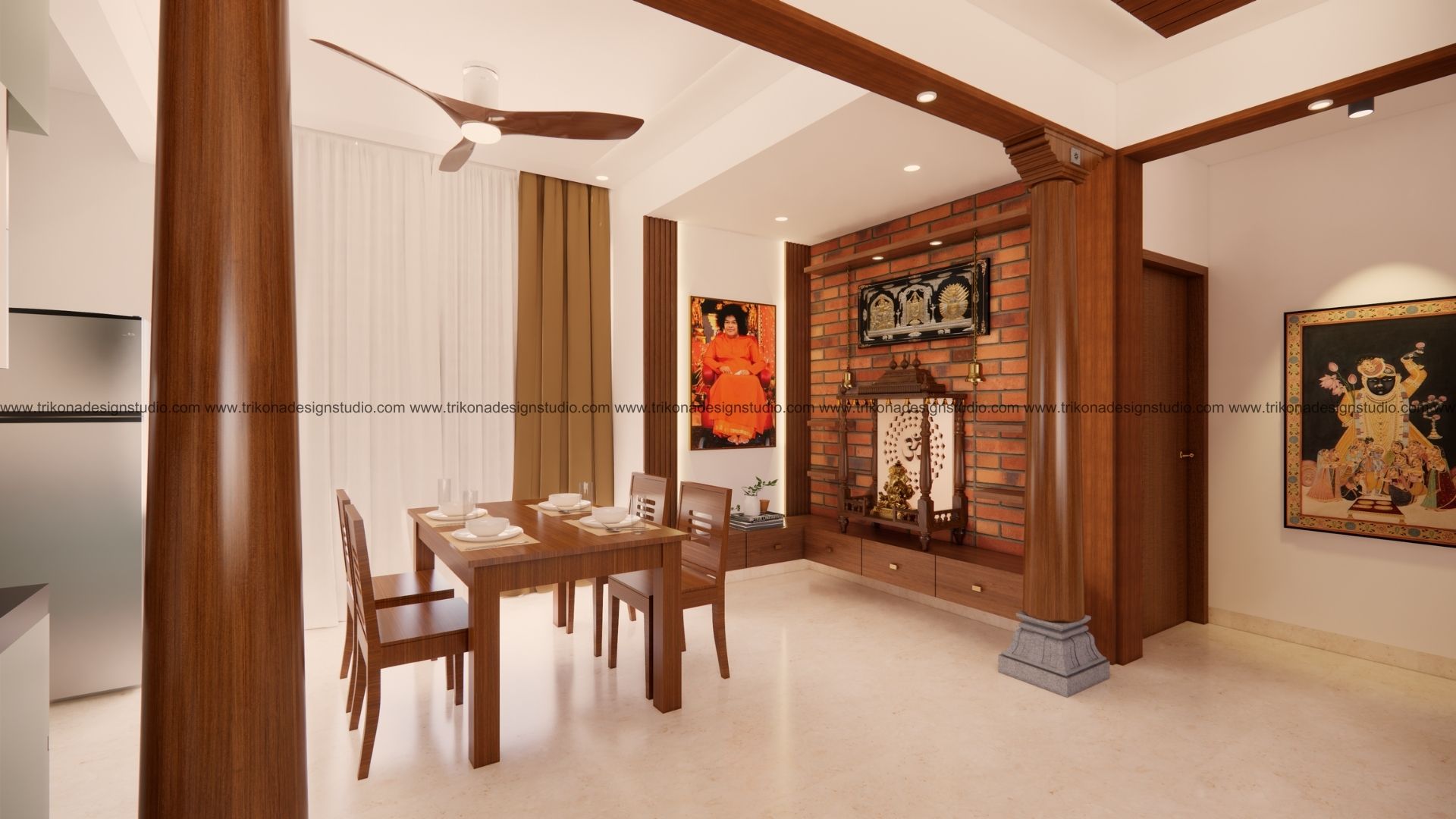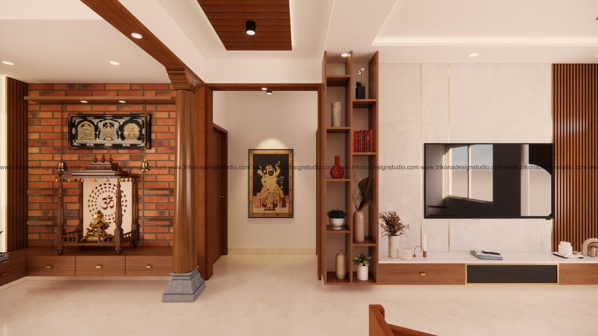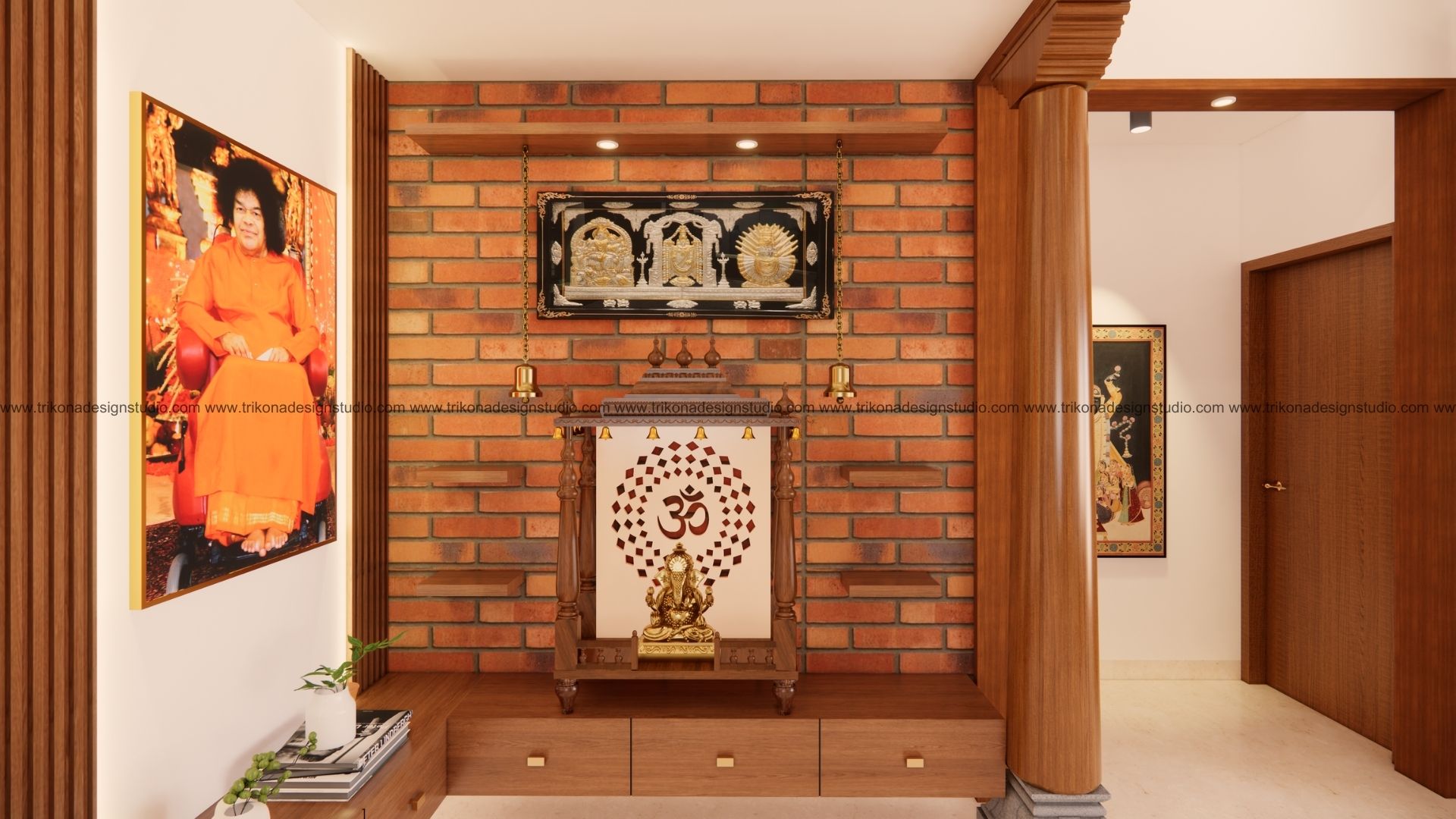A warm and grounded 3BHK apartment designed for a doctor and his wife, both deeply passionate about Indian classical music and dance. The home embraces earthy tones and natural textures, creating an atmosphere of comfort and timelessness. The central highlight is a brick-clad wall that forms a striking backdrop for the beautifully crafted pooja unit—an area that radiates peace and devotion. Adding to the charm, a pair of elegant teakwood columns subtly demarcates the living area from the pooja and dining spaces, lending both structure and character. This home is a reflection of tradition meeting everyday liveability, where art and spirituality flow seamlessly into daily life.