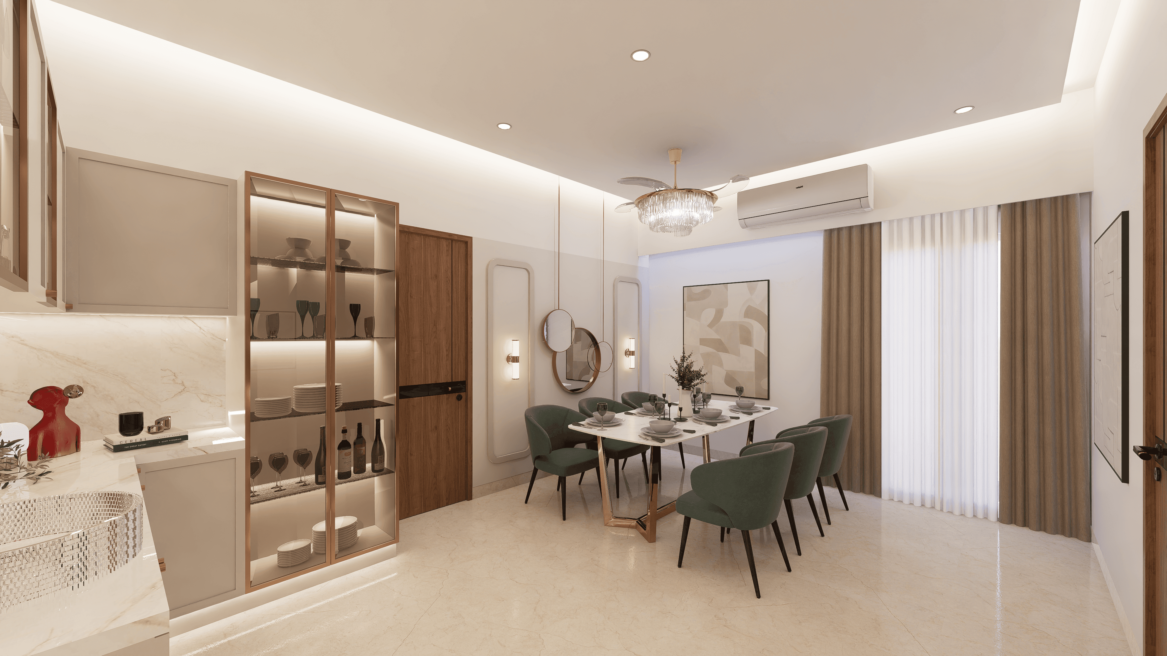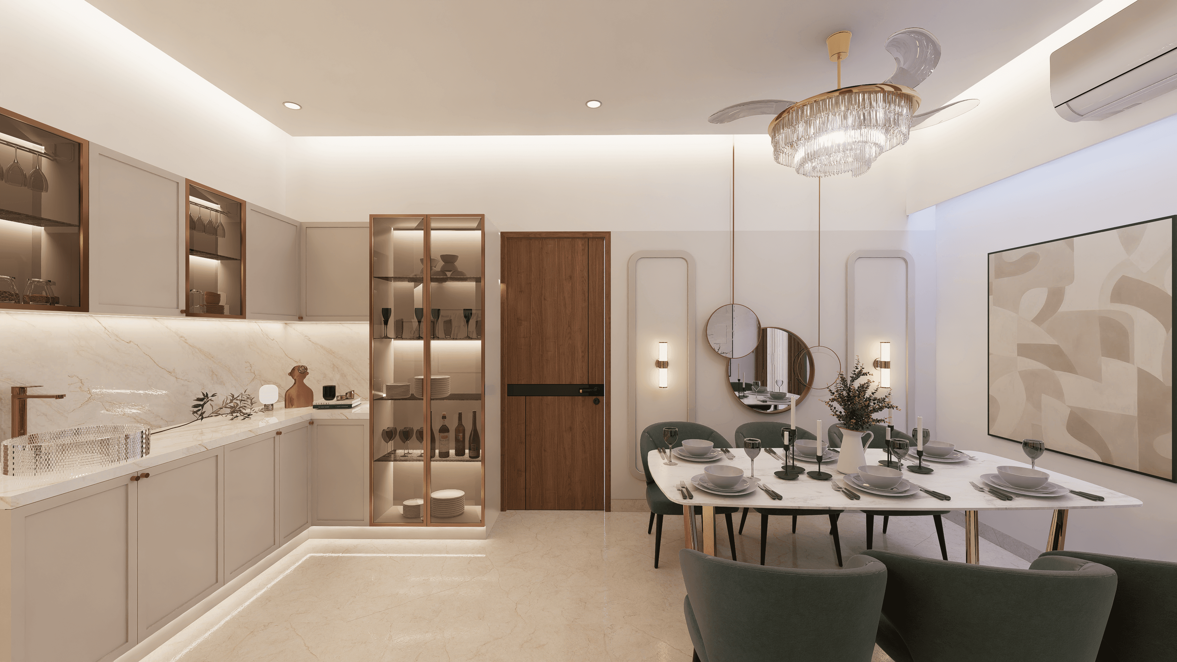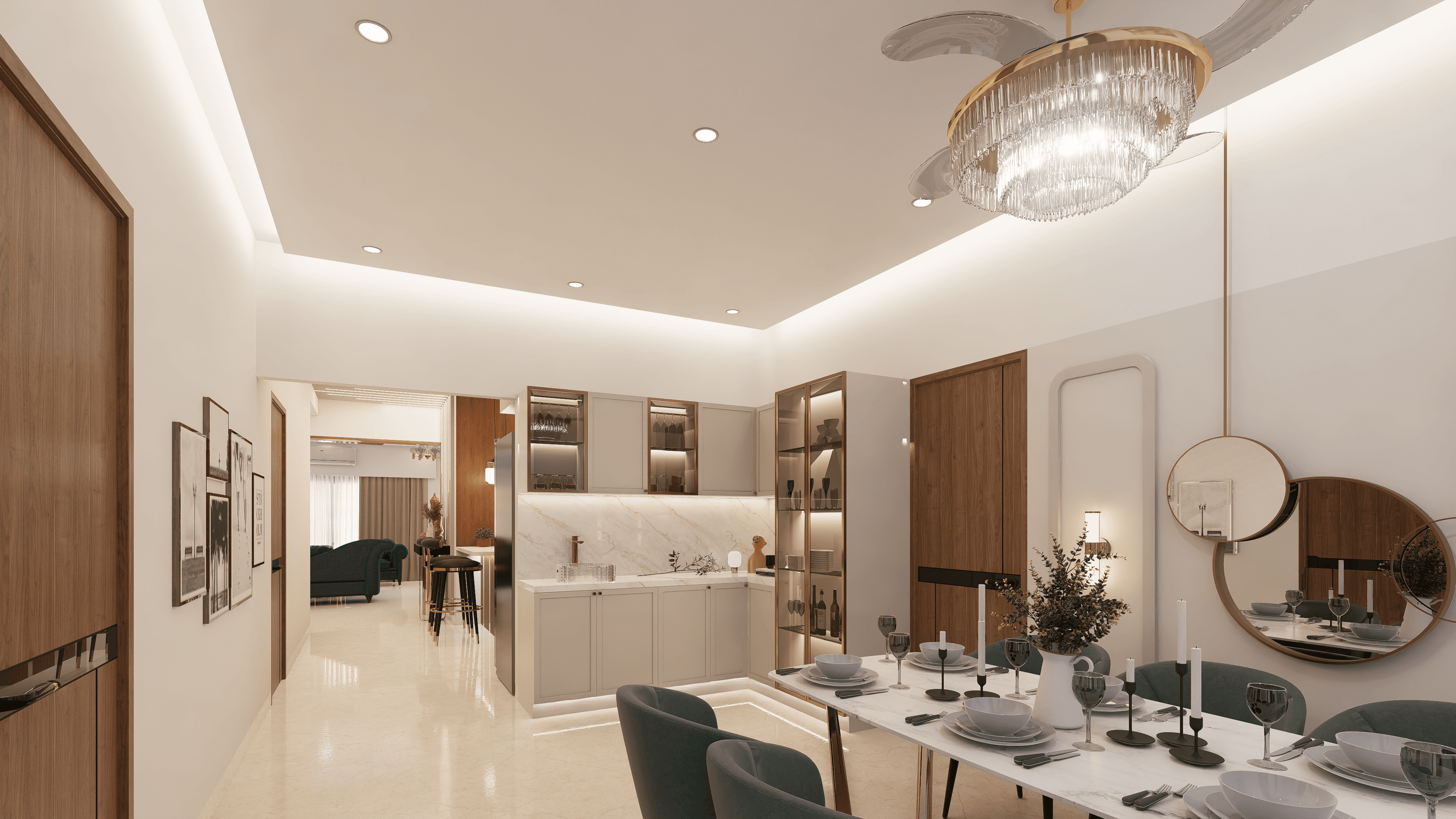 The living and dining spaces seamlessly blend bespoke furniture and curated materials, creating a harmonious flow throughout the home. Designed to reflect comfort and sophistication, this project highlights our expertise in crafting interiors that resonate with individuality and style.
