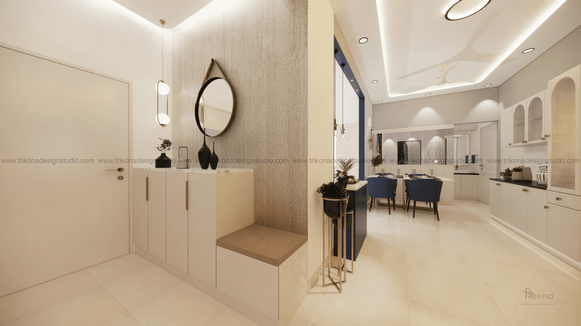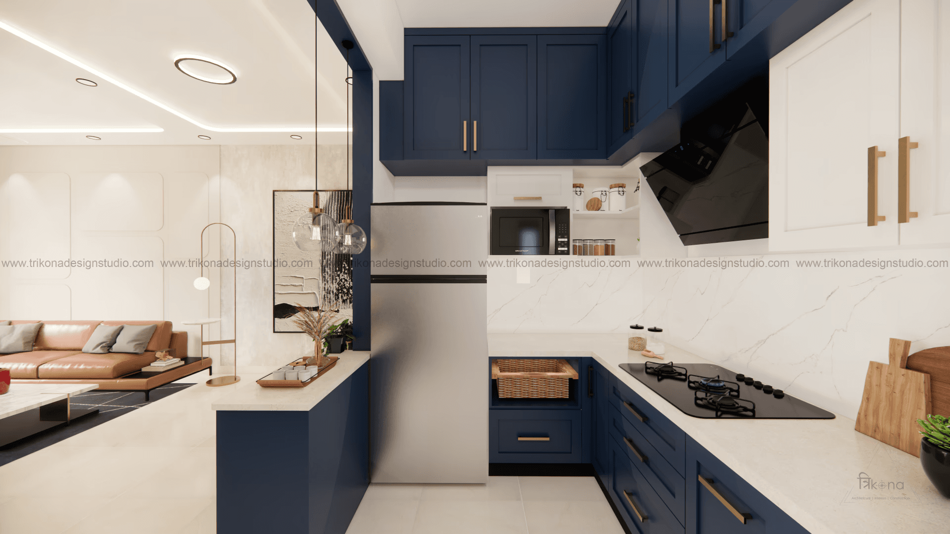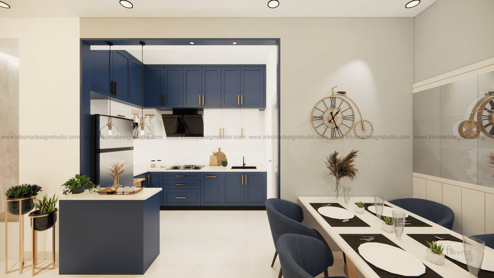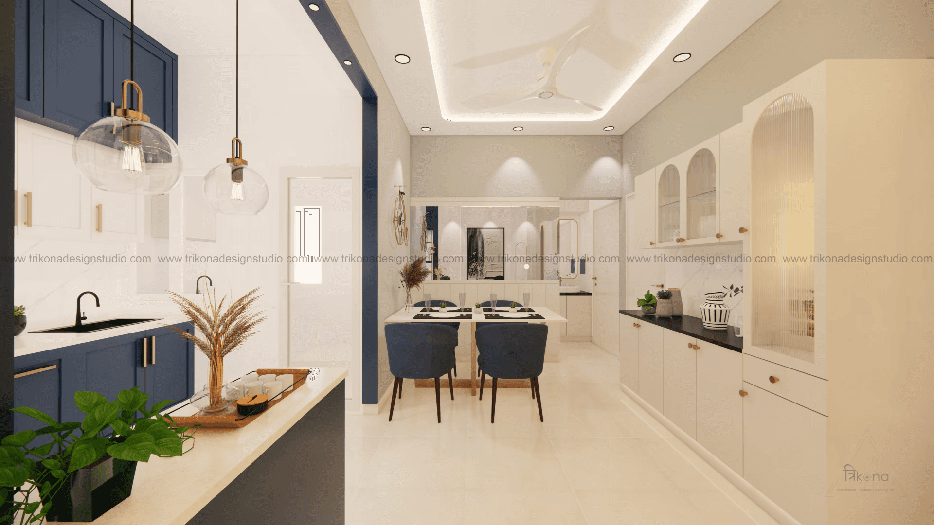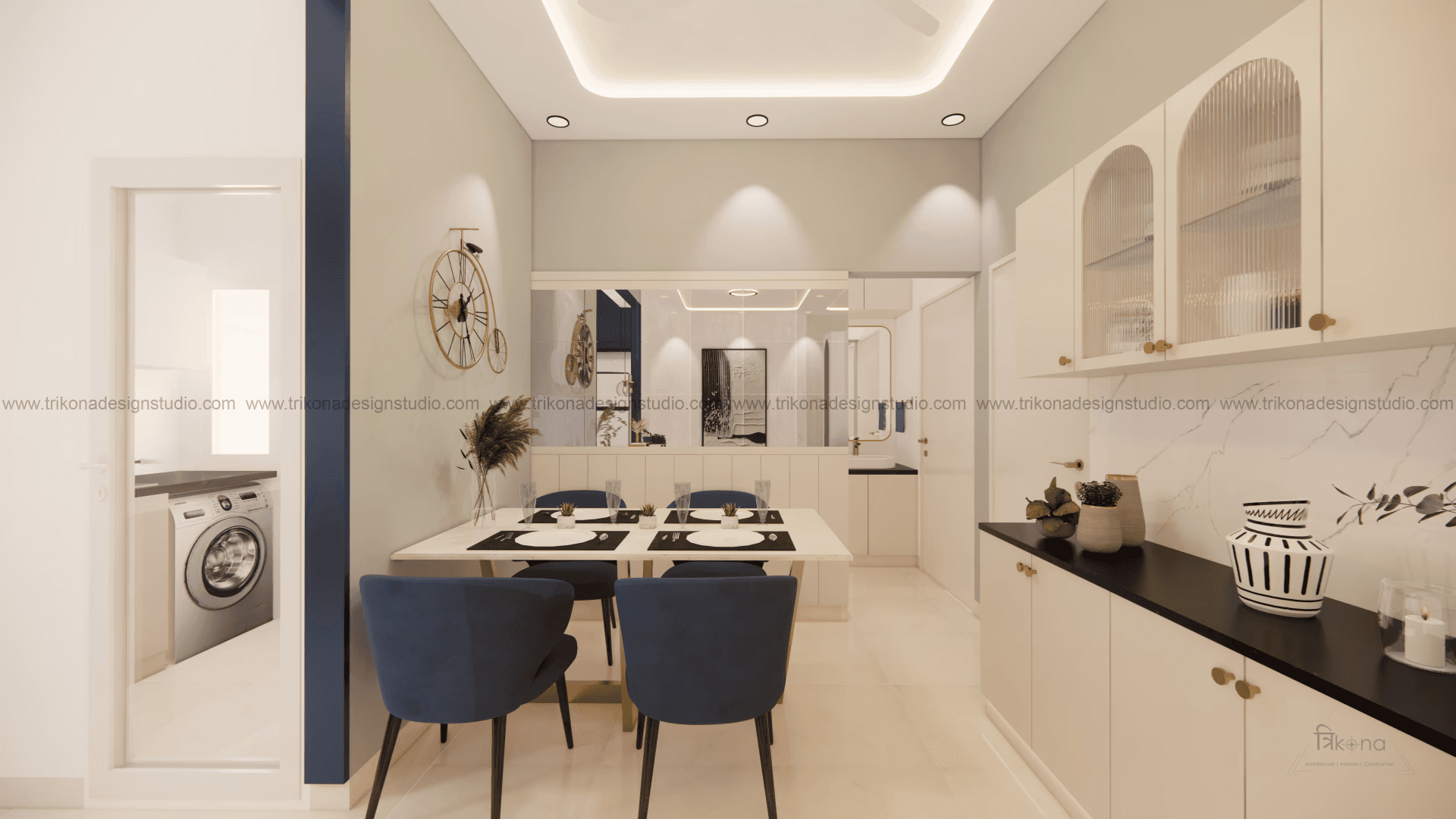Welcome to our stunning apartment in Bangalore, where minimal and French-style interiors come together to create a harmonious living space. The entire house is designed to be light and airy, evoking a sense of tranquility and openness. In the living room, an off-white wall panel with rounded rectangles creates a unique pattern, enhancing the space's visual appeal. The T.V unit doubles as an altar on, providing a serene focal point. Step into the beautiful, blue French country-style kitchen, finished in P.U., and be captivated by its elegant charm. The crockery cum pooja unit features three arches with fluted glass on its shutters, adding a touch of sophistication and functionality. Retreat to the master bedroom, adorned with earth palette tones, emanating warmth and a welcoming ambiance. A capsule mirror on one of its sides adds an artistic touch. Experience the perfect blend of minimalism and French style in our project, aptly named “French Flair”.