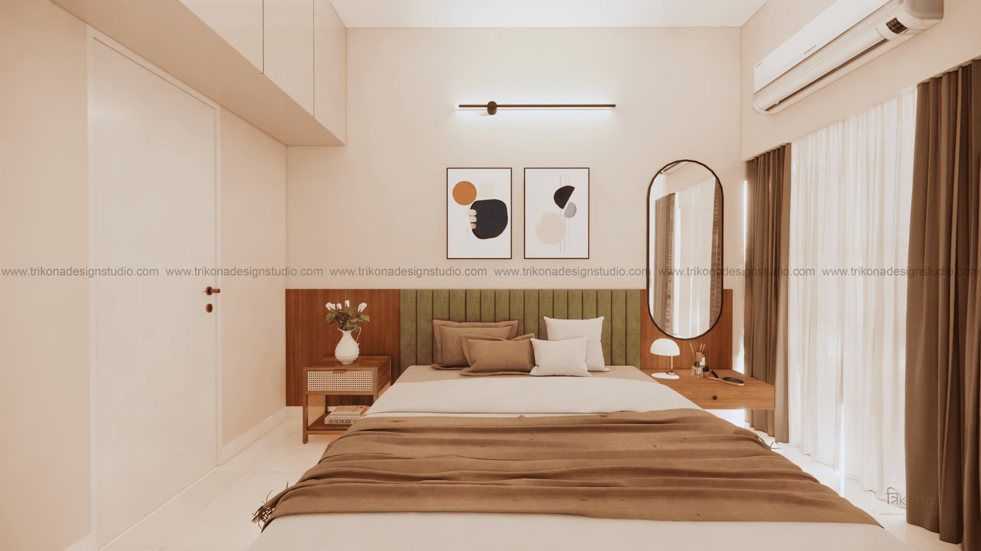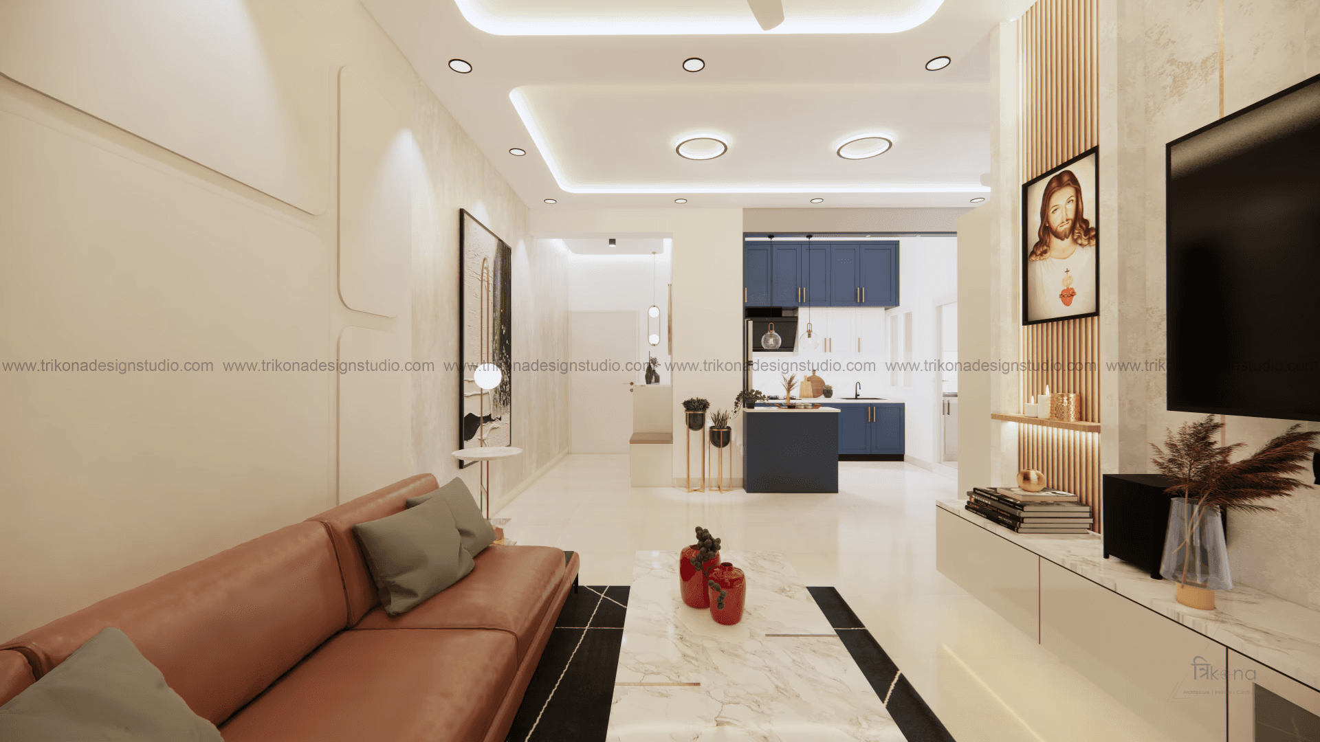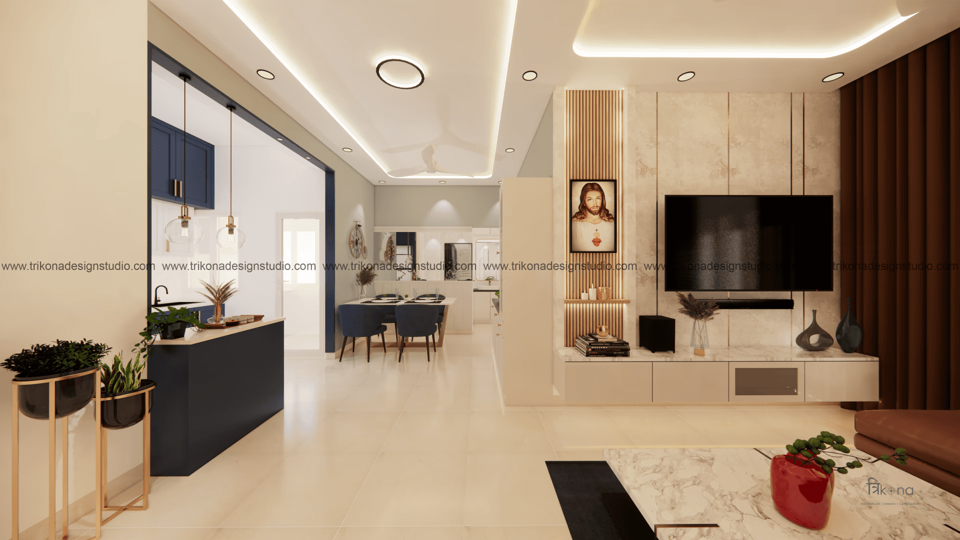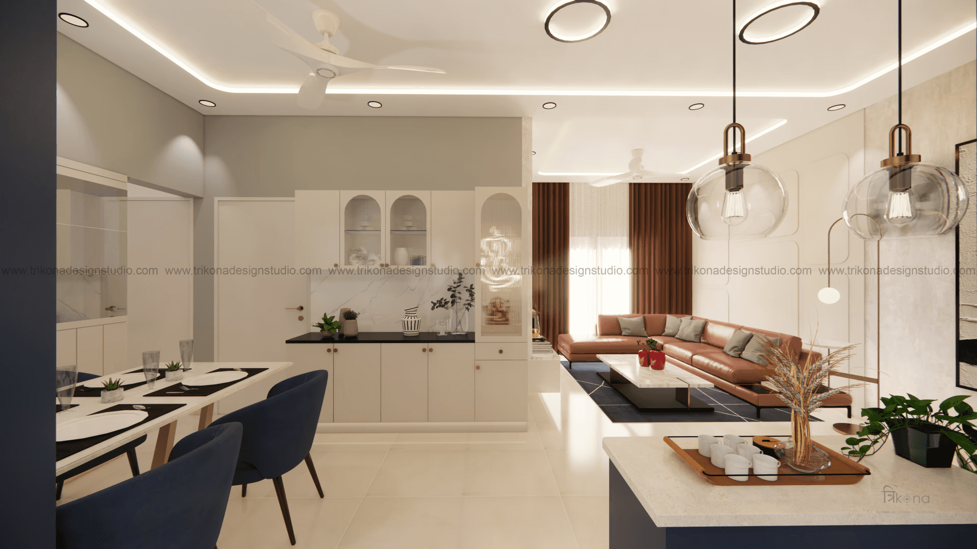 Welcome to our stunning apartment in Bangalore, where minimal and French-style interiors come together to create a harmonious living space. The entire house is designed to be light and airy, evoking a sense of tranquility and openness. In the living room, an off-white wall panel with rounded rectangles creates a unique pattern, enhancing the space's visual appeal. The T.V unit doubles as an altar on, providing a serene focal point. Step into the beautiful, blue French country-style kitchen, finished in P.U., and be captivated by its elegant charm. The crockery cum pooja unit features three arches with fluted glass on its shutters, adding a touch of sophistication and functionality. Retreat to the master bedroom, adorned with earth palette tones, emanating warmth and a welcoming ambiance. A capsule mirror on one of its sides adds an artistic touch. Experience the perfect blend of minimalism and French style in our project, aptly named “French Flair”.