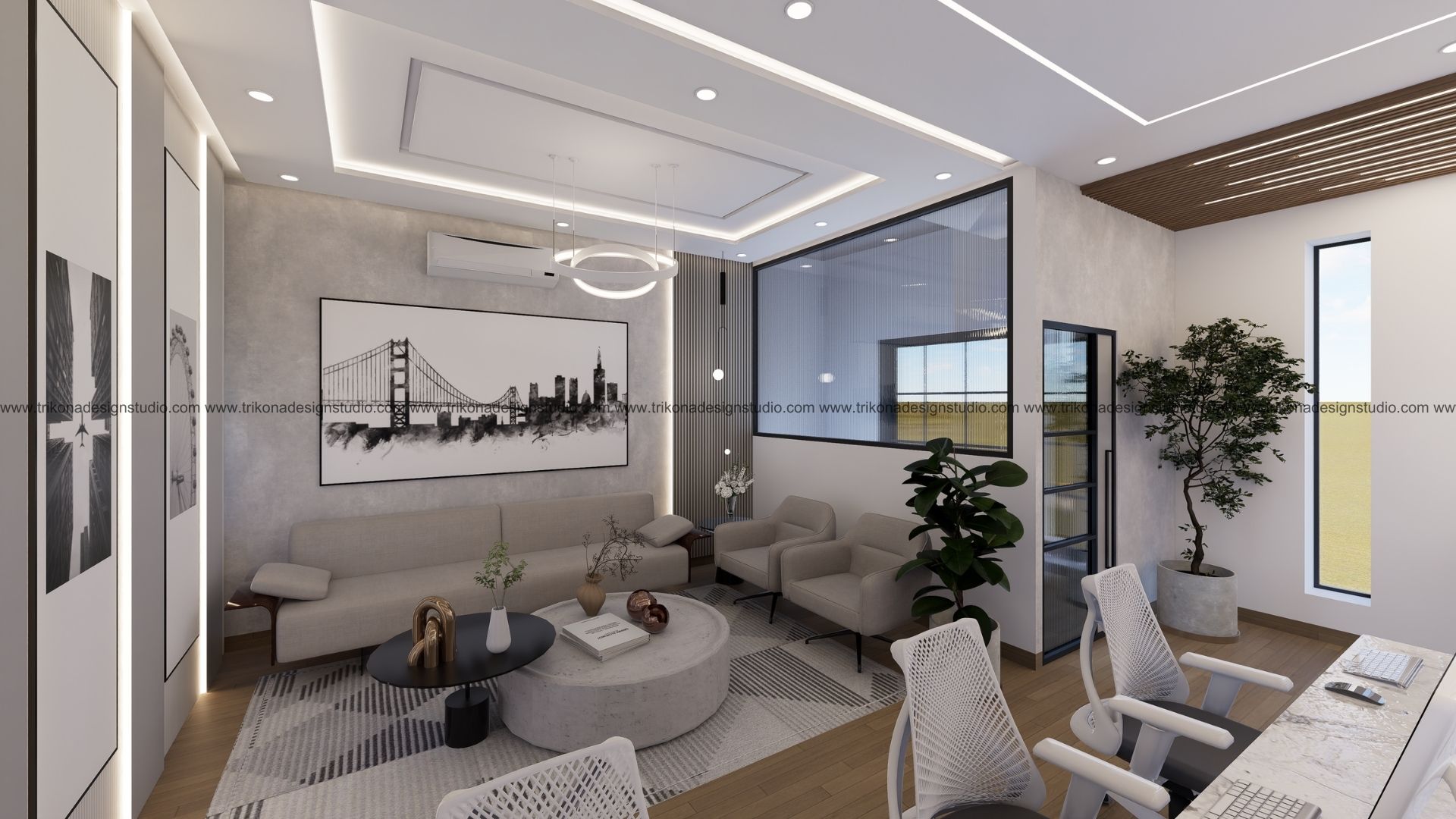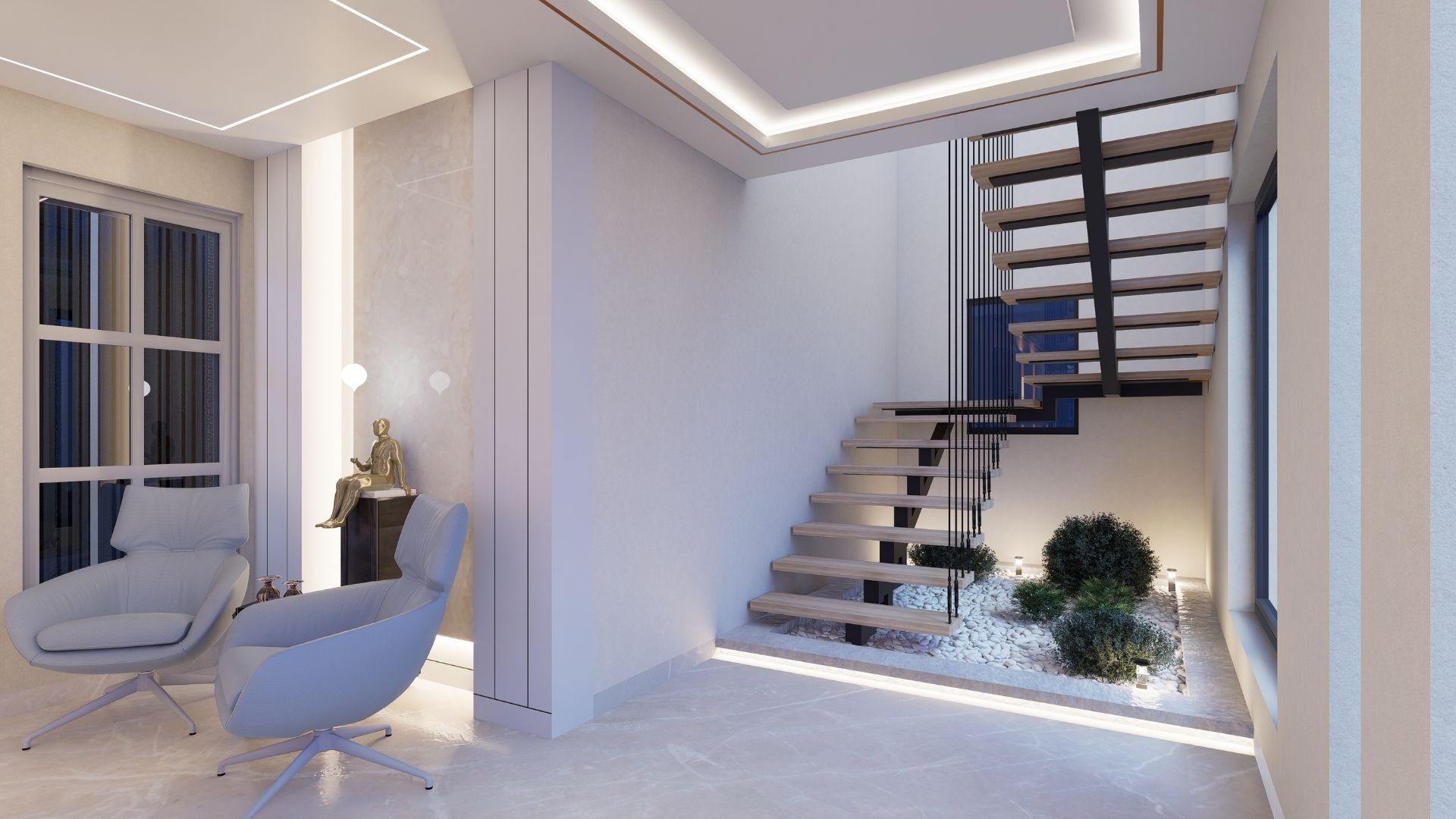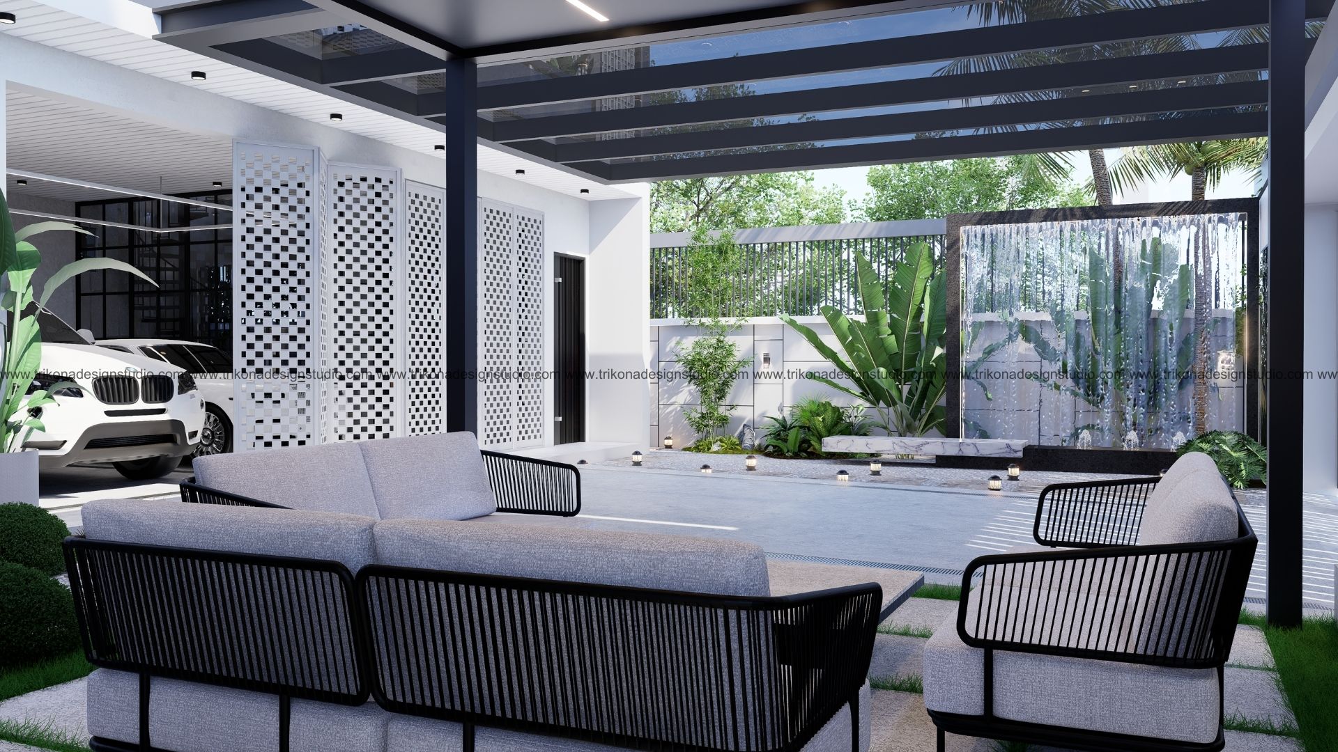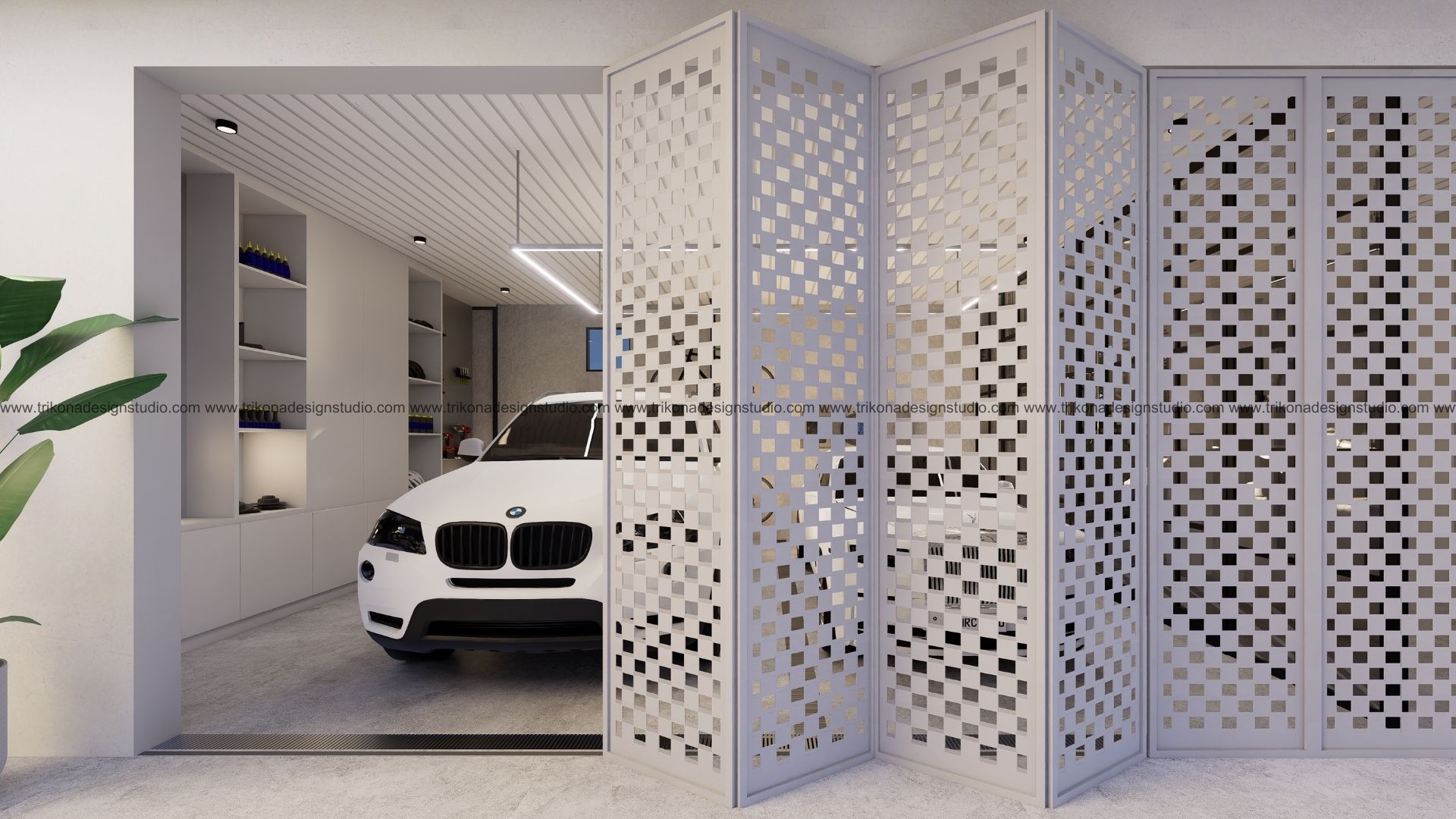 On the adjoining plot, a landscaped garden offers the family an outdoor haven, complemented by a closed garage for the client’s collection of luxury cars. Above it, the first floor houses his office, seamlessly integrated into the home’s design ethos. Bound together by an all-white palette and refined detailing, the villa and its landscaped extension form a cohesive estate—radiant, serene, and deeply personal.