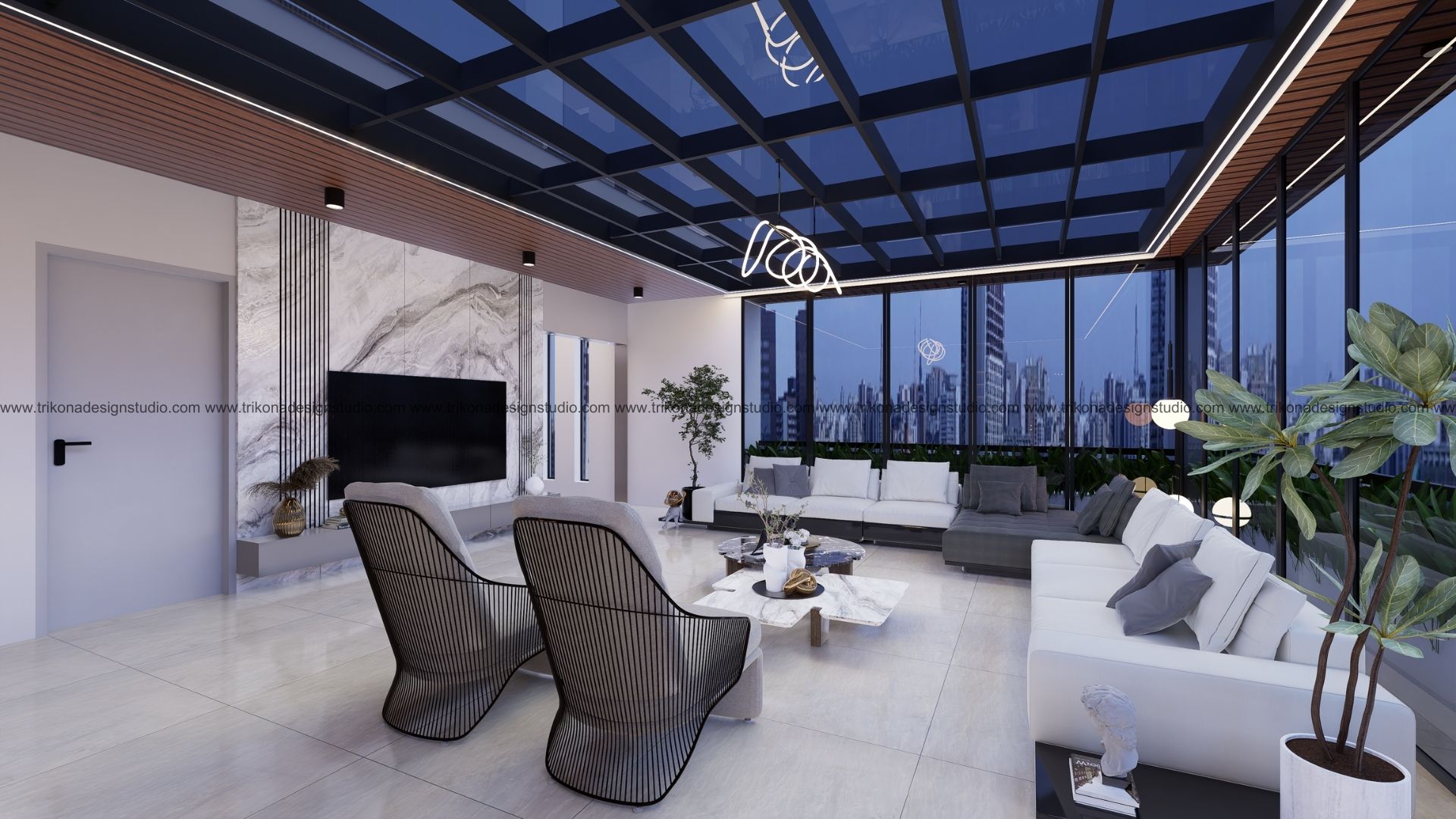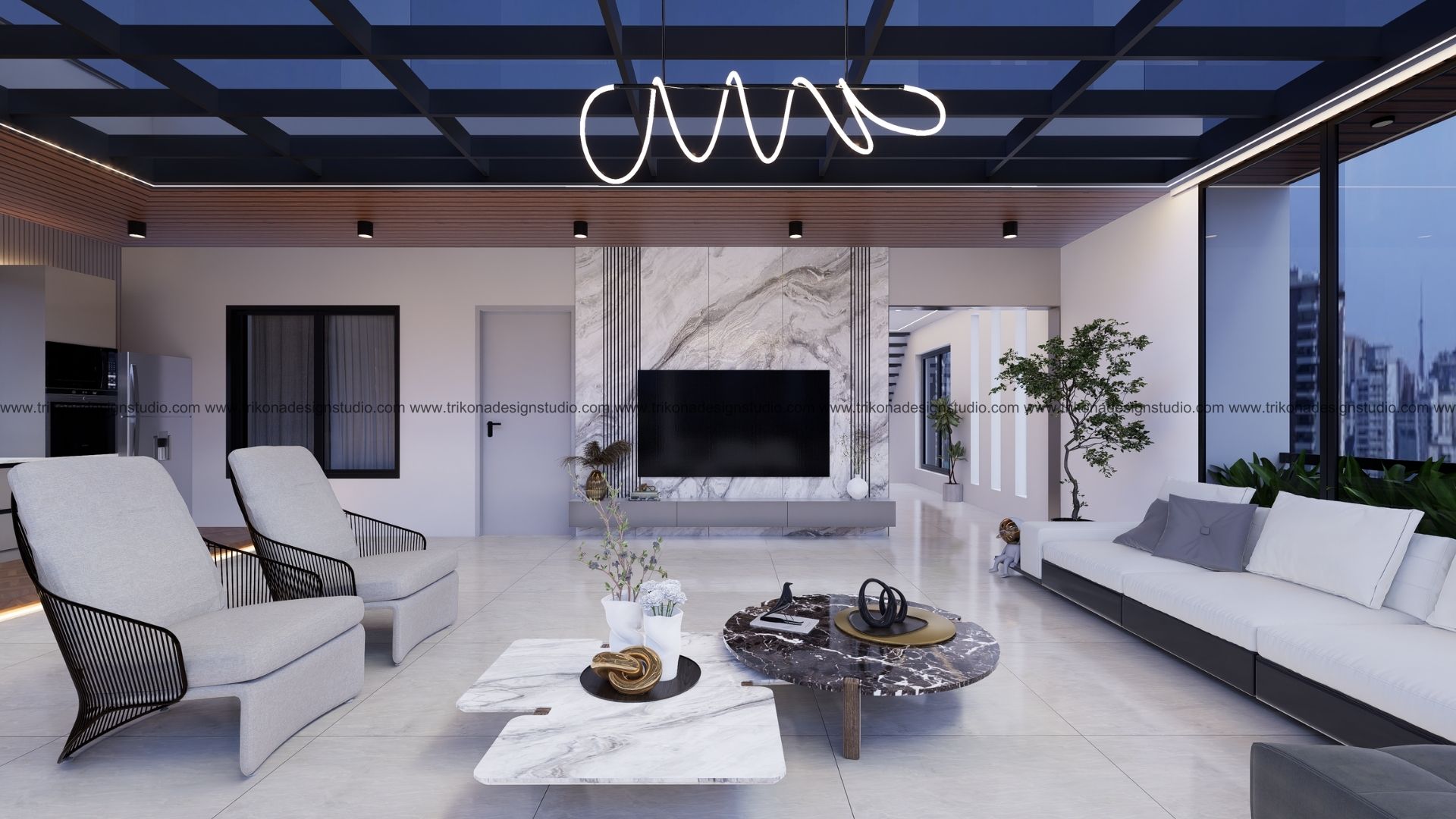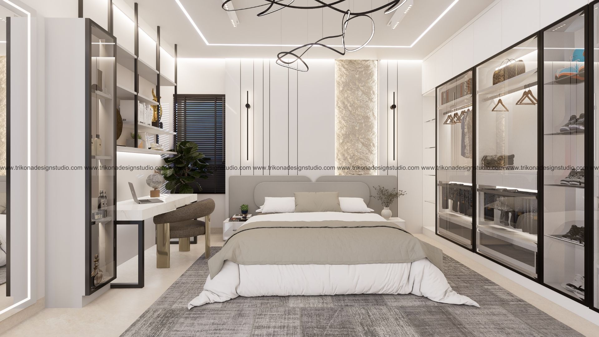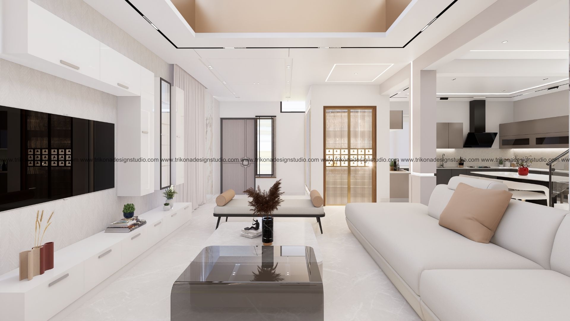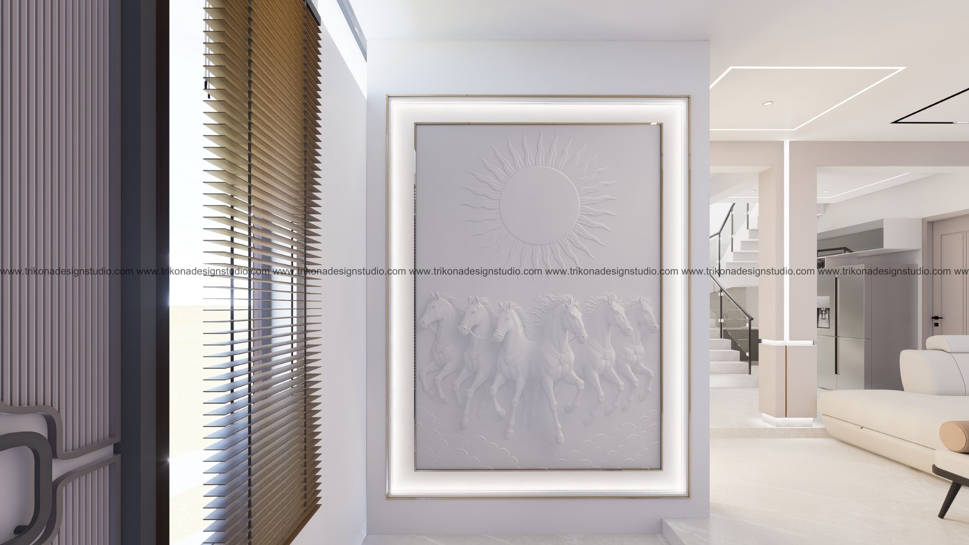 On the adjoining plot, a landscaped garden offers the family an outdoor haven, complemented by a closed garage for the client’s collection of luxury cars. Above it, the first floor houses his office, seamlessly integrated into the home’s design ethos. Bound together by an all-white palette and refined detailing, the villa and its landscaped extension form a cohesive estate—radiant, serene, and deeply personal.