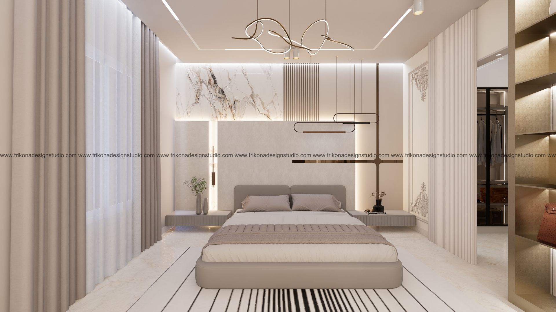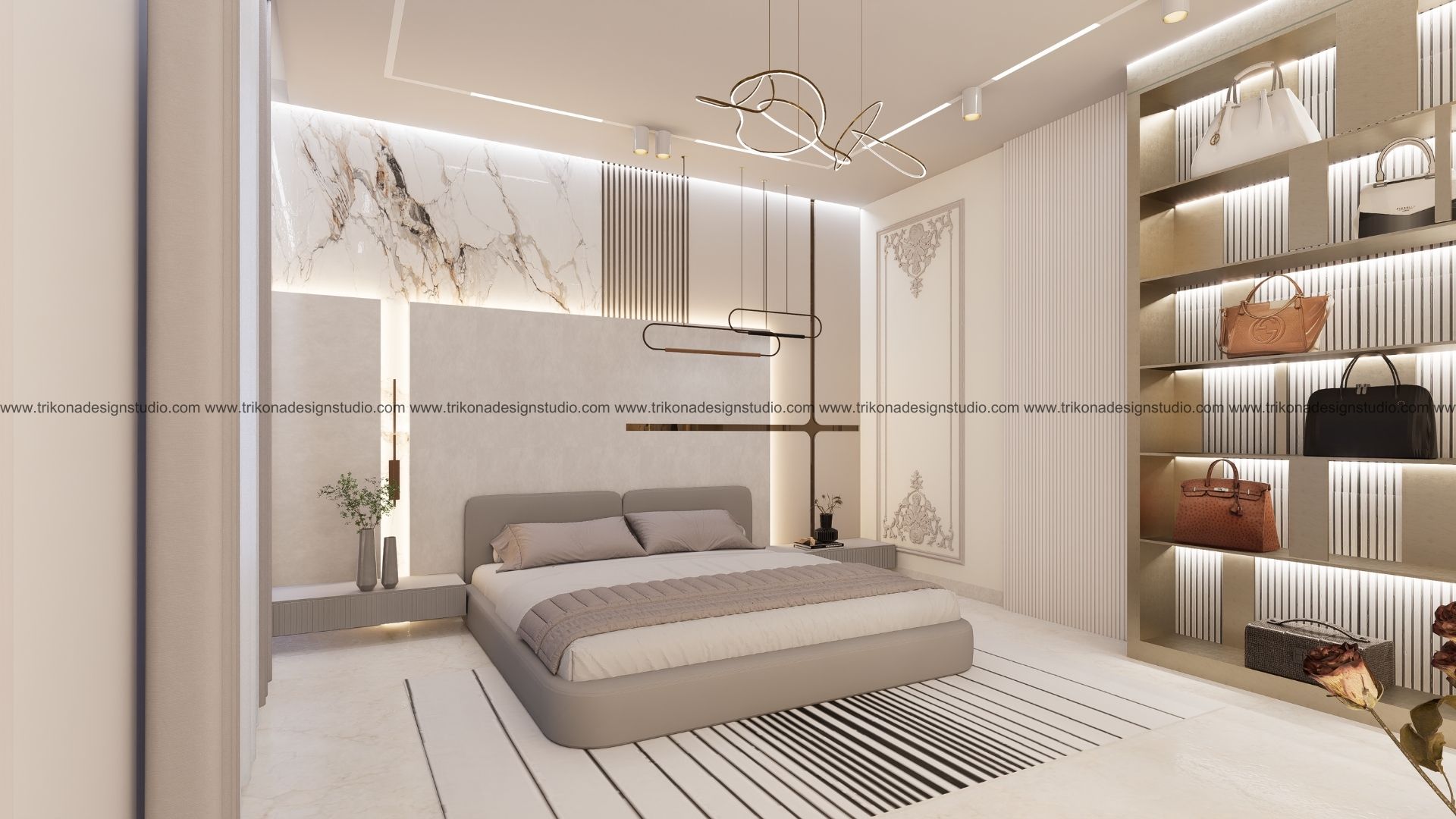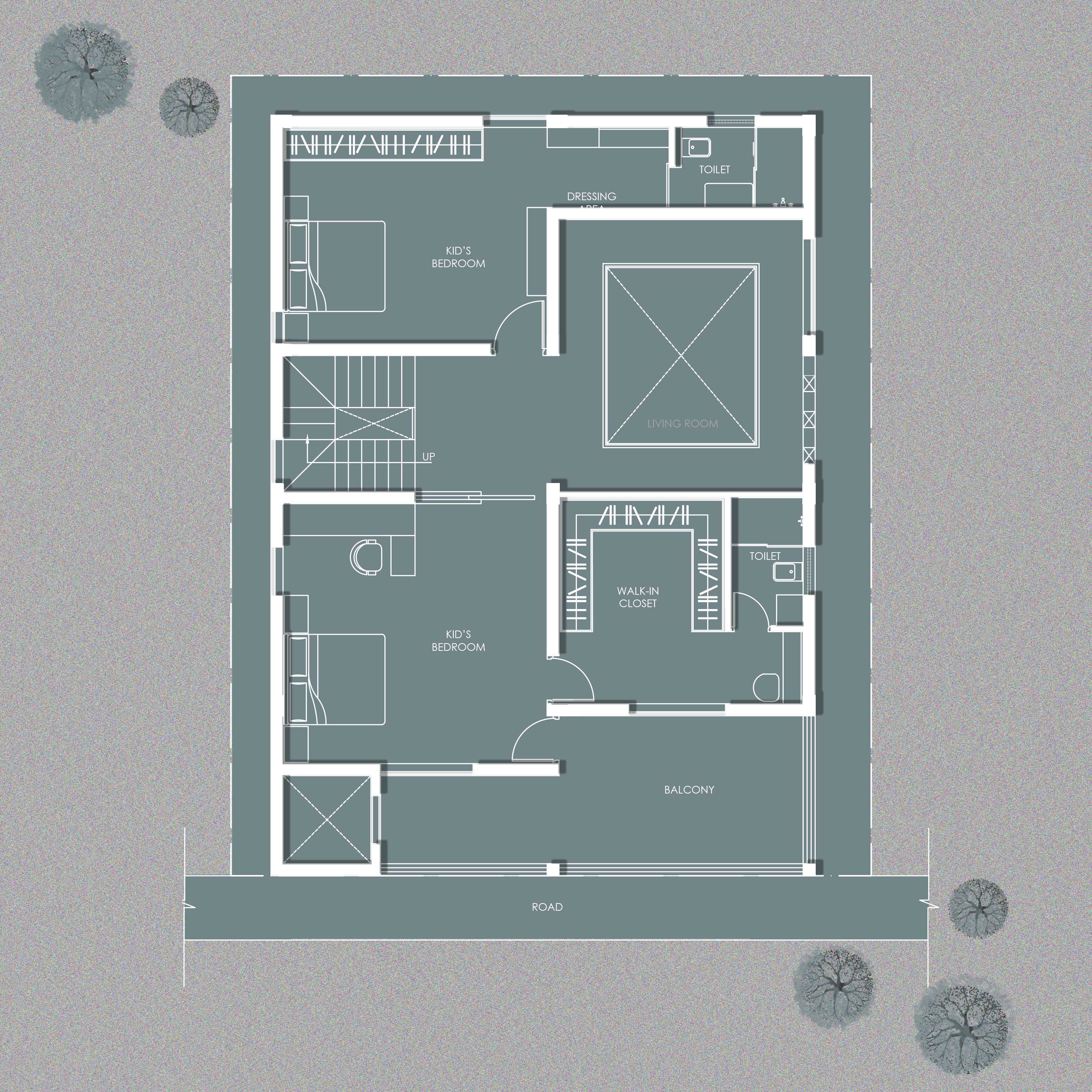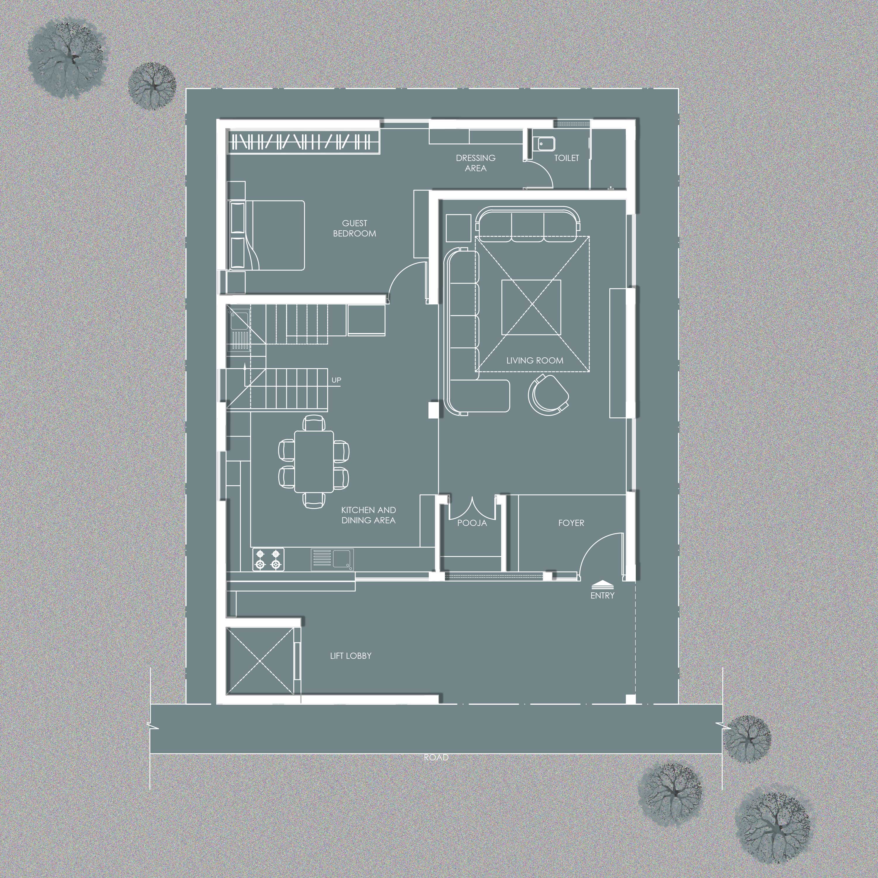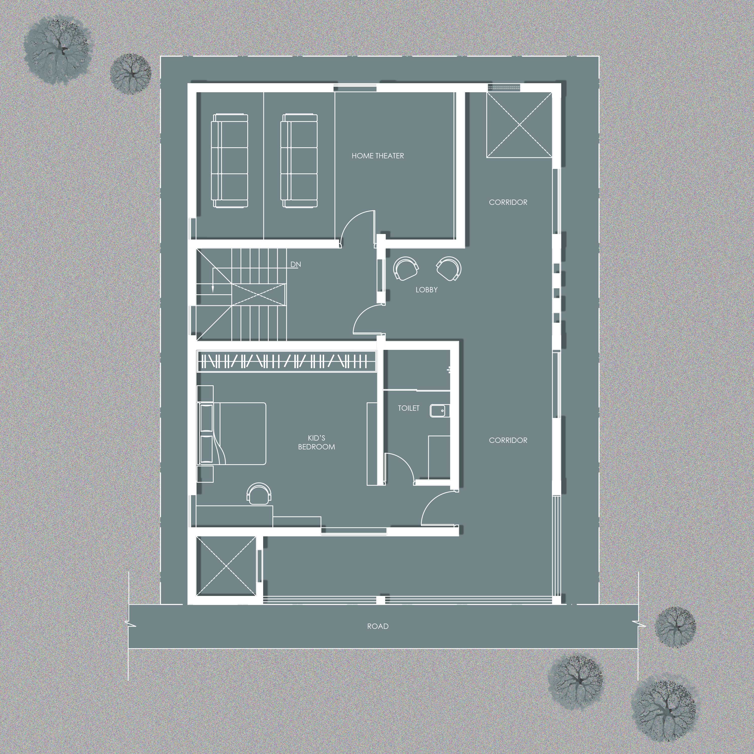 Spanning across two adjoining plots, this villa is envisioned as a sanctuary of sophistication where modern luxury meets timeless elegance. The primary residence rises ground plus three floors, with a foyer leading into a double-height living area that sets the tone for the home. The ground floor also accommodates a kitchen and guest bedroom, while the first floor is thoughtfully designed with two bedrooms for the client’s daughters. The second floor features a home theater, a corridor leading to the son’s bedroom, and spaces that bring the family together. At the top, the third floor unfolds into a private retreat with the master suite, a terrace, a kitchenette, laundry, and maid’s quarters—combining functionality with comfort.