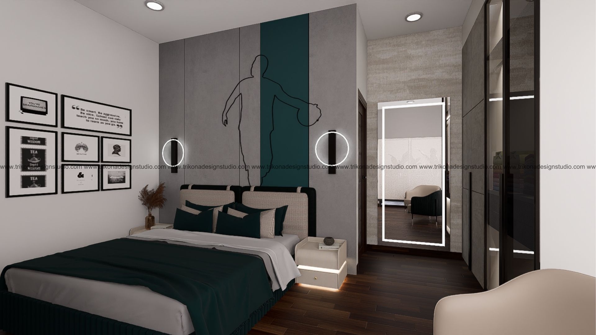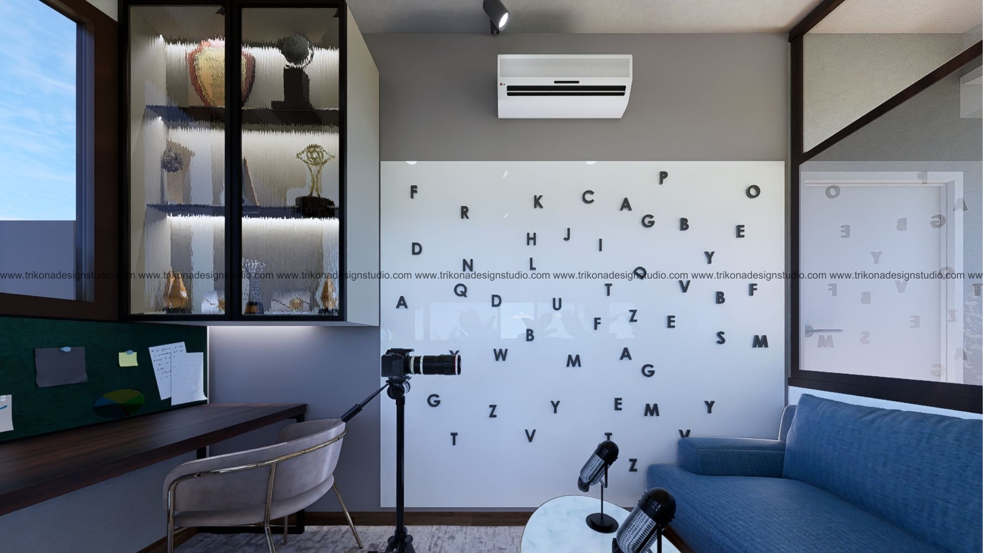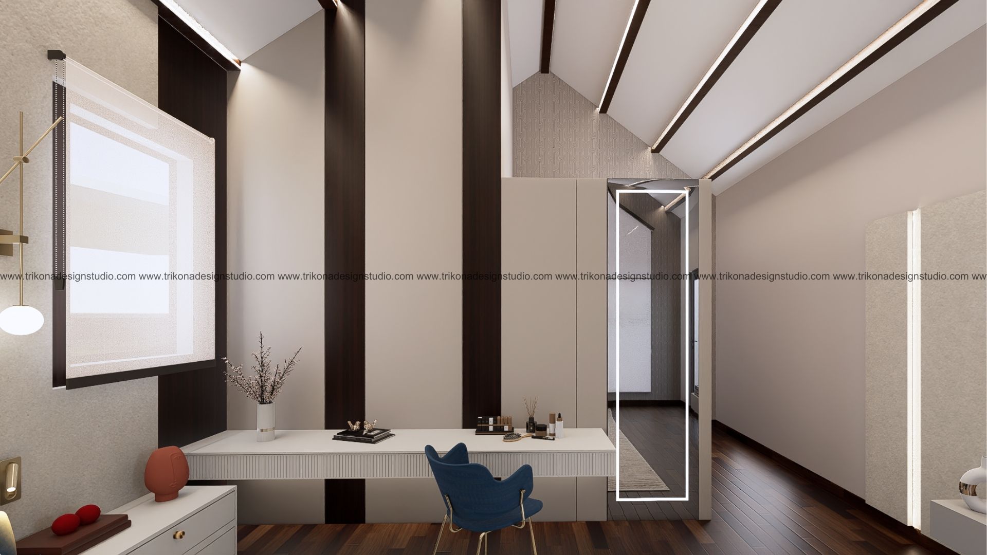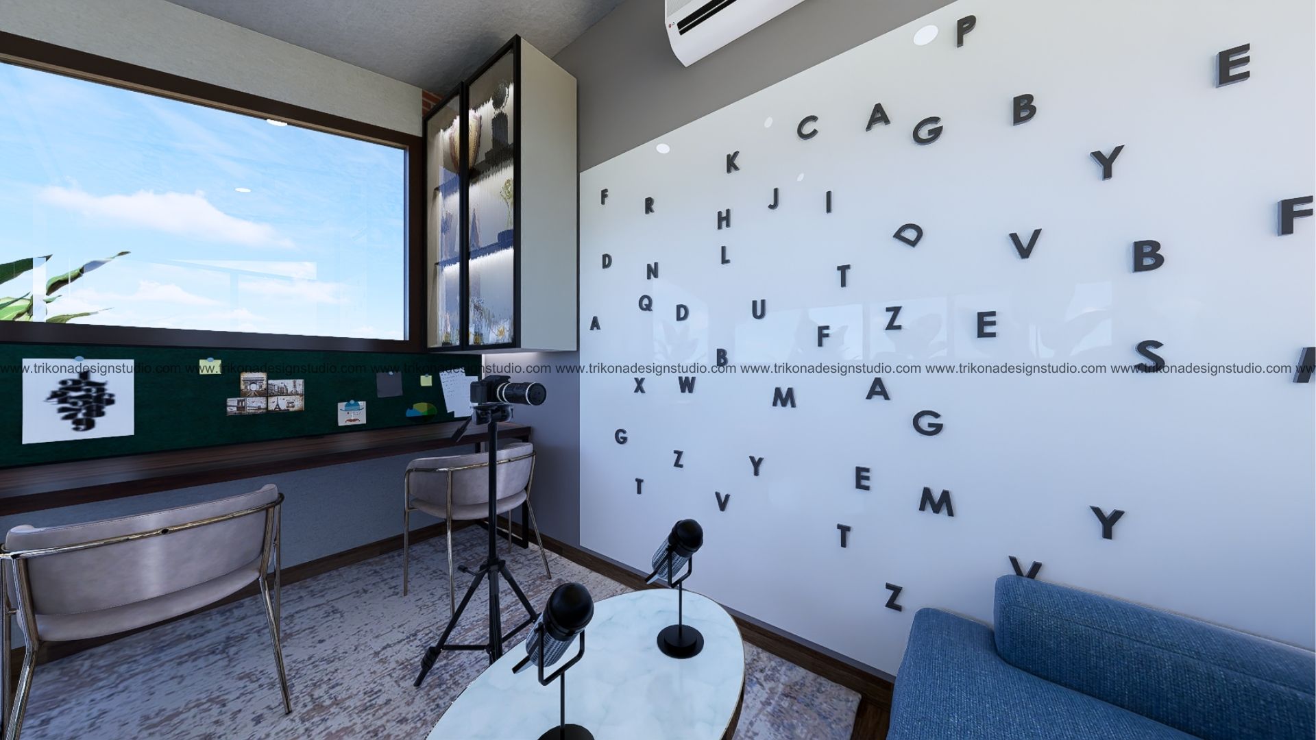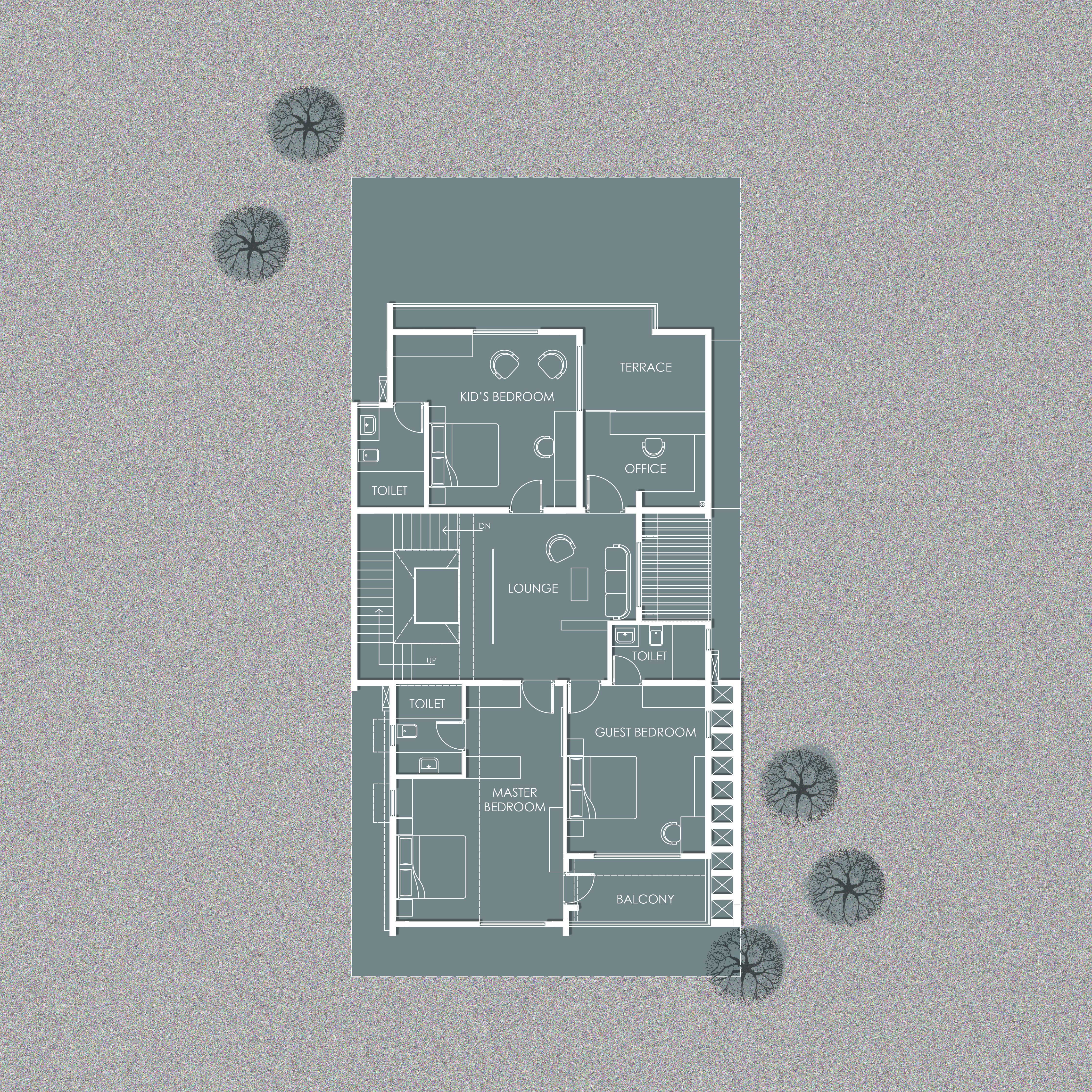 The first floor introduces a deeper layer of personality, with each bedroom defined by its own distinct character. The master suite, set beneath a slope-canopy roof, carries a sense of calm grandeur, while the son’s and guest bedrooms bring their own tailored moods. Rising above, the terrace transforms into a creative hub with a dedicated office and podcast studio—merging work, passion, and leisure.
