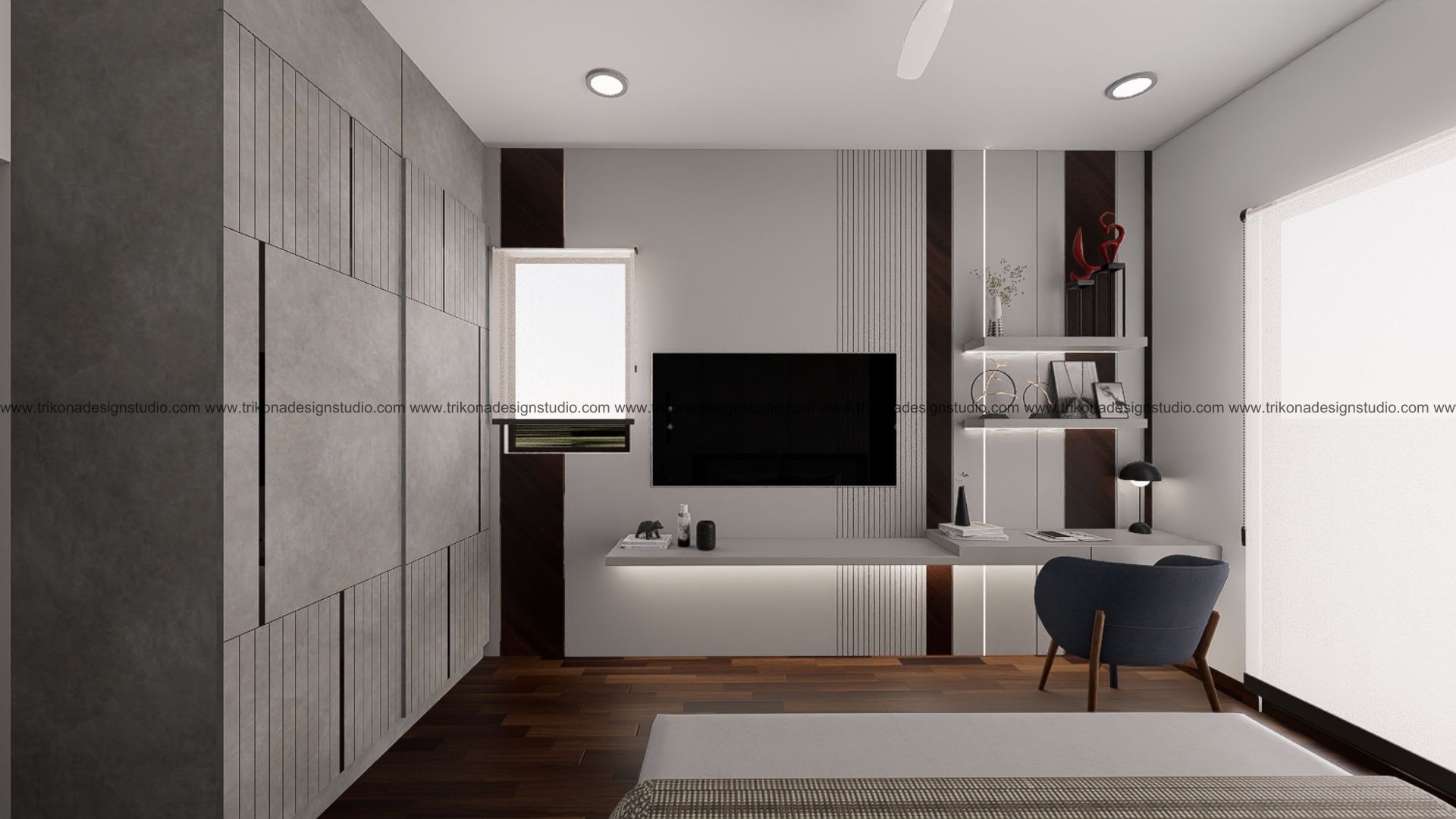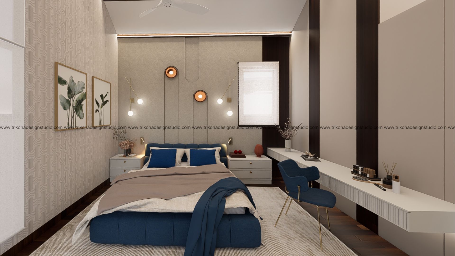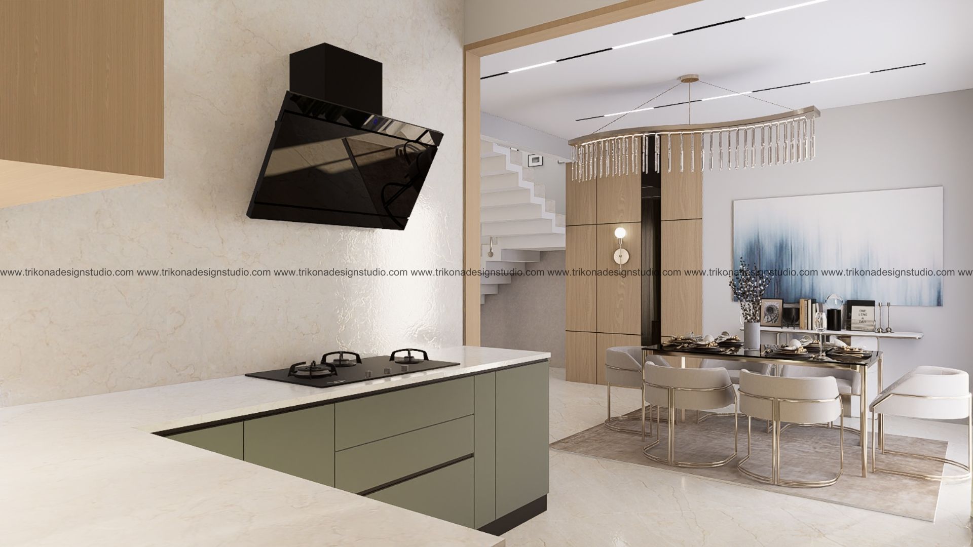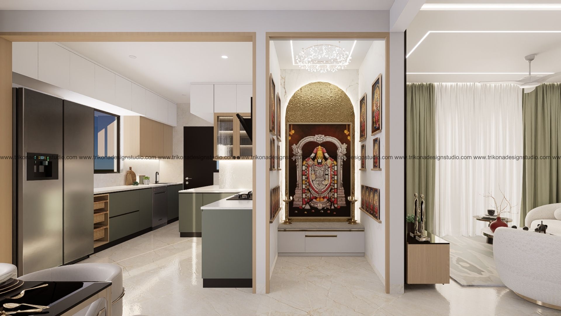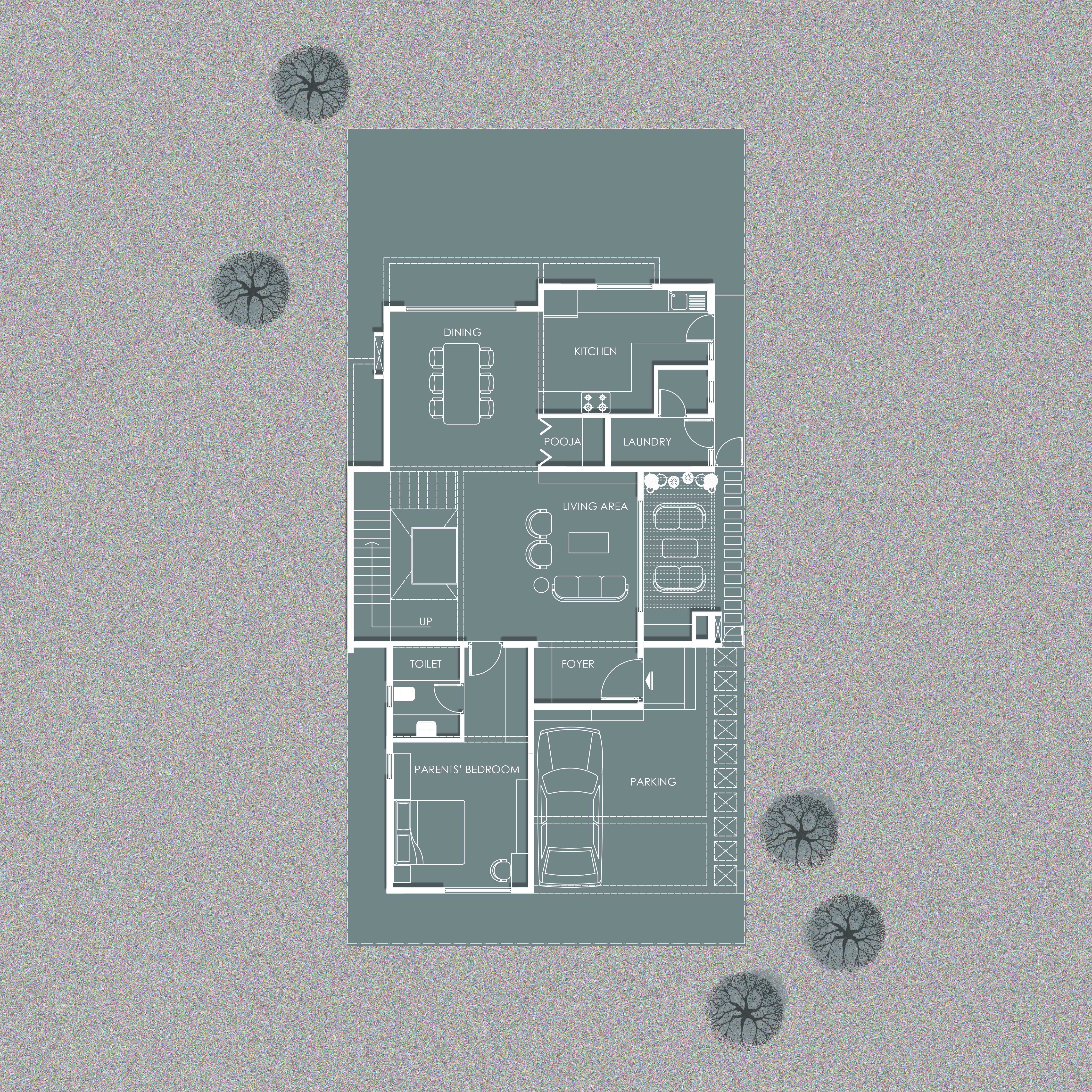 This G+1 villa blends modern refinement with a sense of individuality. The ground floor is envisioned as light and airy, with soft tones that open the living room, dining area, and kitchen into a welcoming flow of spaces. At its heart sits the pooja room, a serene sanctuary with a hammered brass arch backdrop—an elegant interplay of tradition and contemporary design. A versatile bedroom on this level adds to the home’s flexibility.