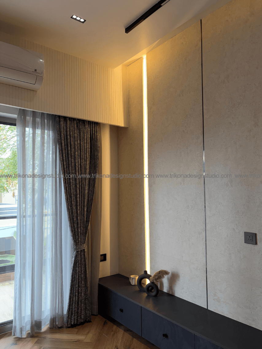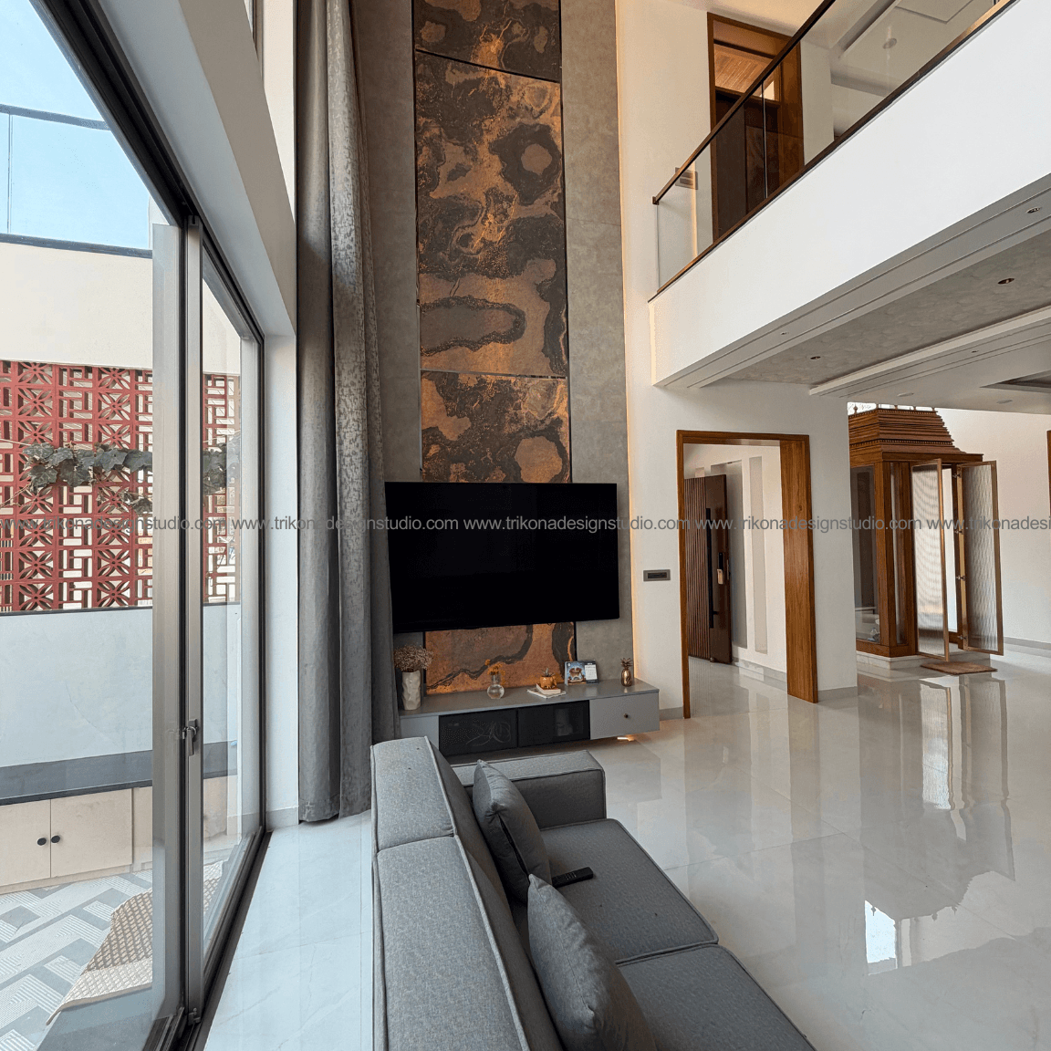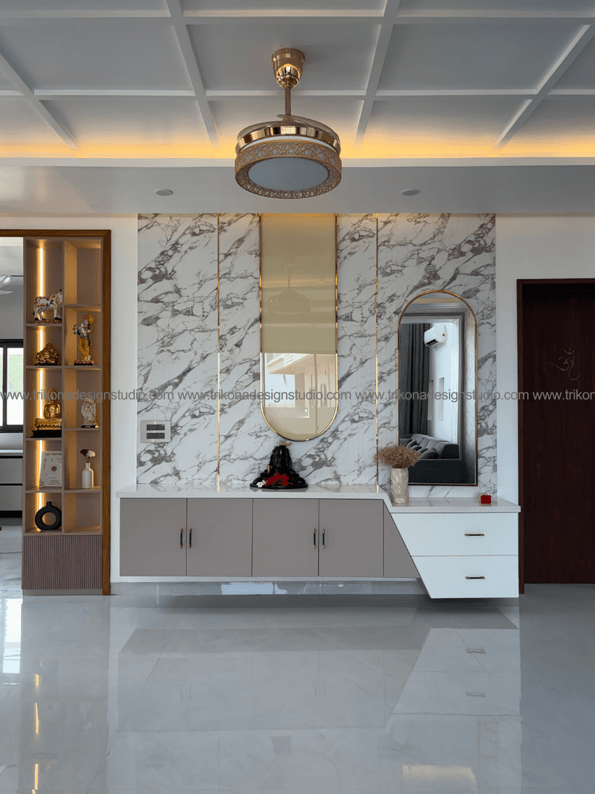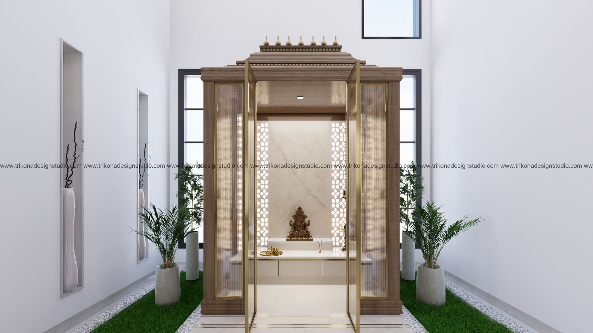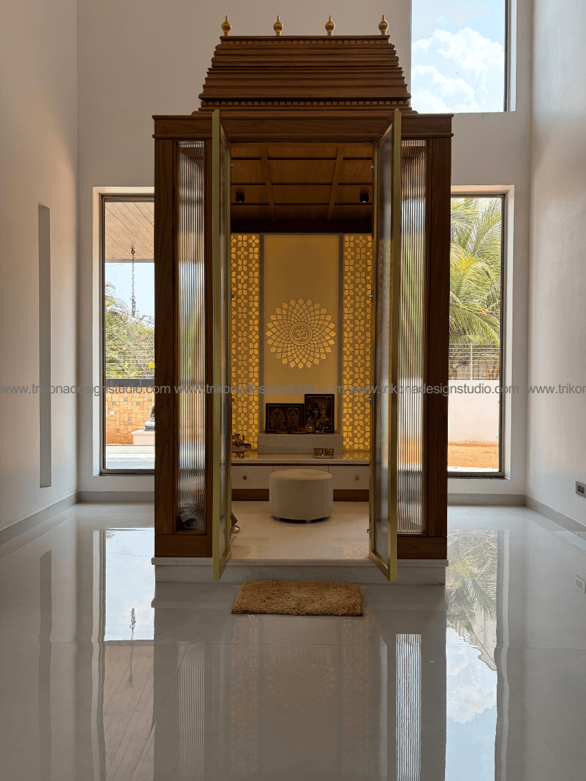 At the heart of the home sits a beautifully detailed pooja space, crafted as a tranquil sanctuary of devotion—its design balancing tradition with modern finesse.