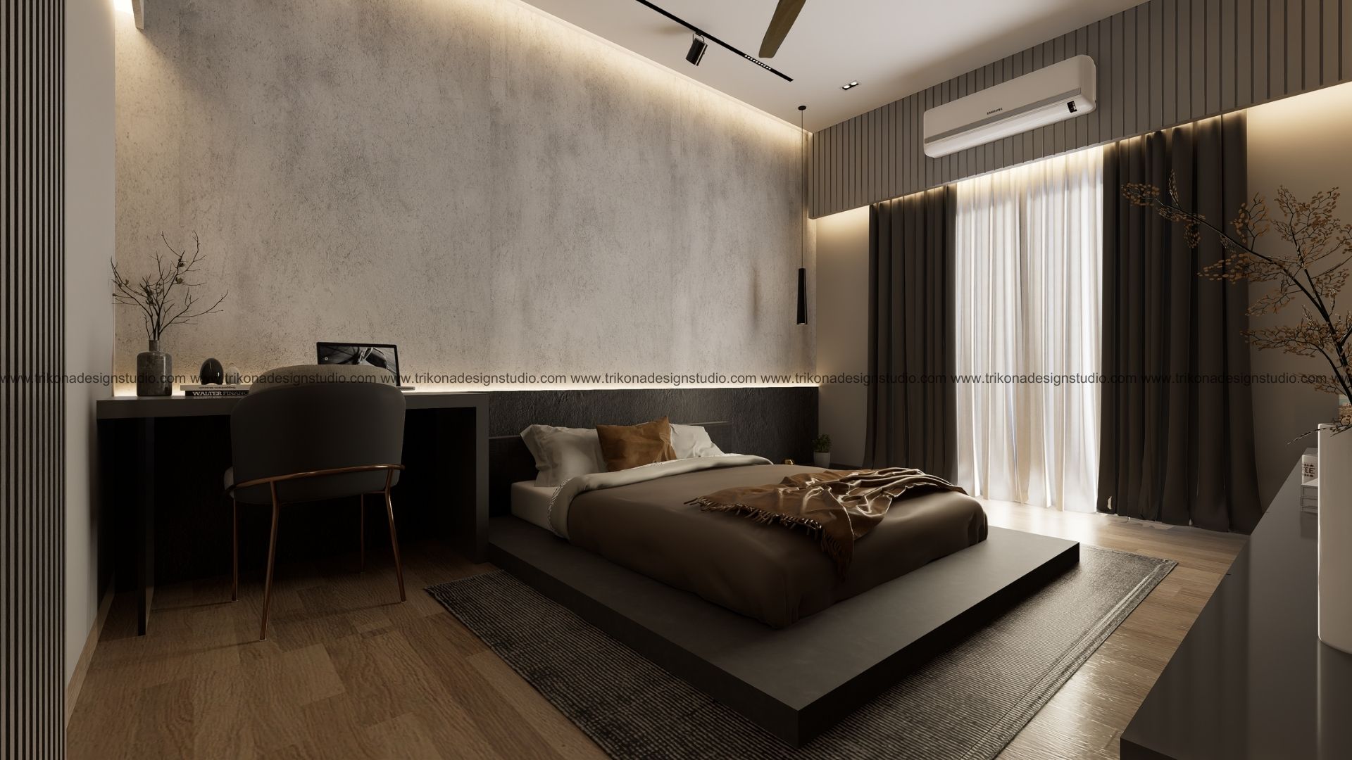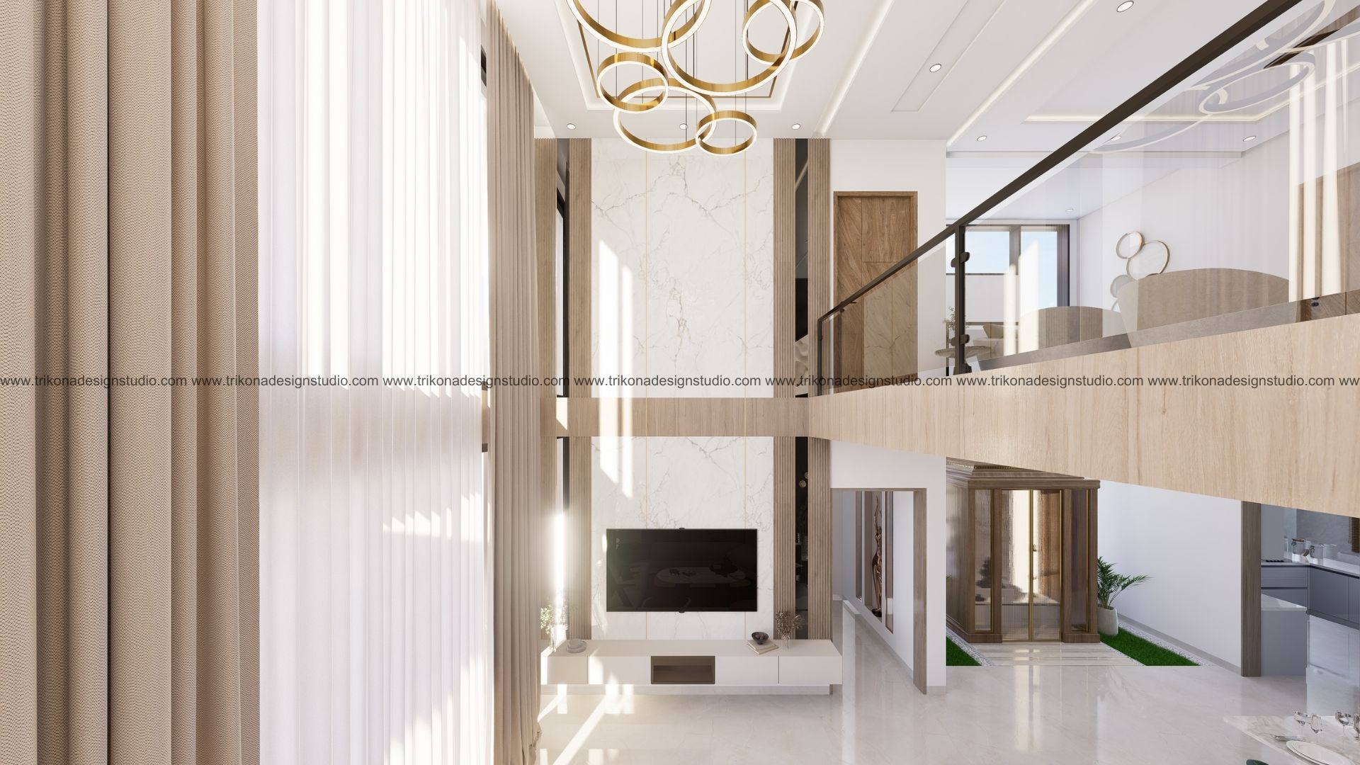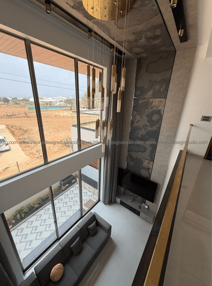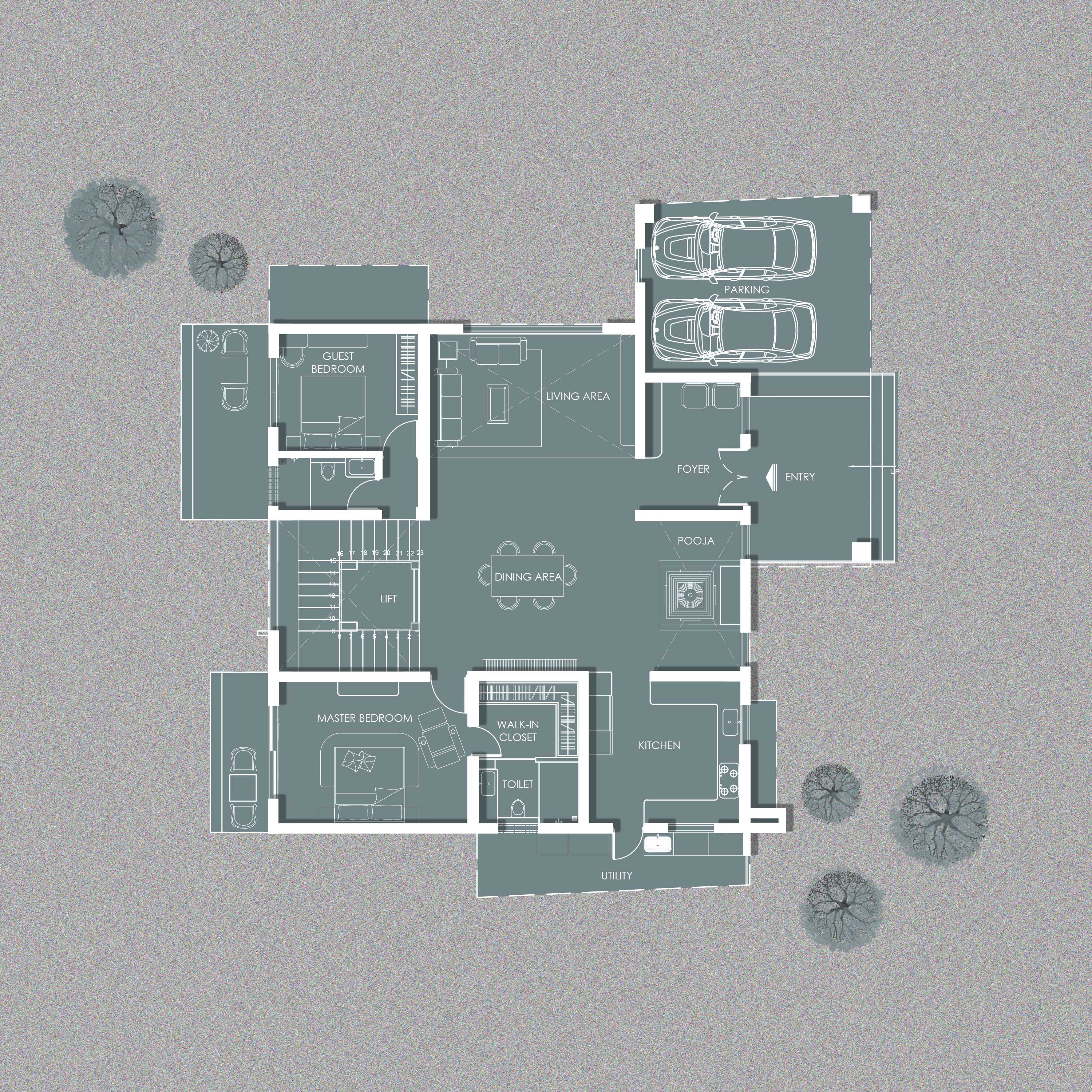 This G+1 villa is a celebration of light, elegance, and togetherness. The ground floor unfolds from a welcoming foyer into a soaring double-height living room, where natural light floods the space, highlighting a refined blend of stone, wood, and muted tones. Flowing seamlessly into the dining area and kitchen, the layout is designed for both family connection and effortless entertaining. The ground floor also accommodates a serene master suite and a warm guest bedroom, ensuring comfort for both residents and visitors.