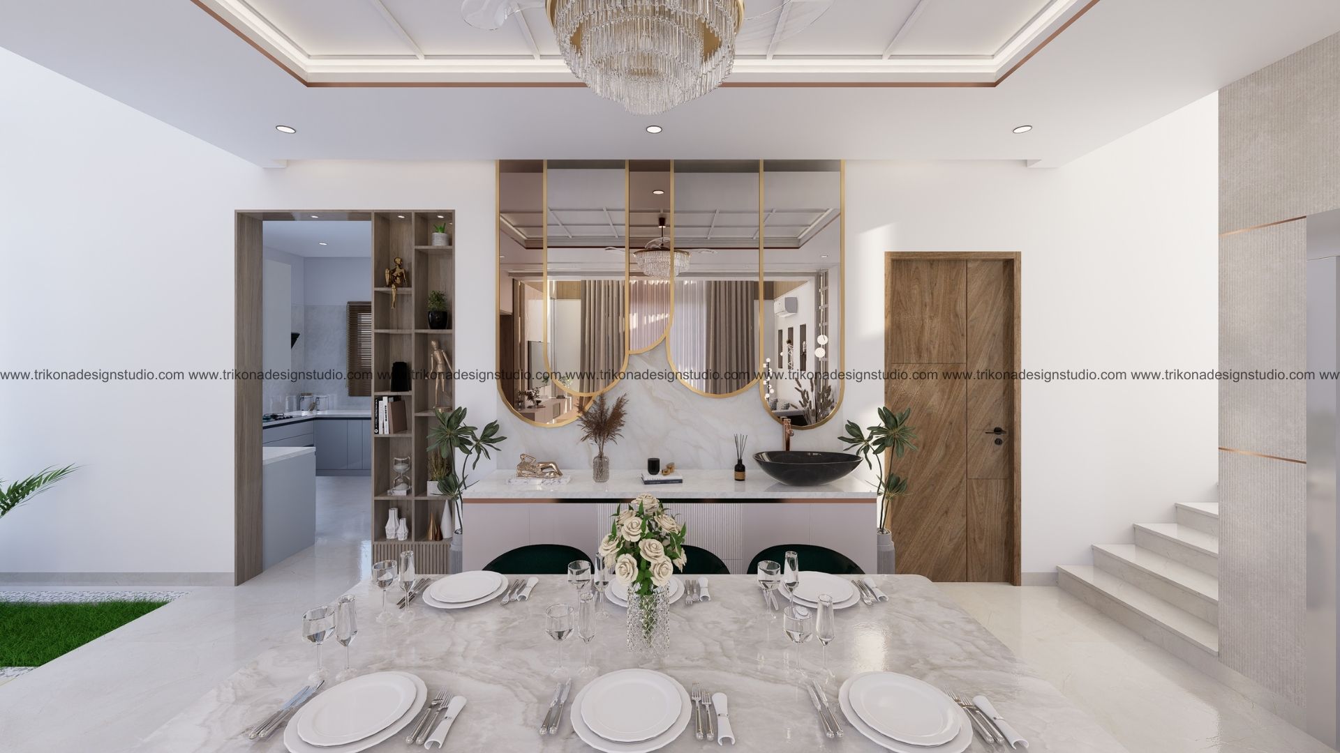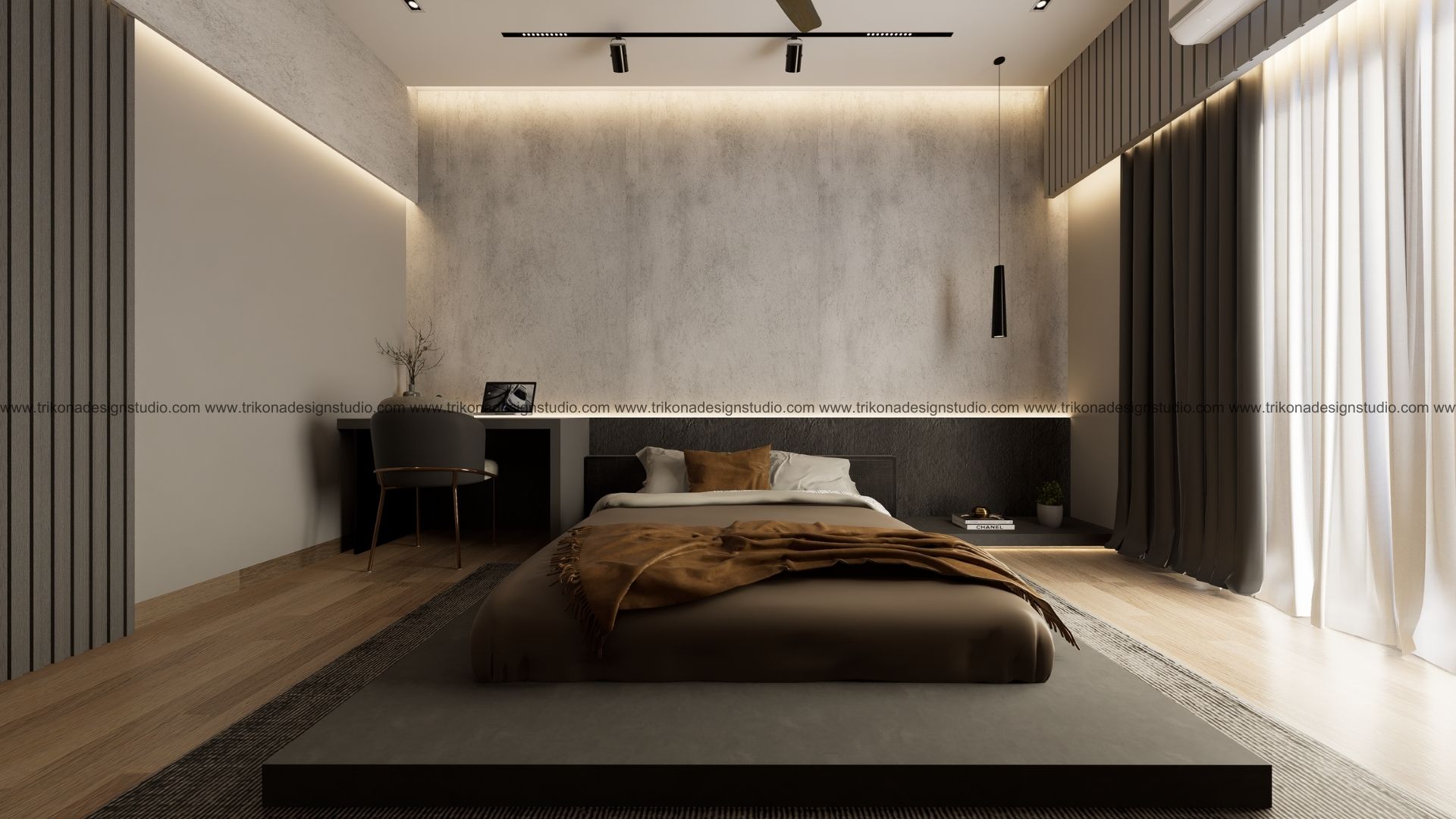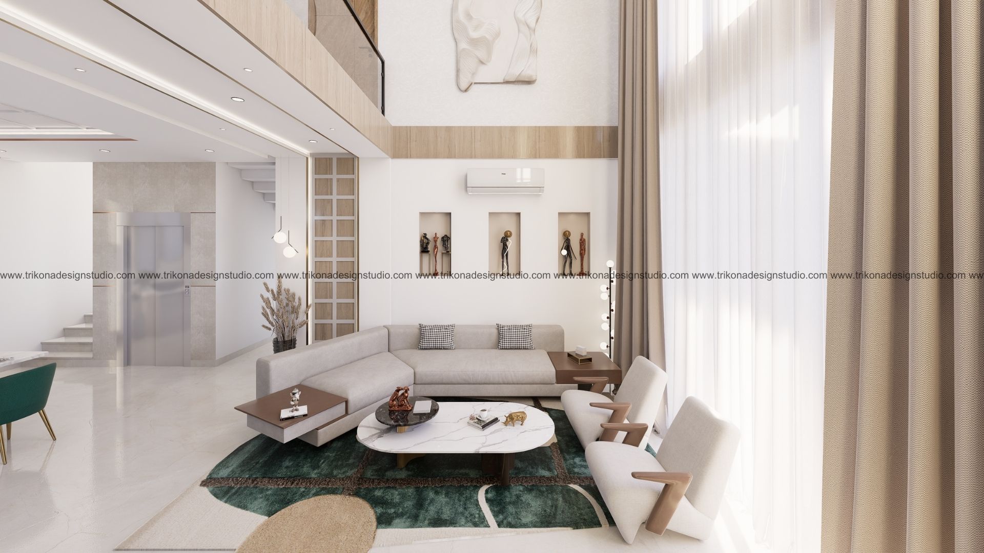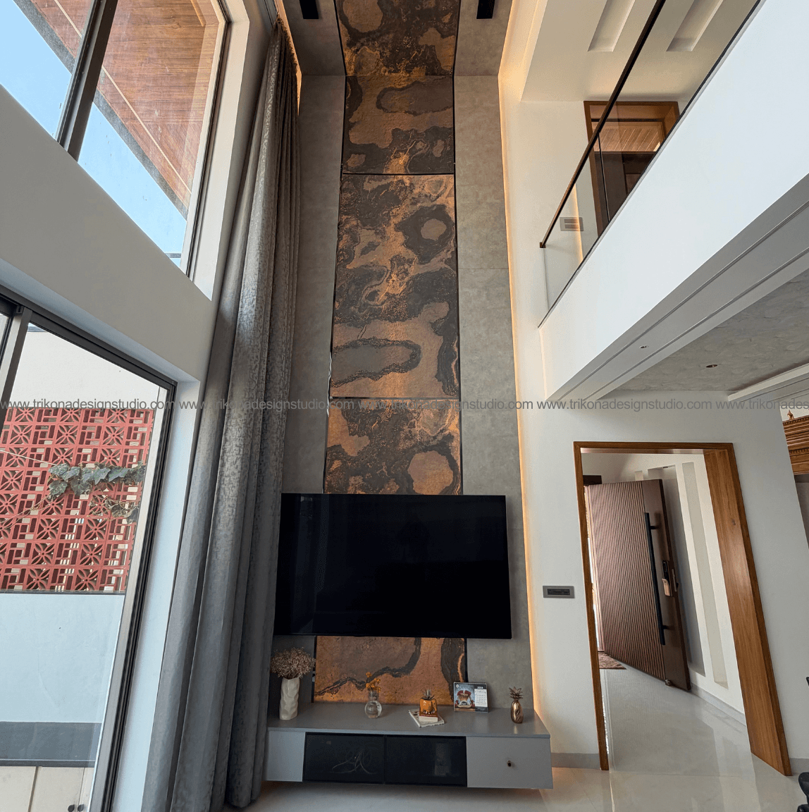 This G+1 villa is a celebration of light, elegance, and togetherness. The ground floor unfolds from a welcoming foyer into a soaring double-height living room, where natural light floods the space, highlighting a refined blend of stone, wood, and muted tones. Flowing seamlessly into the dining area and kitchen, the layout is designed for both family connection and effortless entertaining. The ground floor also accommodates a serene master suite and a warm guest bedroom, ensuring comfort for both residents and visitors.