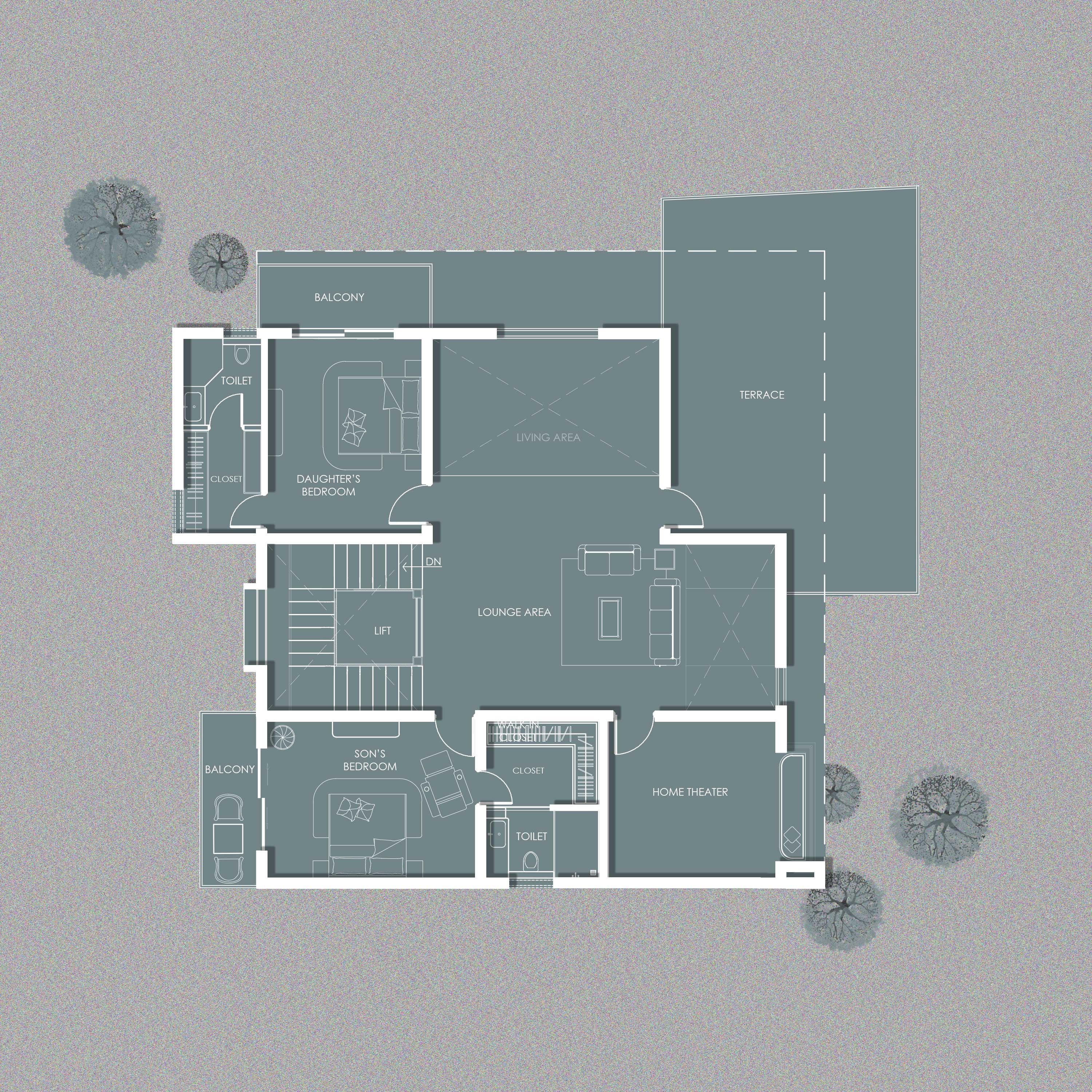 The first floor continues the harmony of openness and intimacy with a dedicated home theater, a terrace for leisure, and private bedrooms for the son and daughter, each tailored with distinct character yet tied together by a cohesive material palette. Every space in this villa reflects understated luxury and livability, creating a luminous haven where sophistication and comfort coexist.