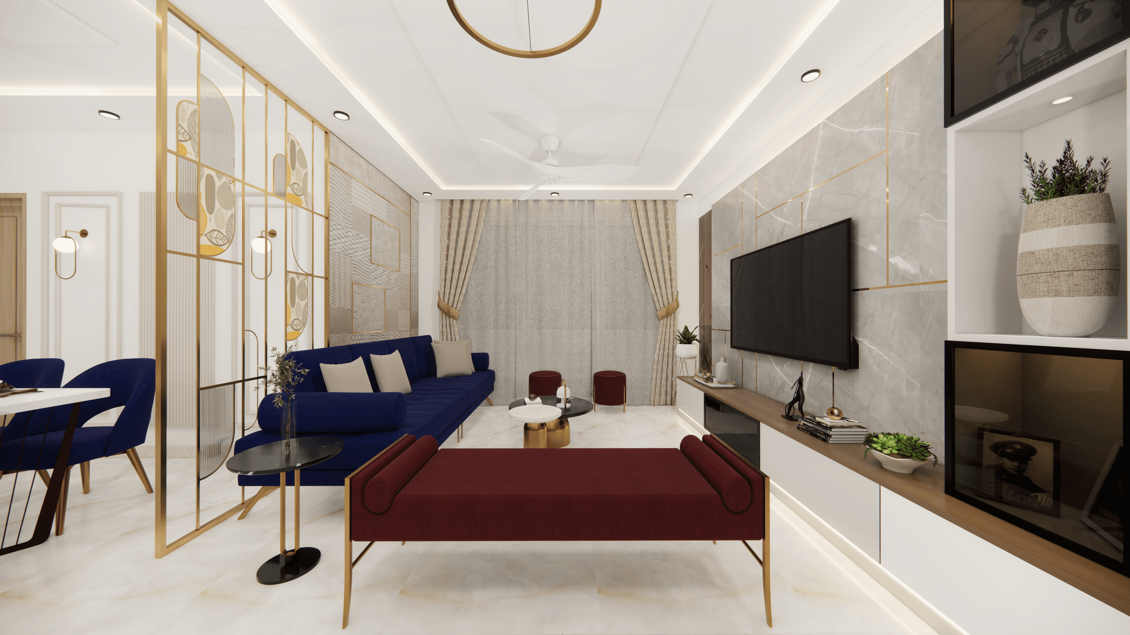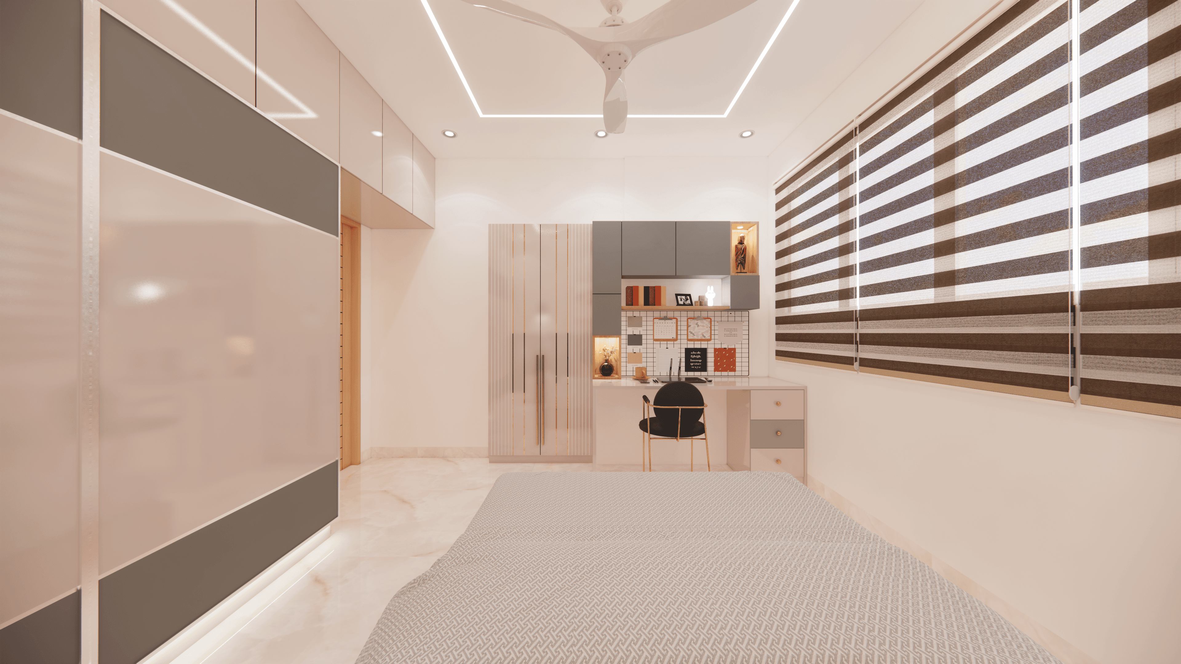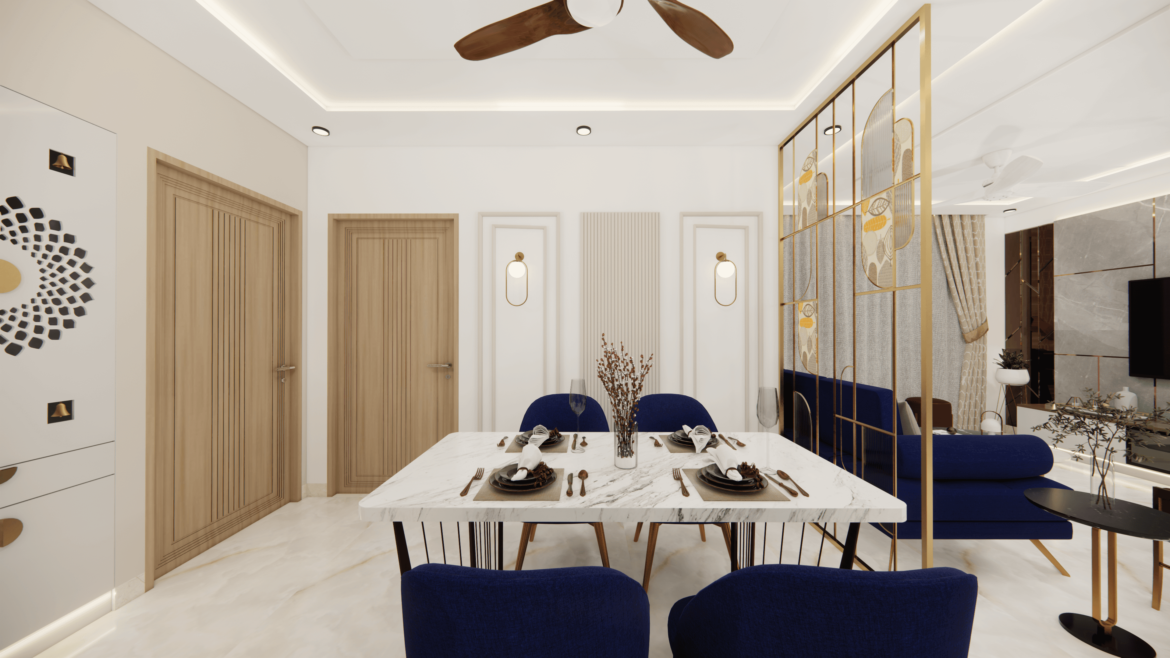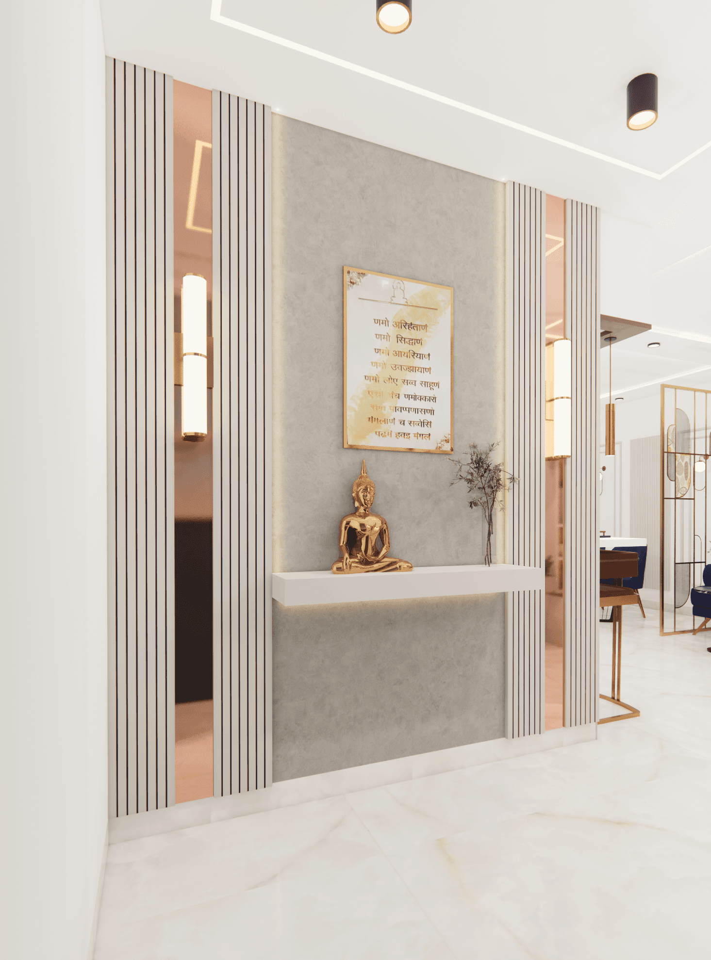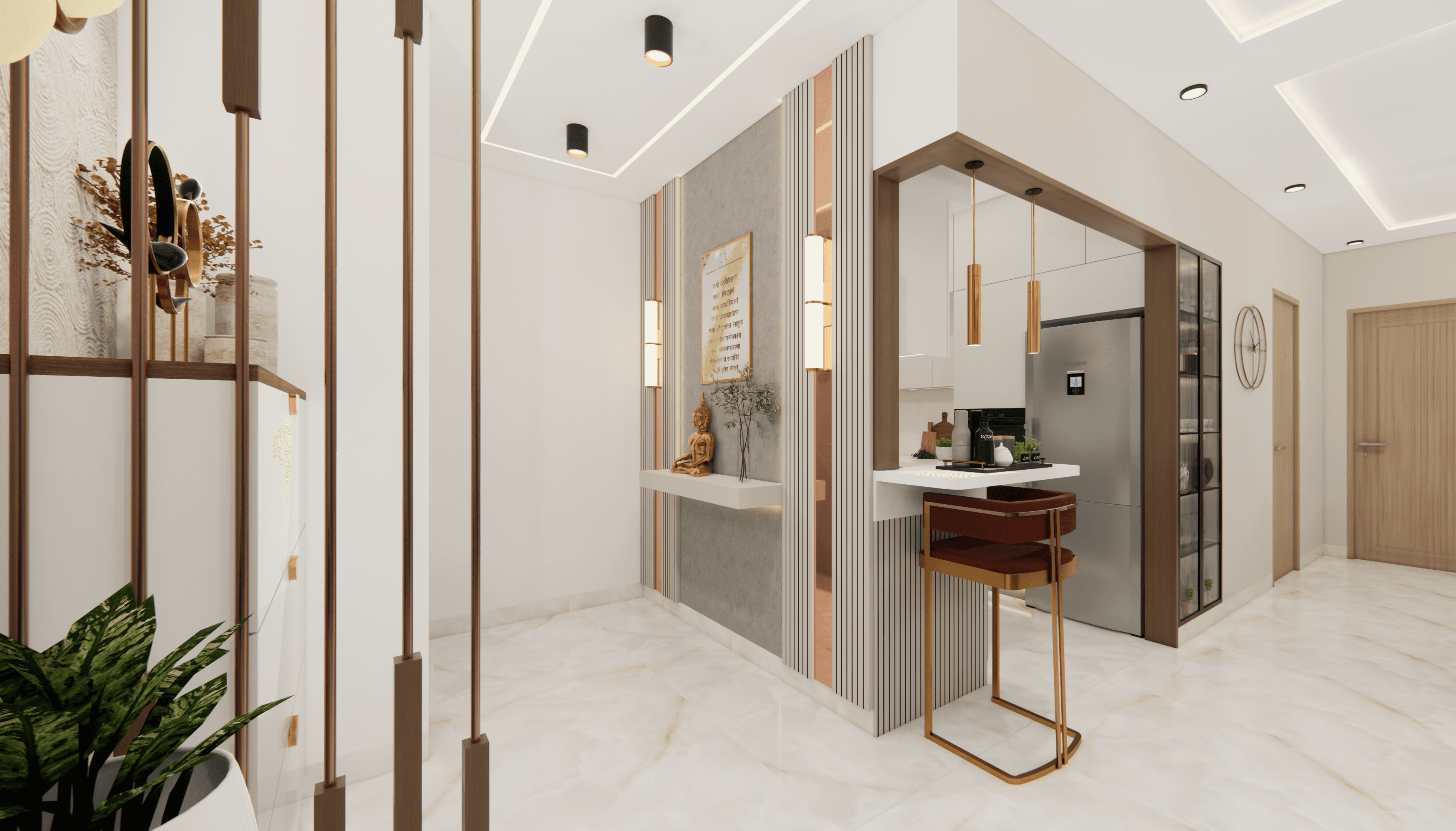 A luxurious 3-bedroom apartment in Bangalore where every corner exudes sophistication. The entrance boasts a stunning statement wall with louvered and rose gold mirror paneling, housing a serene Buddha idol. In the living room, a sleek TV unit and semi-open storage add modern flair. The kitchen dazzles in gray tones with a sleek crockery unit in fluted glass. Each bedroom is a masterpiece - from the kids' room with textured waves to the guest room's smart storage solutions, to the master bedroom's olive green accents and versatile wardrobe design. Welcome to a realm of timeless elegance at Modern Mirage.