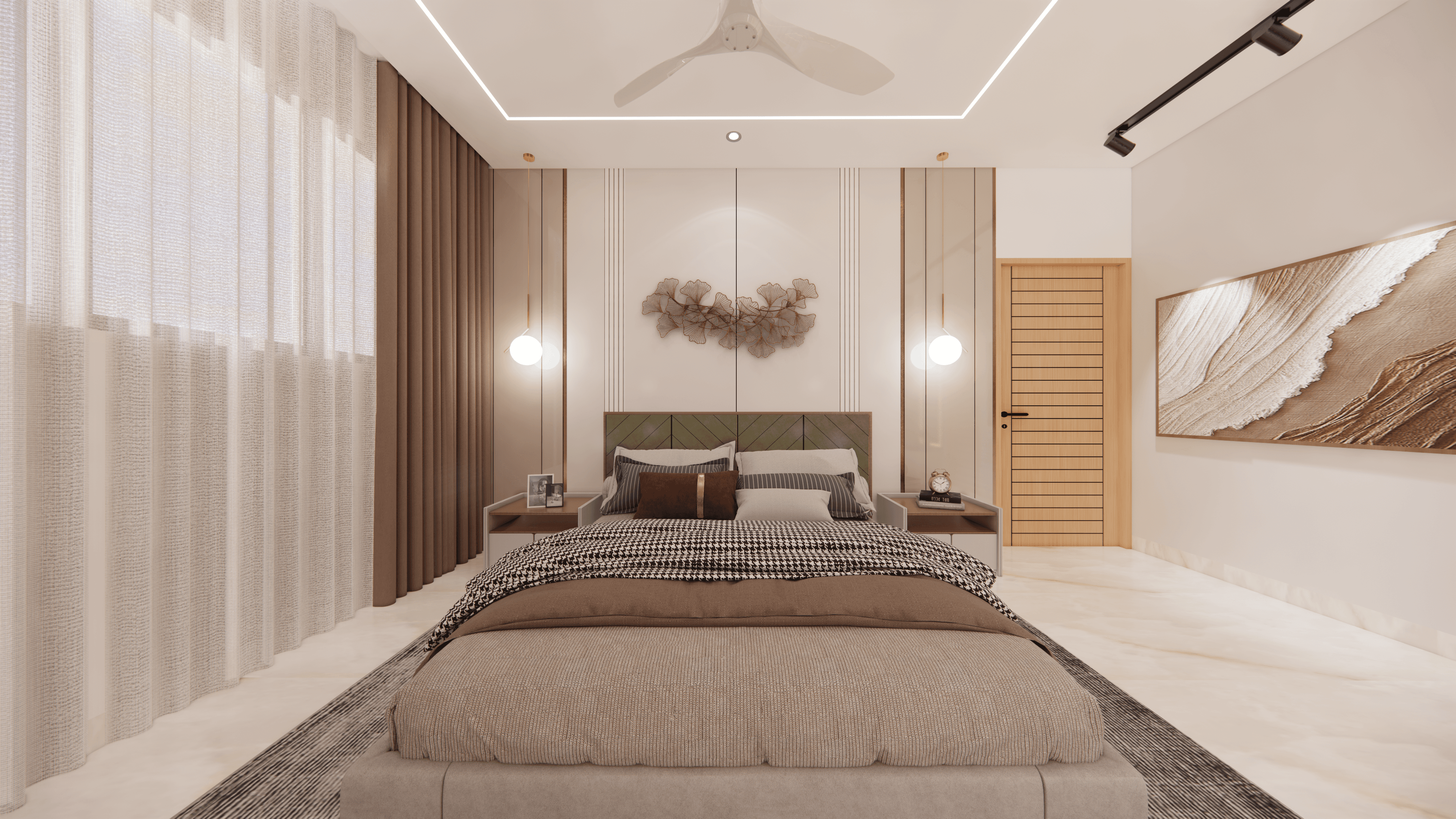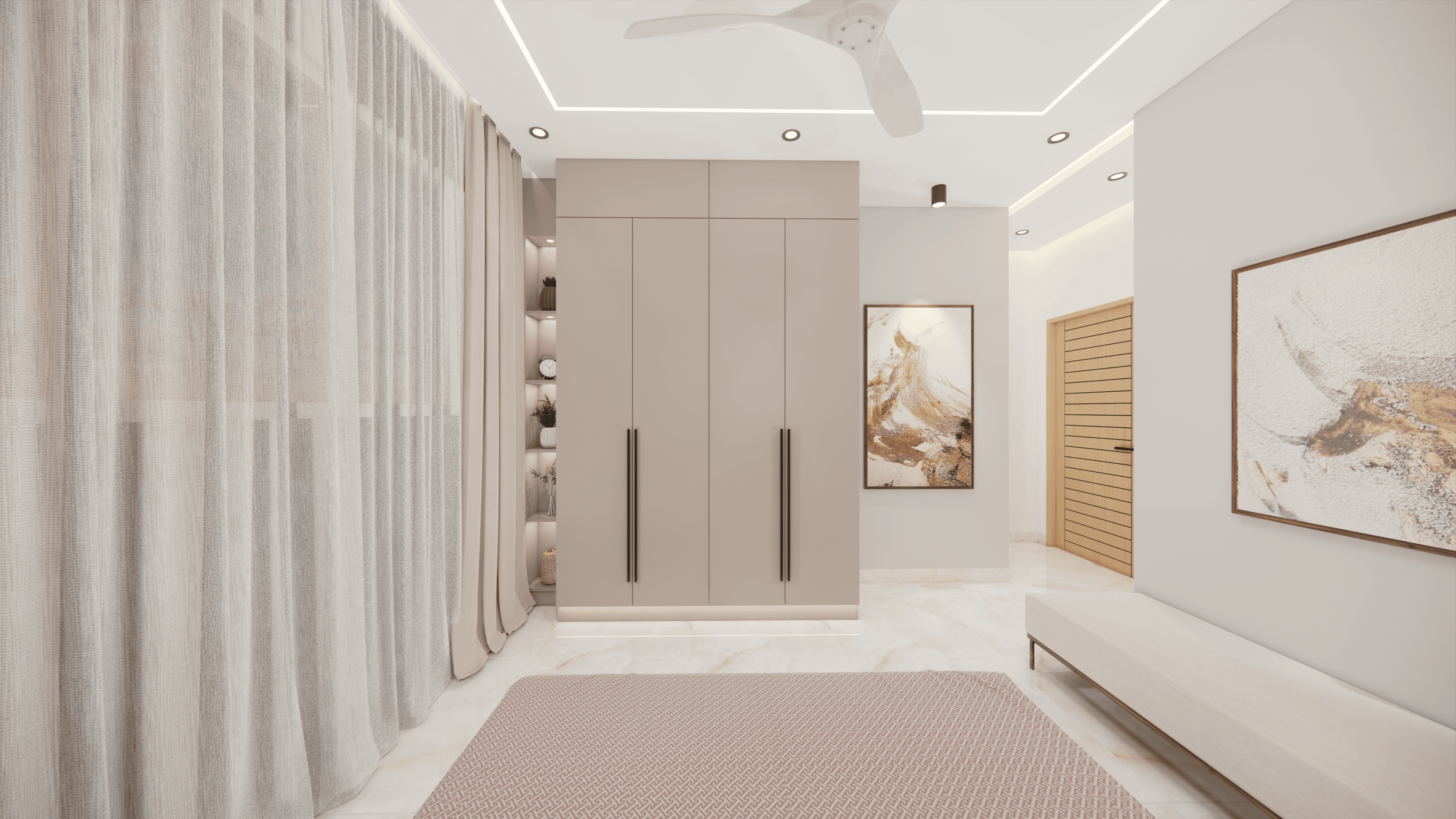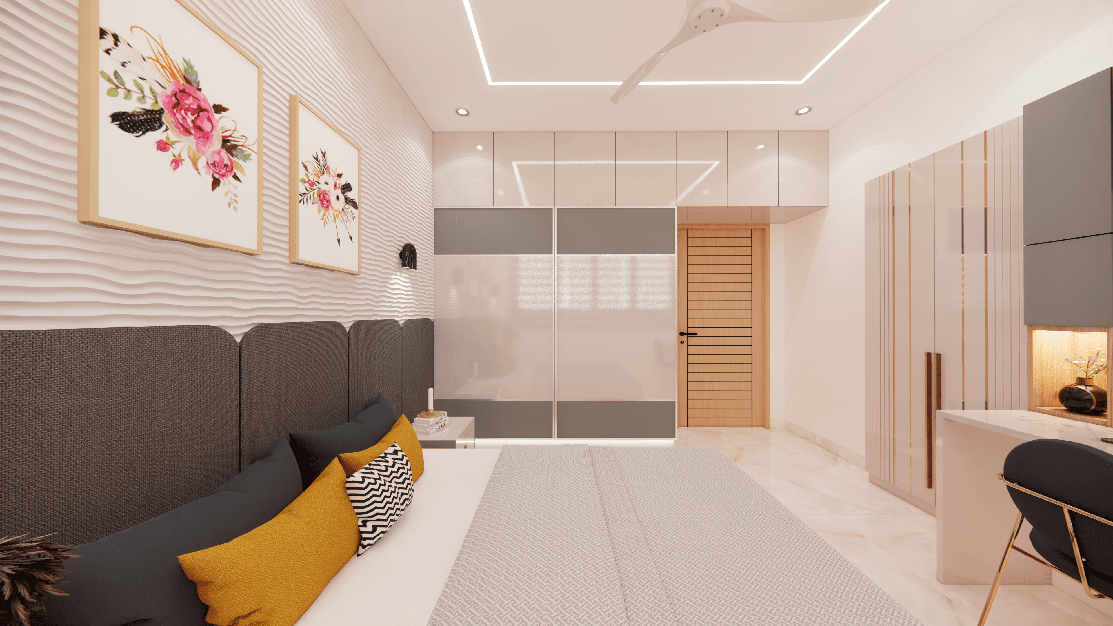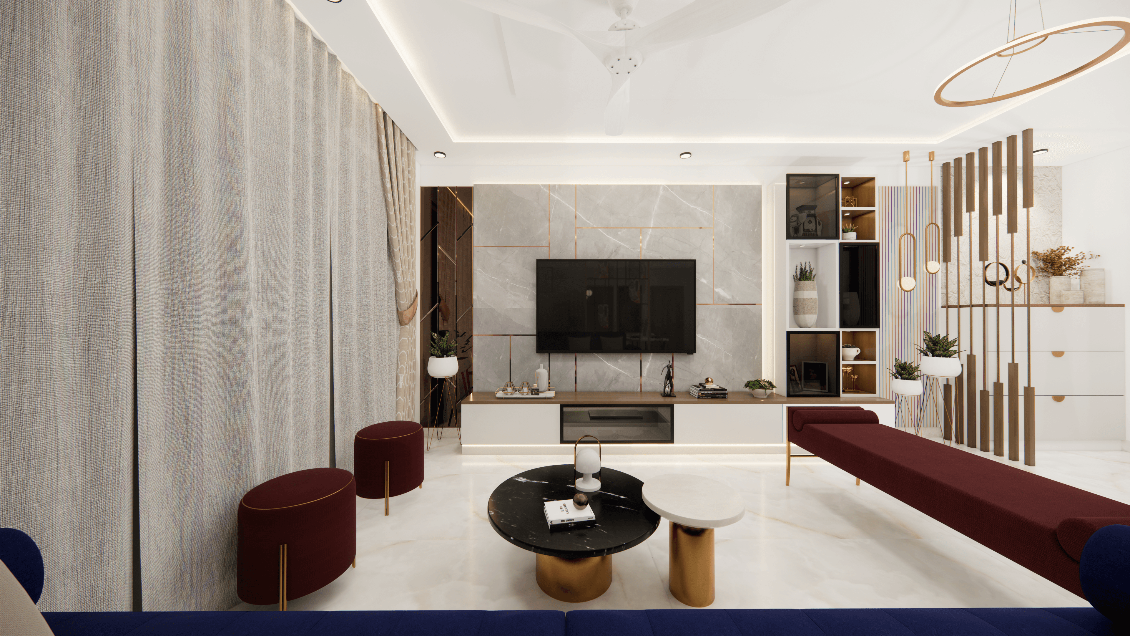 A luxurious 3-bedroom apartment in Bangalore where every corner exudes sophistication. The entrance boasts a stunning statement wall with louvered and rose gold mirror paneling, housing a serene Buddha idol. In the living room, a sleek TV unit and semi-open storage add modern flair. The kitchen dazzles in gray tones with a sleek crockery unit in fluted glass. Each bedroom is a masterpiece - from the kids' room with textured waves to the guest room's smart storage solutions, to the master bedroom's olive green accents and versatile wardrobe design. Welcome to a realm of timeless elegance at Modern Mirage.