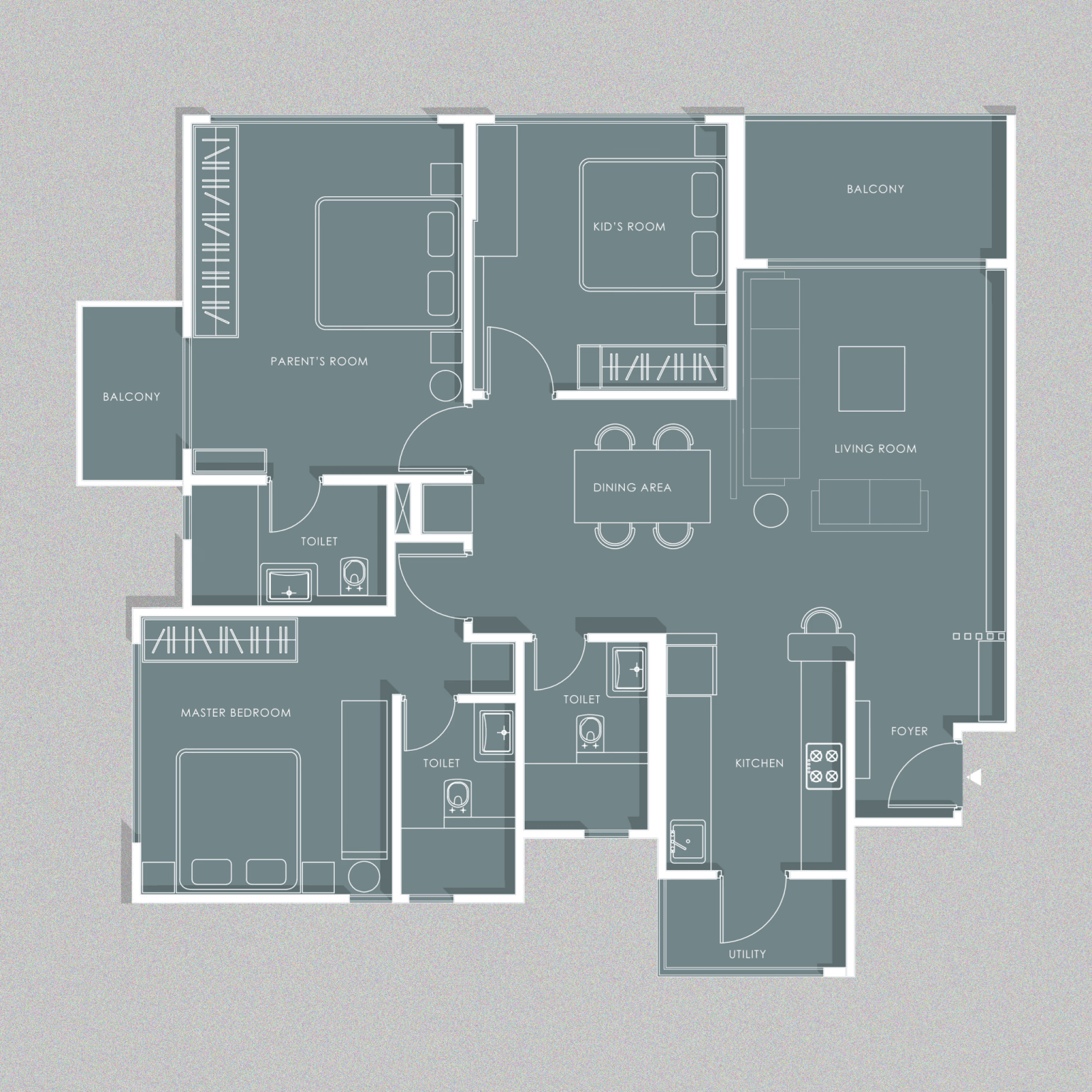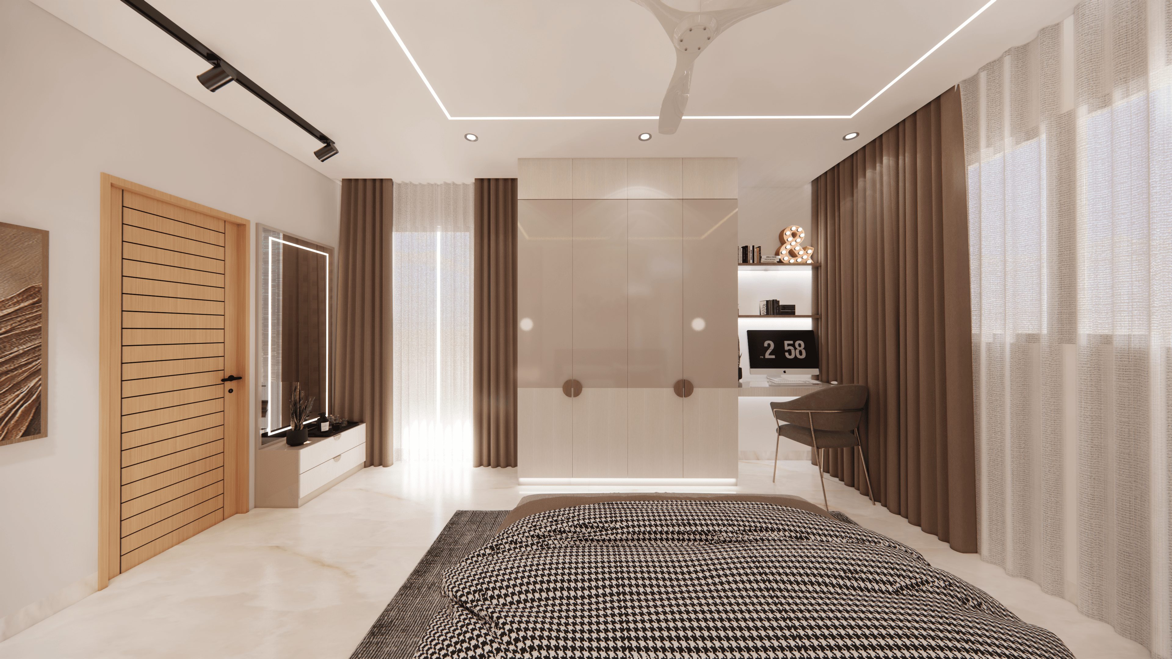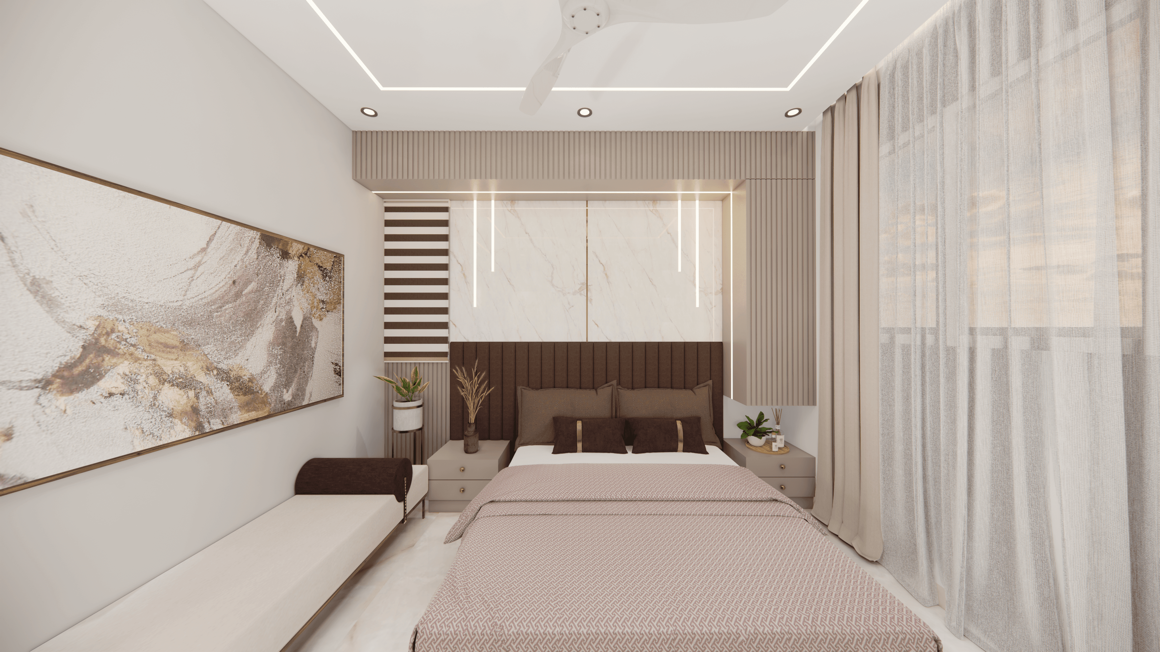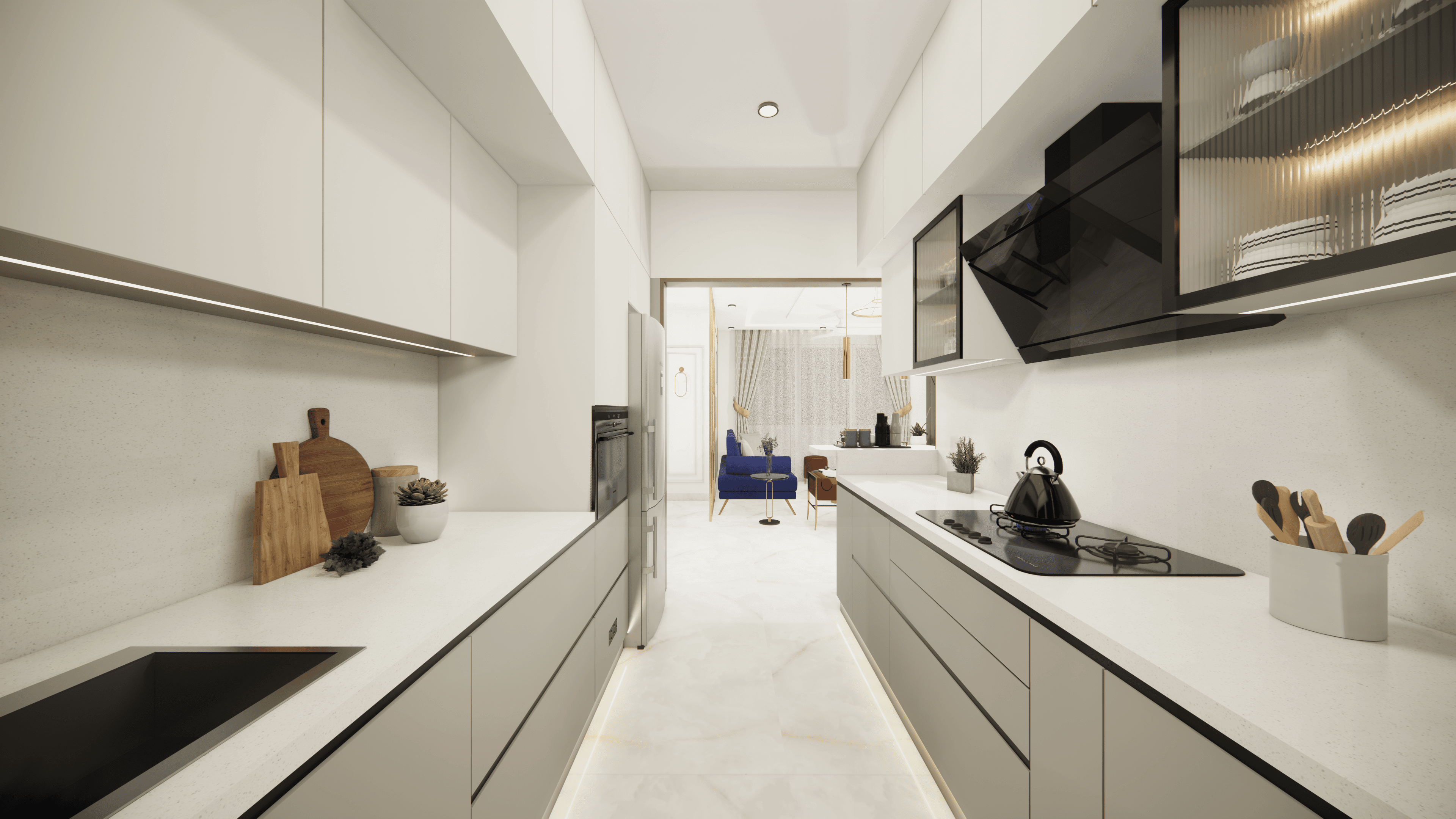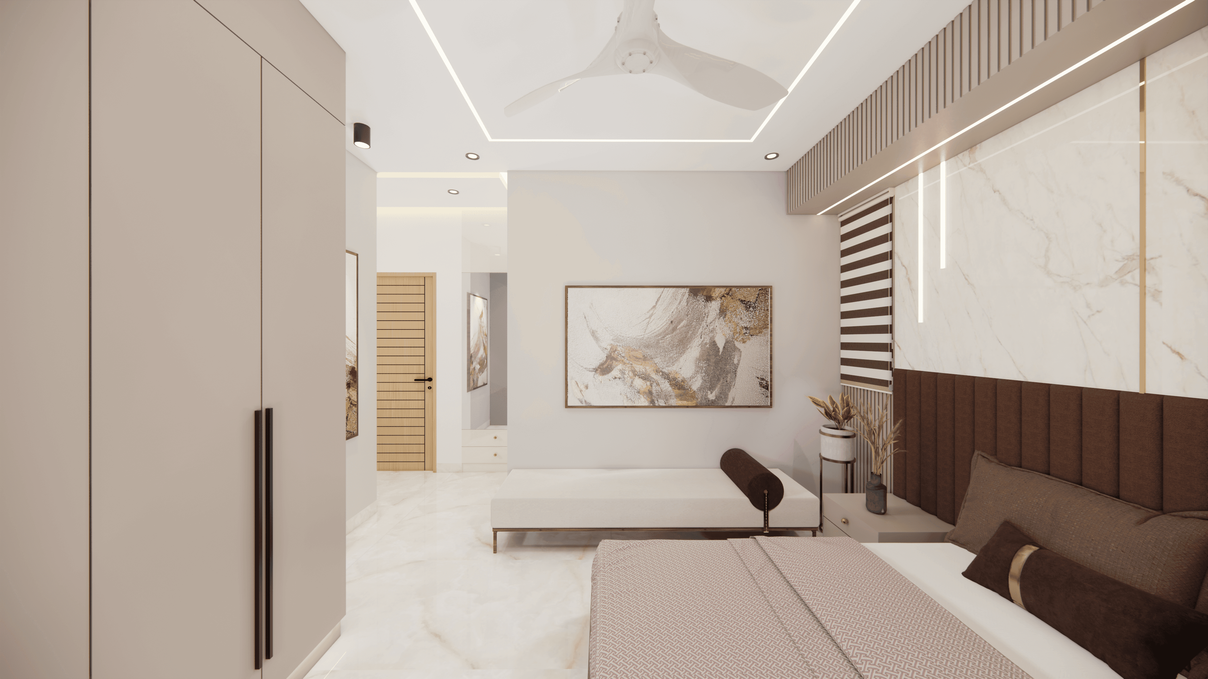 A luxurious 3-bedroom apartment in Bangalore where every corner exudes sophistication. The entrance boasts a stunning statement wall with louvered and rose gold mirror paneling, housing a serene Buddha idol. In the living room, a sleek TV unit and semi-open storage add modern flair. The kitchen dazzles in gray tones with a sleek crockery unit in fluted glass. Each bedroom is a masterpiece - from the kids' room with textured waves to the guest room's smart storage solutions, to the master bedroom's olive green accents and versatile wardrobe design. Welcome to a realm of timeless elegance at Modern Mirage.