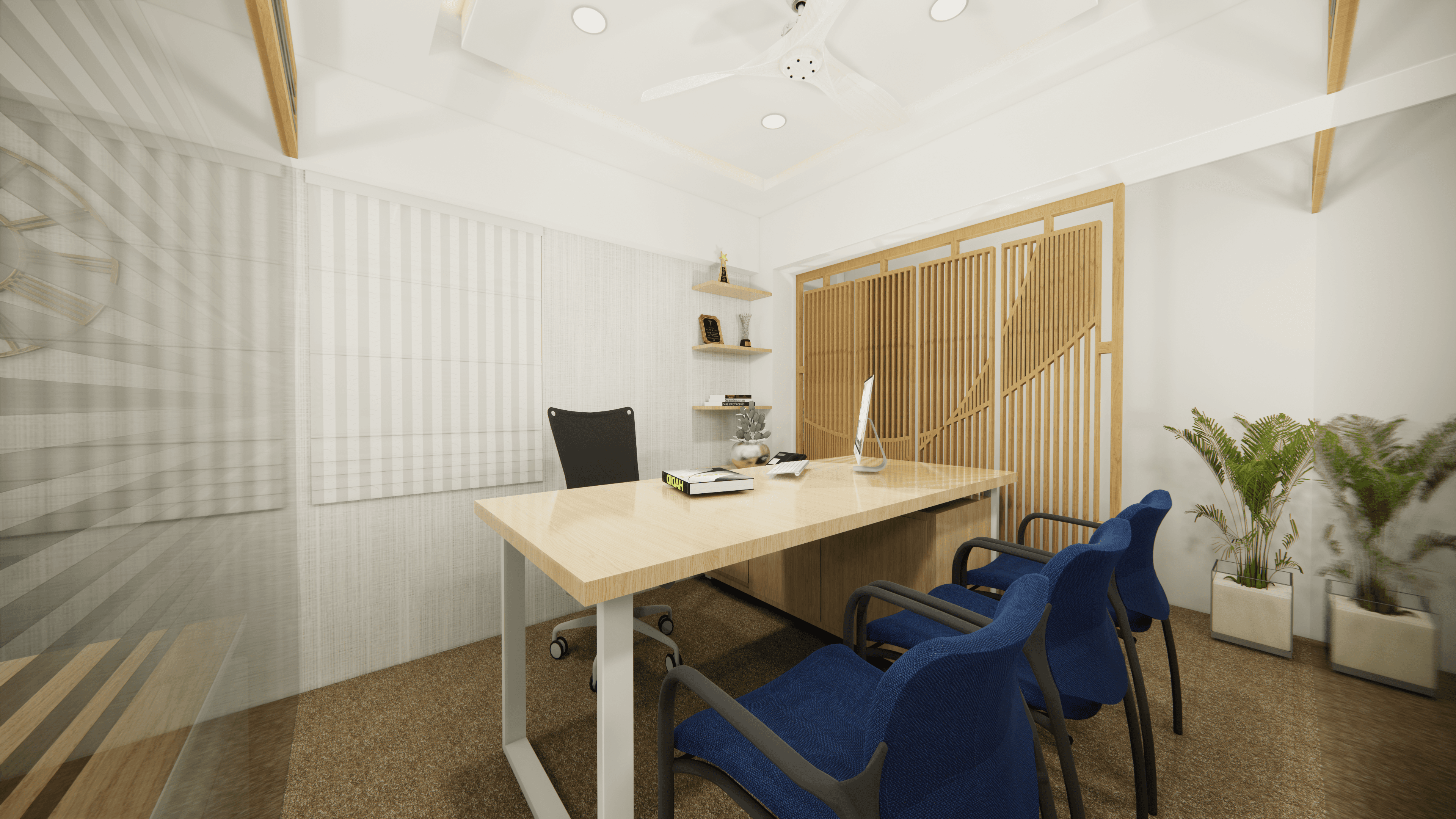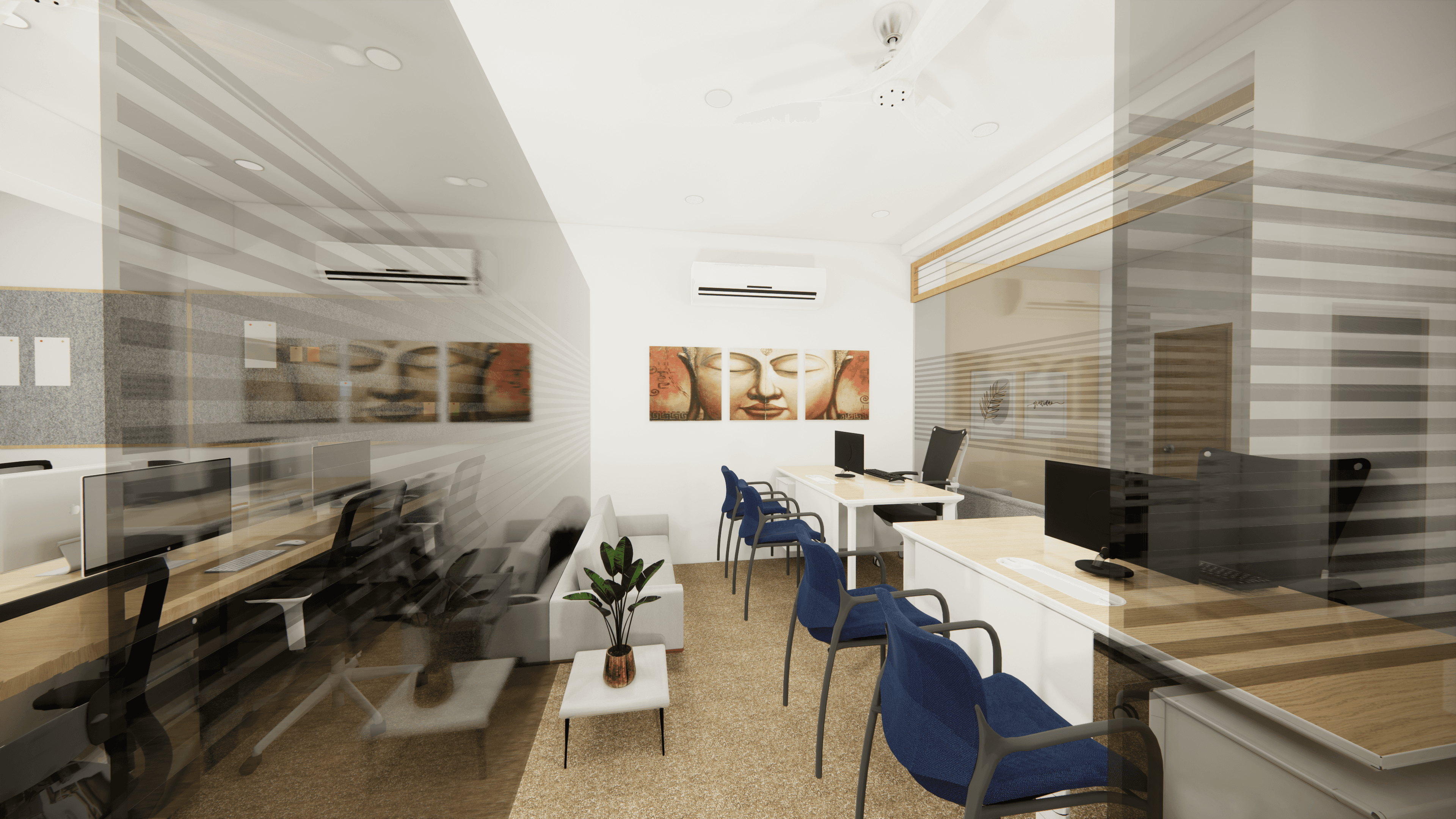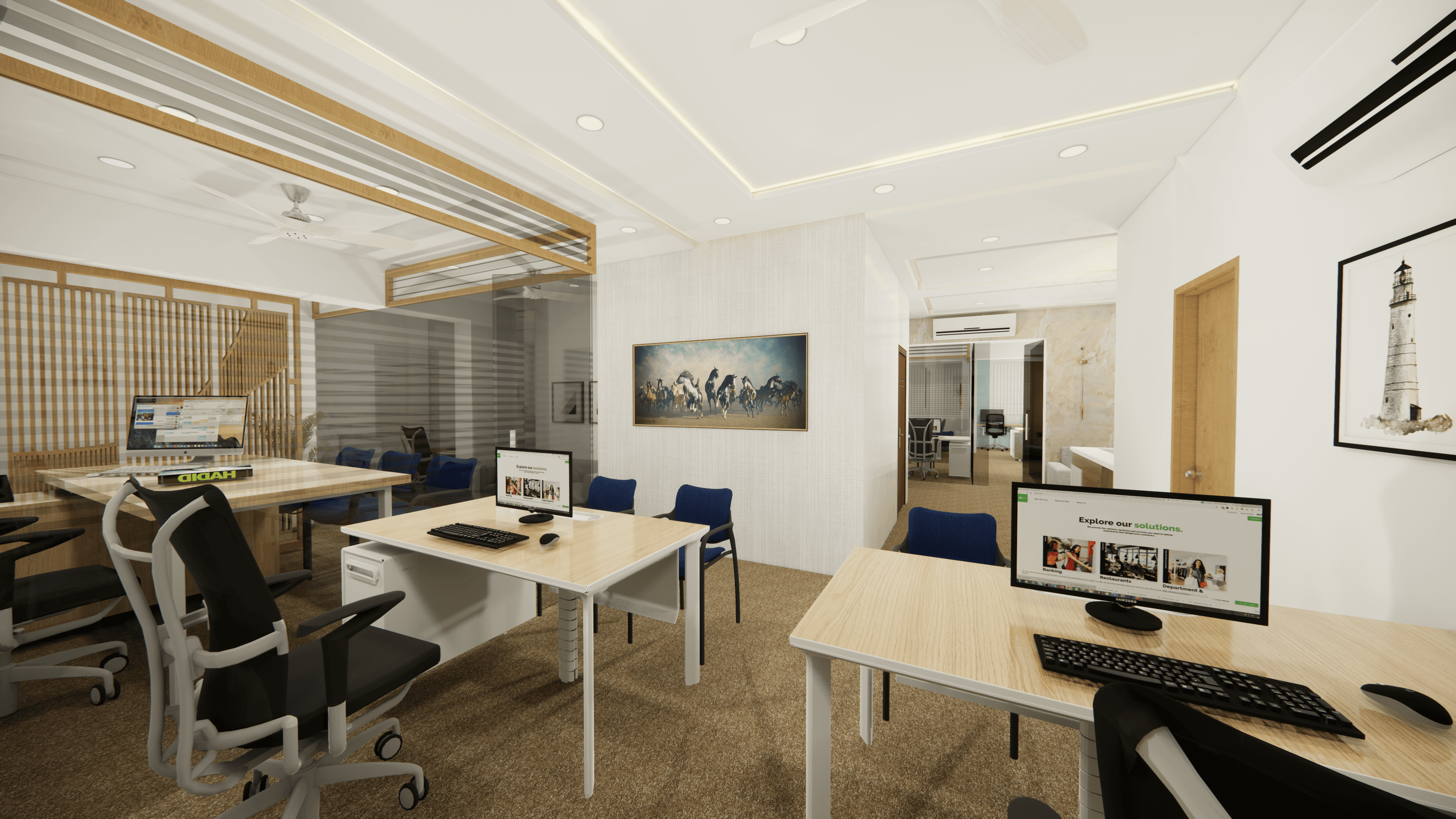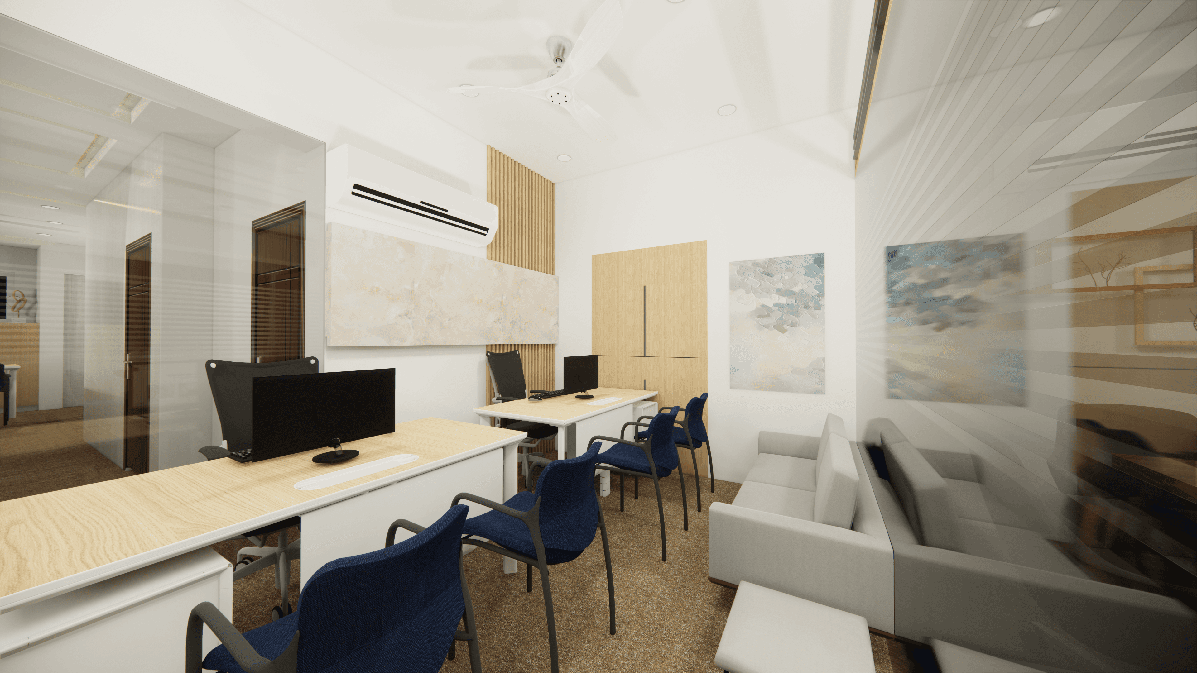Welcome to Pinetex, a vibrant and functional workspace located in the heart of Delhi. Designed for a textile company's operations, this stylish office showcases a warm and contemporary atmosphere predominantly in pine wood color. As you step inside, you will be greeted by a welcoming reception and a comfortable waiting area. Behind the reception table proudly stands the company logo, making a statement of professionalism and creativity. The office boasts numerous workstations, providing a productive environment for the team, along with a few well-appointed conference rooms for meetings and collaboration. Come and experience the perfect blend of functionality and aesthetics at Pinetex.