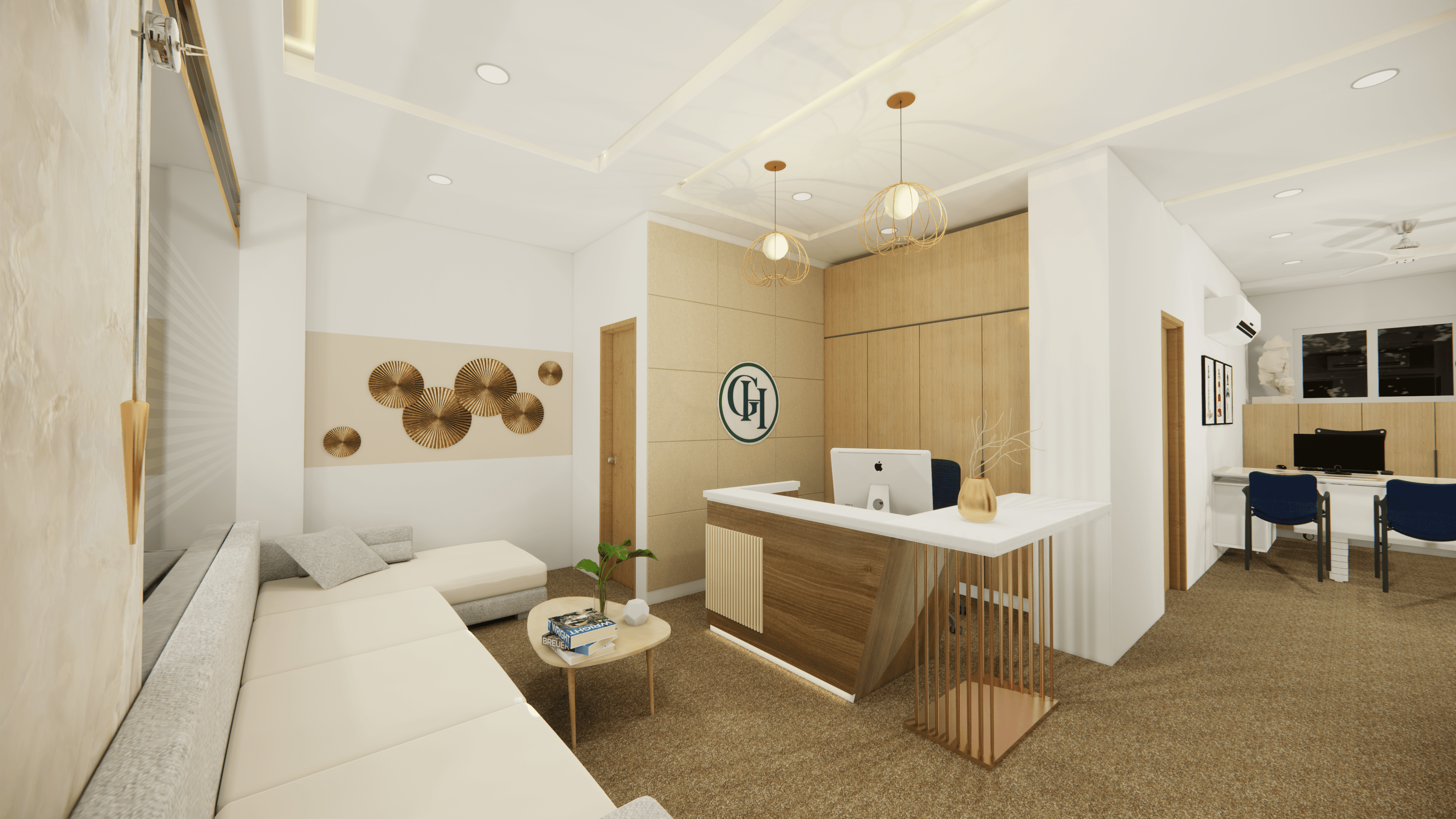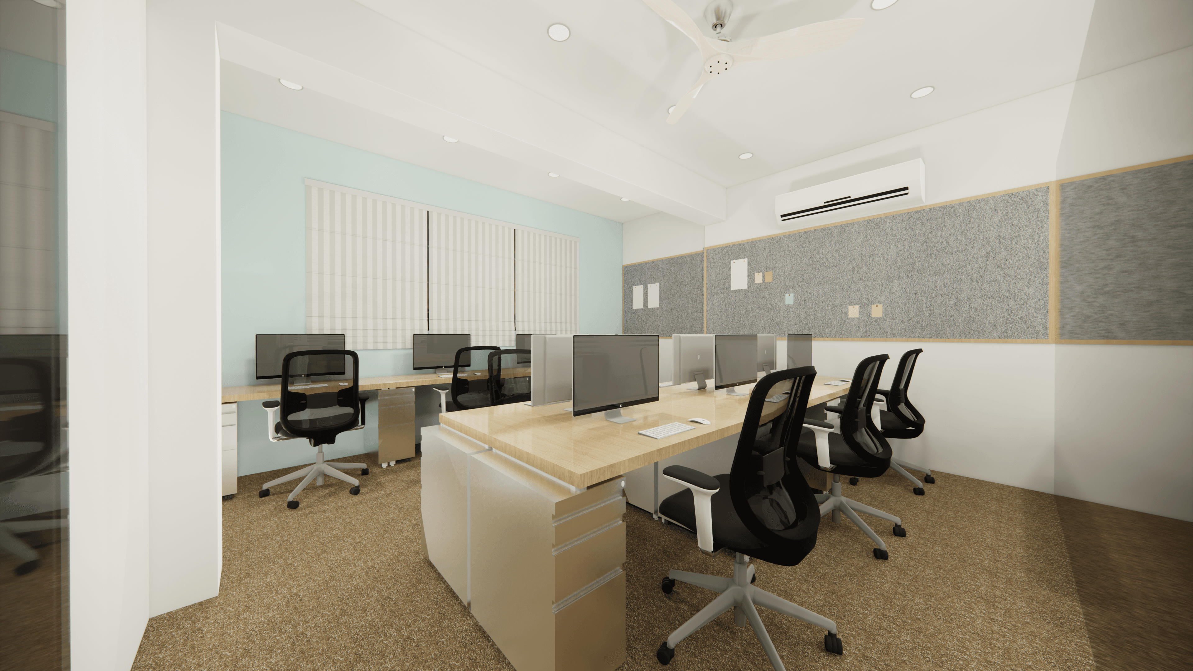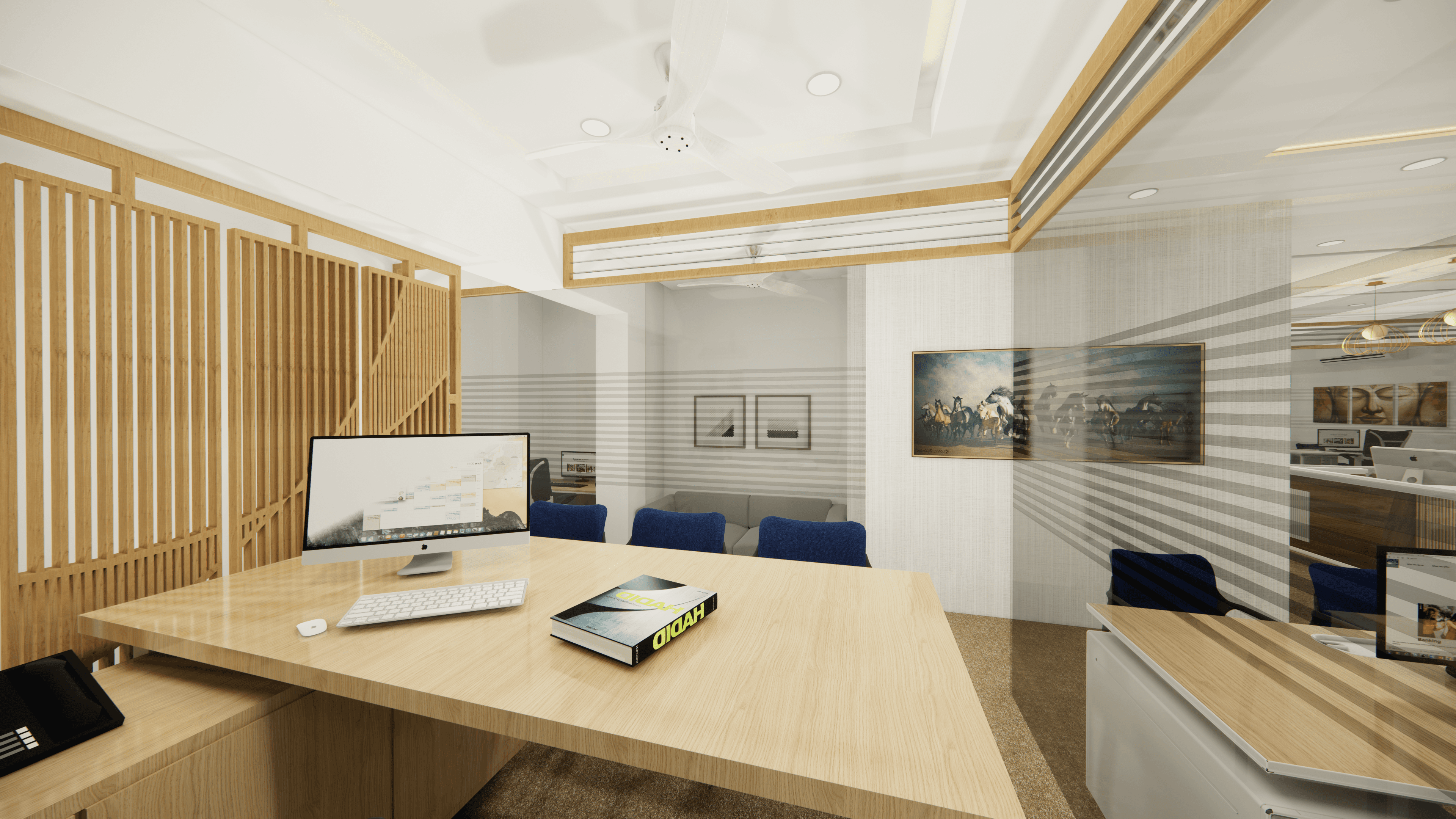 Welcome to Pinetex, a vibrant and functional workspace located in the heart of Delhi. Designed for a textile company's operations, this stylish office showcases a warm and contemporary atmosphere predominantly in pine wood color. As you step inside, you will be greeted by a welcoming reception and a comfortable waiting area. Behind the reception table proudly stands the company logo, making a statement of professionalism and creativity. The office boasts numerous workstations, providing a productive environment for the team, along with a few well-appointed conference rooms for meetings and collaboration. Come and experience the perfect blend of functionality and aesthetics at Pinetex.