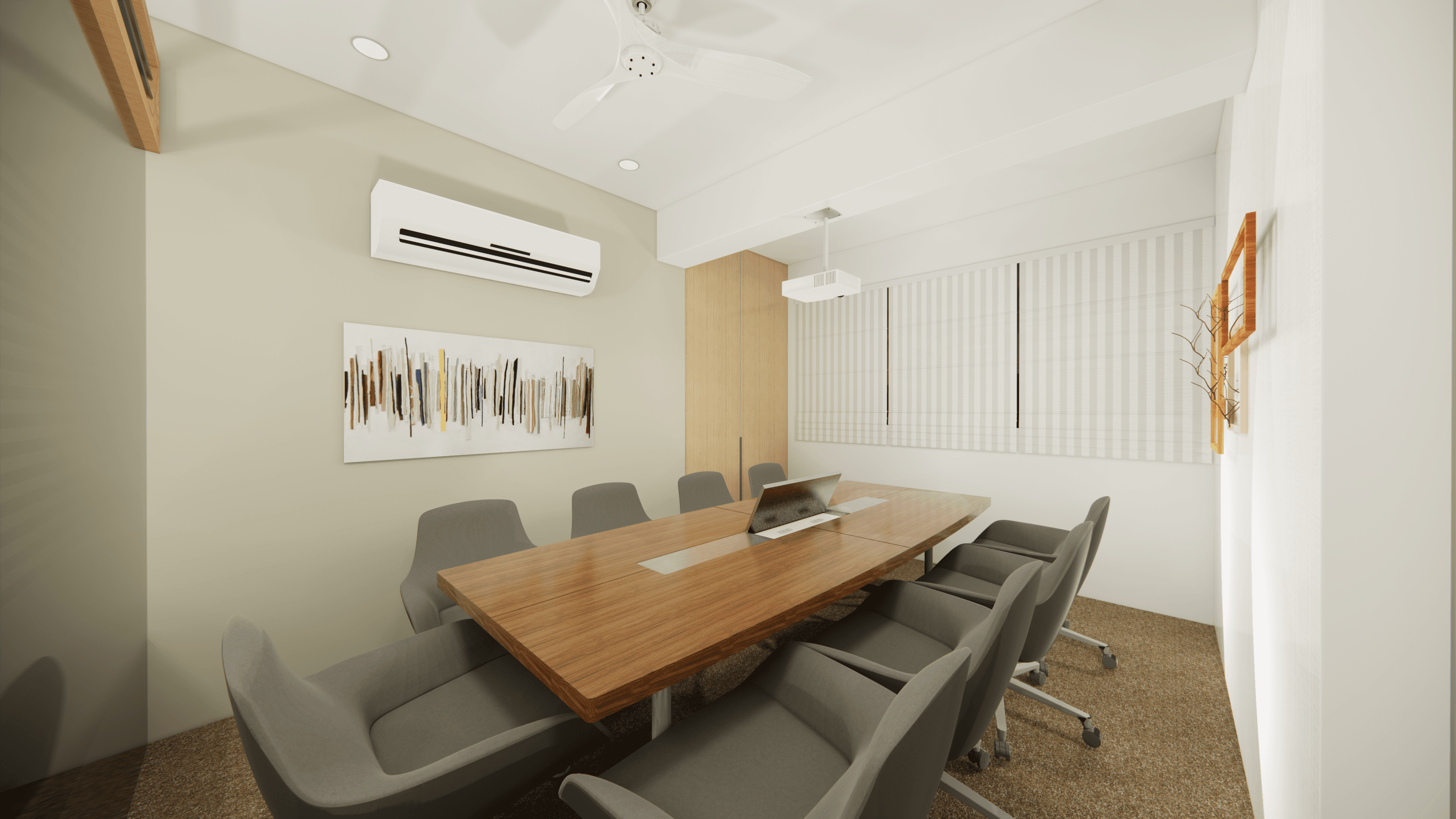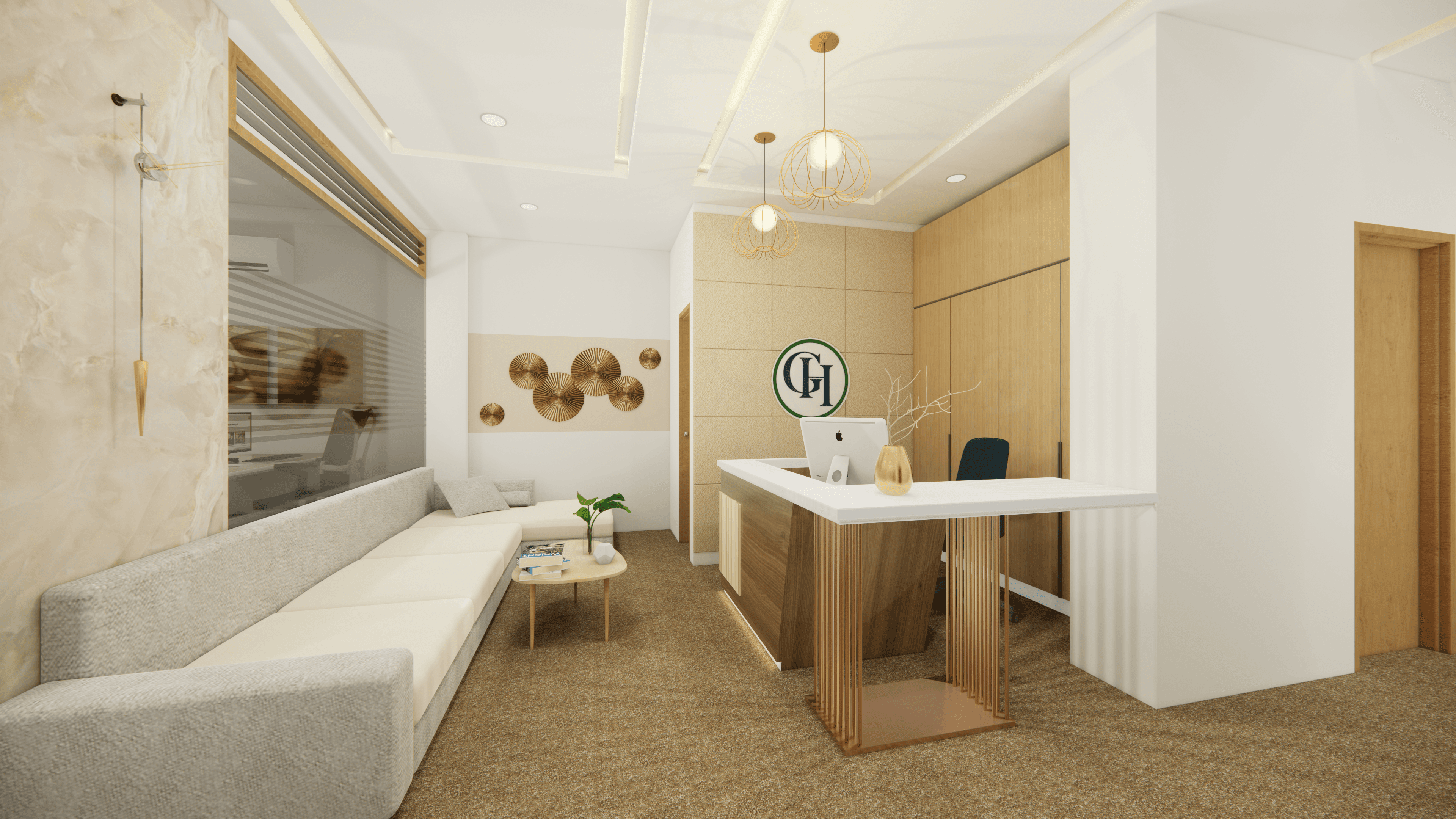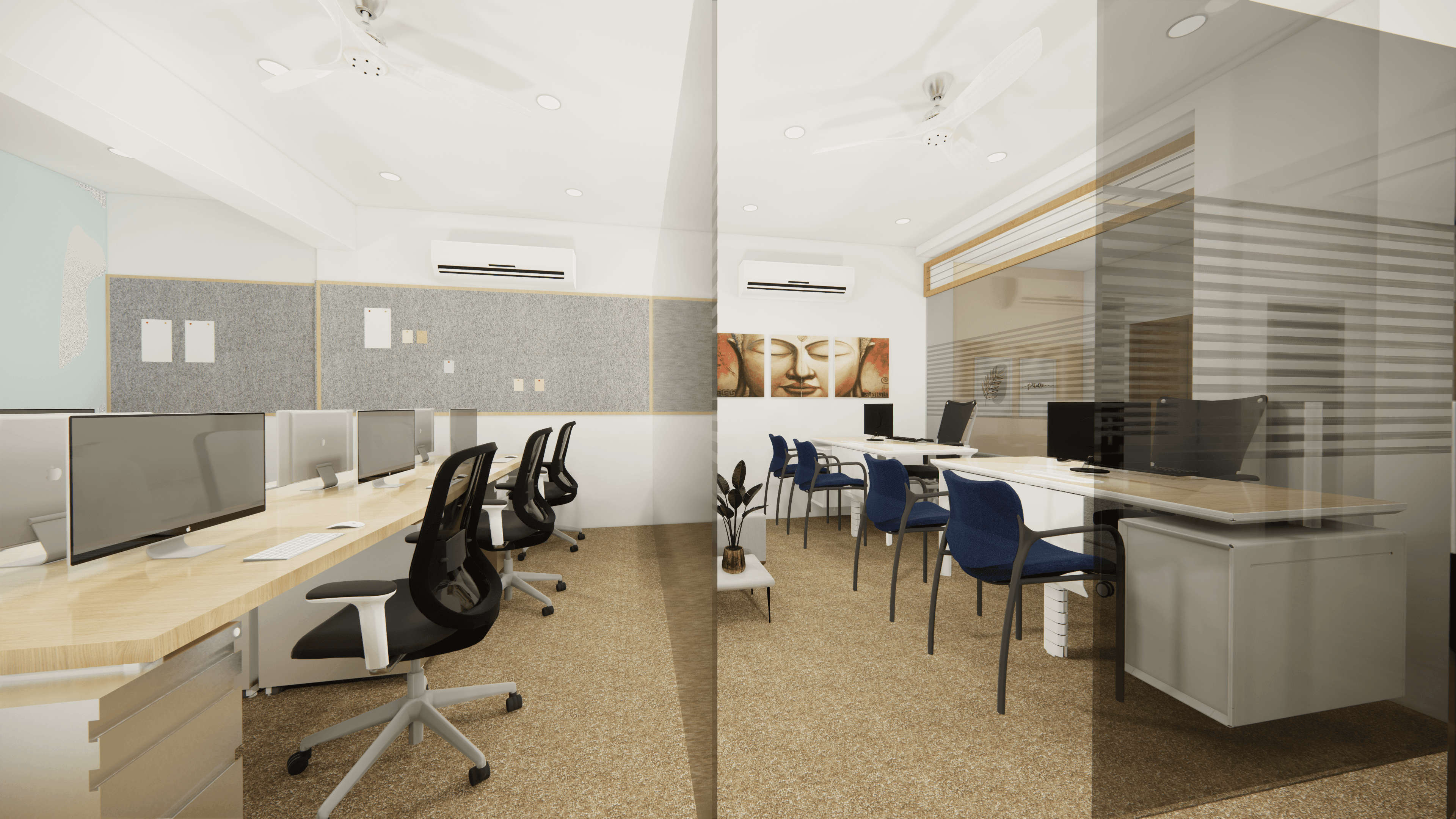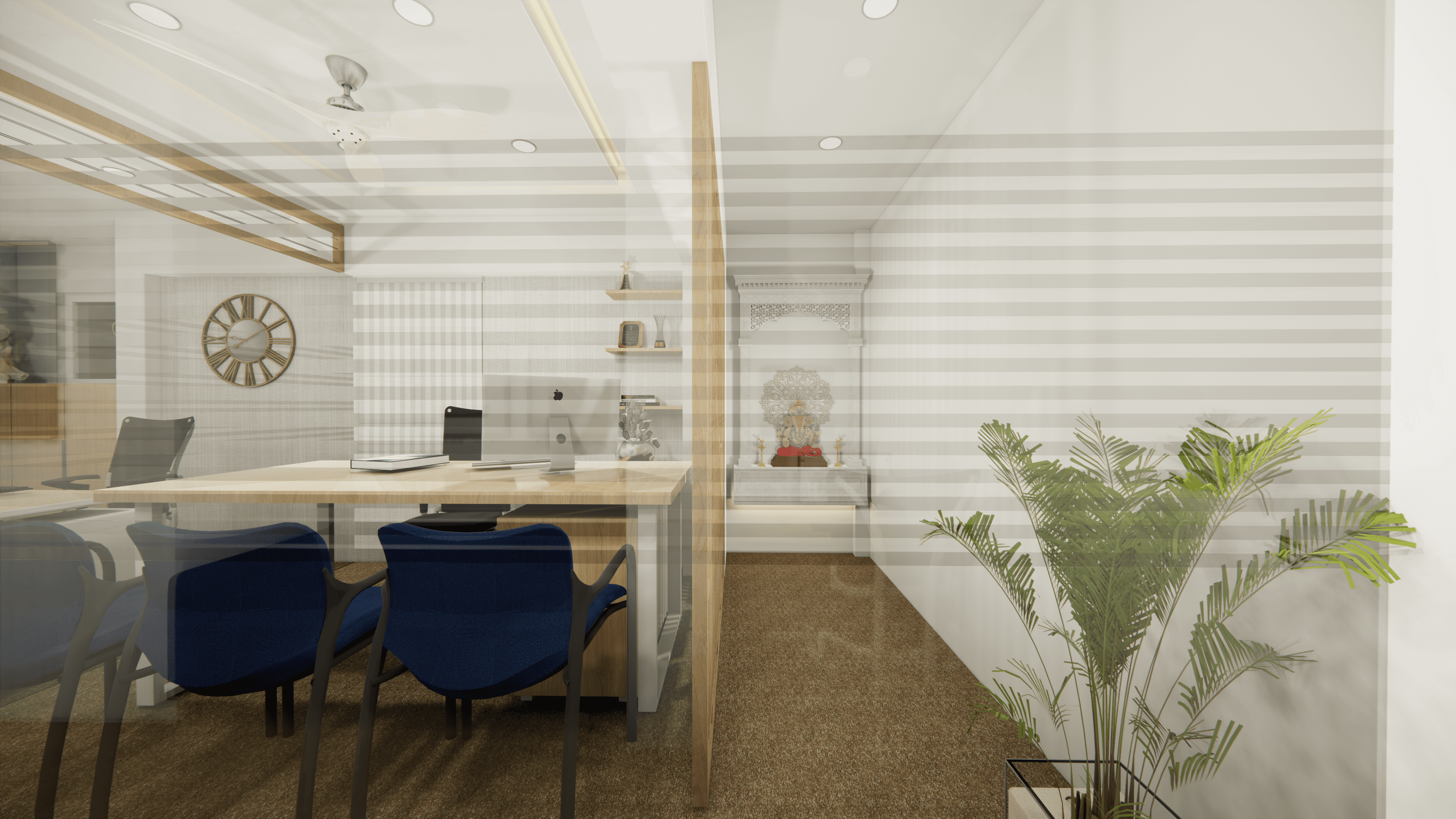 Welcome to Pinetex, a vibrant and functional workspace located in the heart of Delhi. Designed for a textile company's operations, this stylish office showcases a warm and contemporary atmosphere predominantly in pine wood color. As you step inside, you will be greeted by a welcoming reception and a comfortable waiting area. Behind the reception table proudly stands the company logo, making a statement of professionalism and creativity. The office boasts numerous workstations, providing a productive environment for the team, along with a few well-appointed conference rooms for meetings and collaboration. Come and experience the perfect blend of functionality and aesthetics at Pinetex.