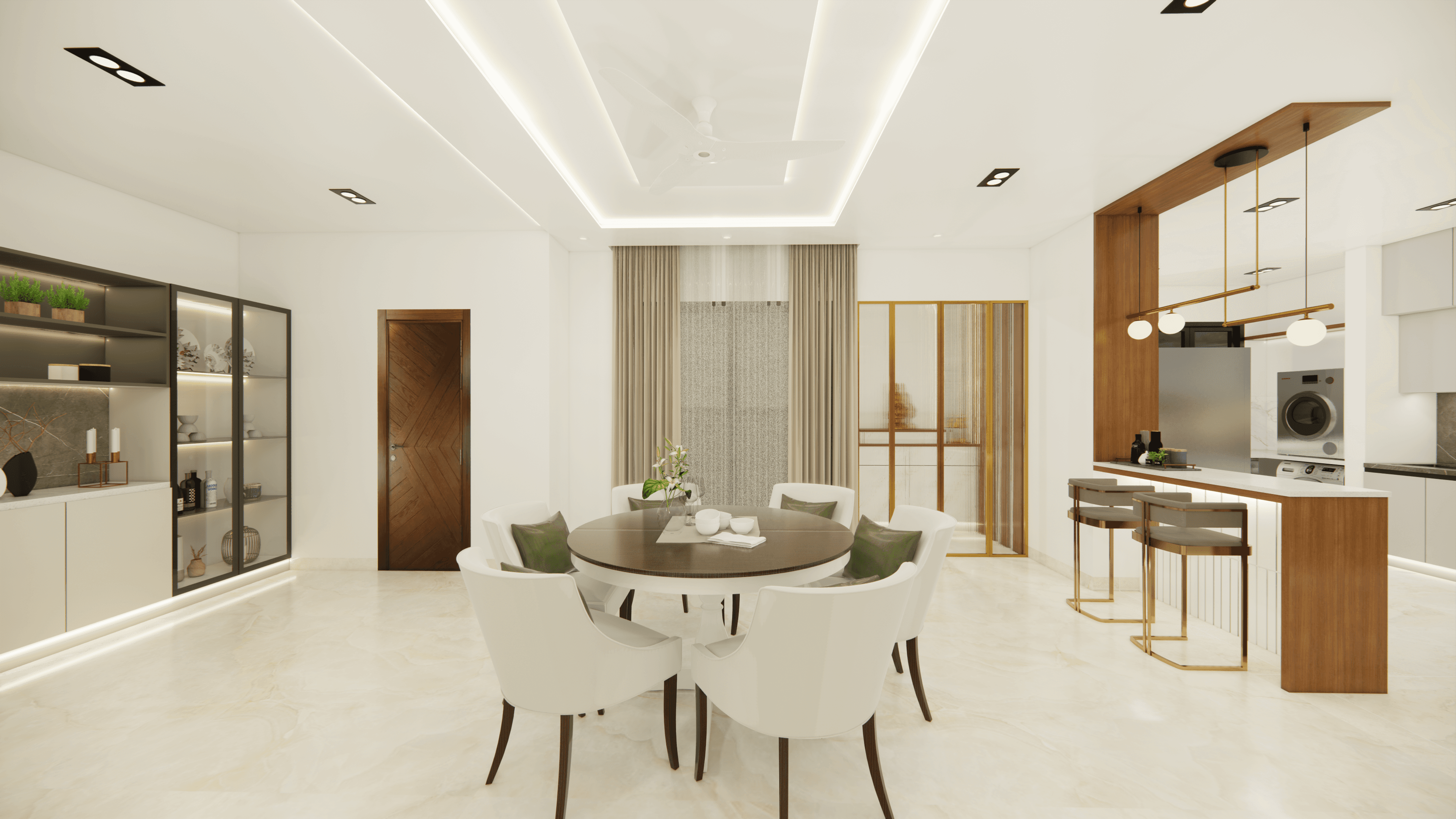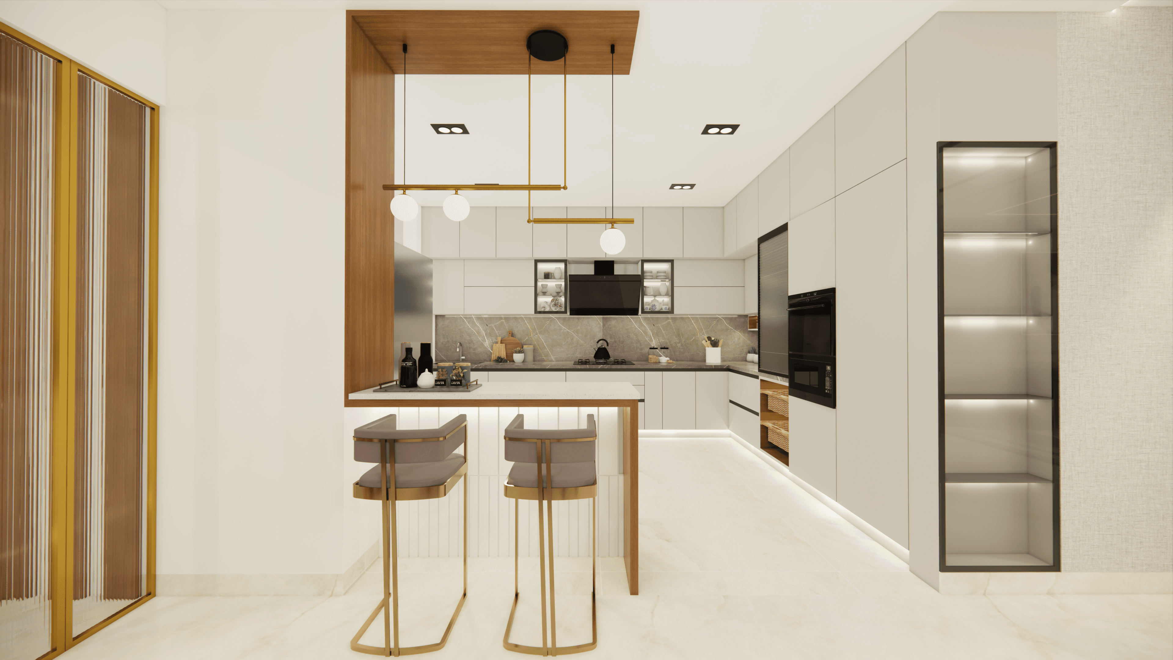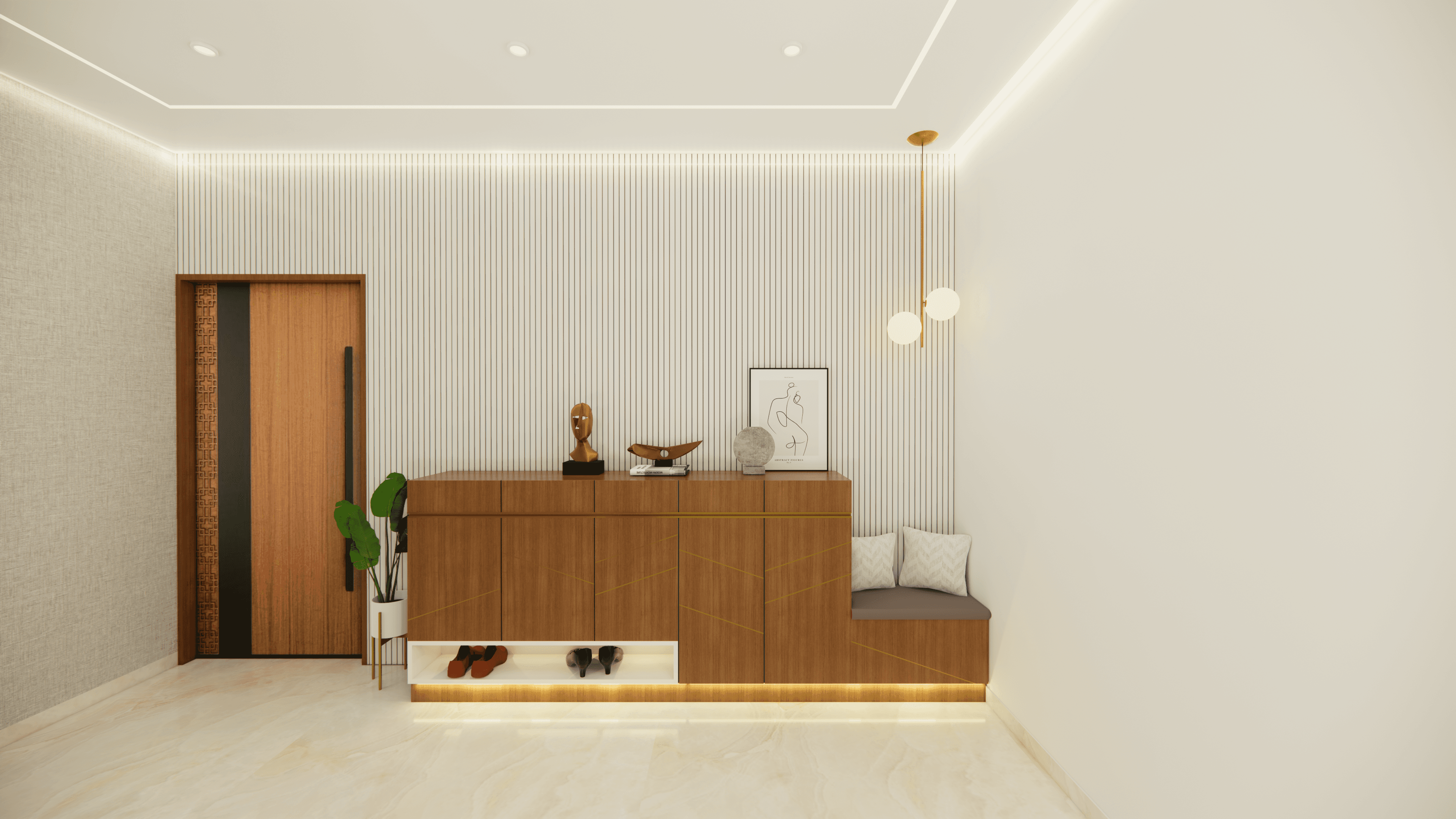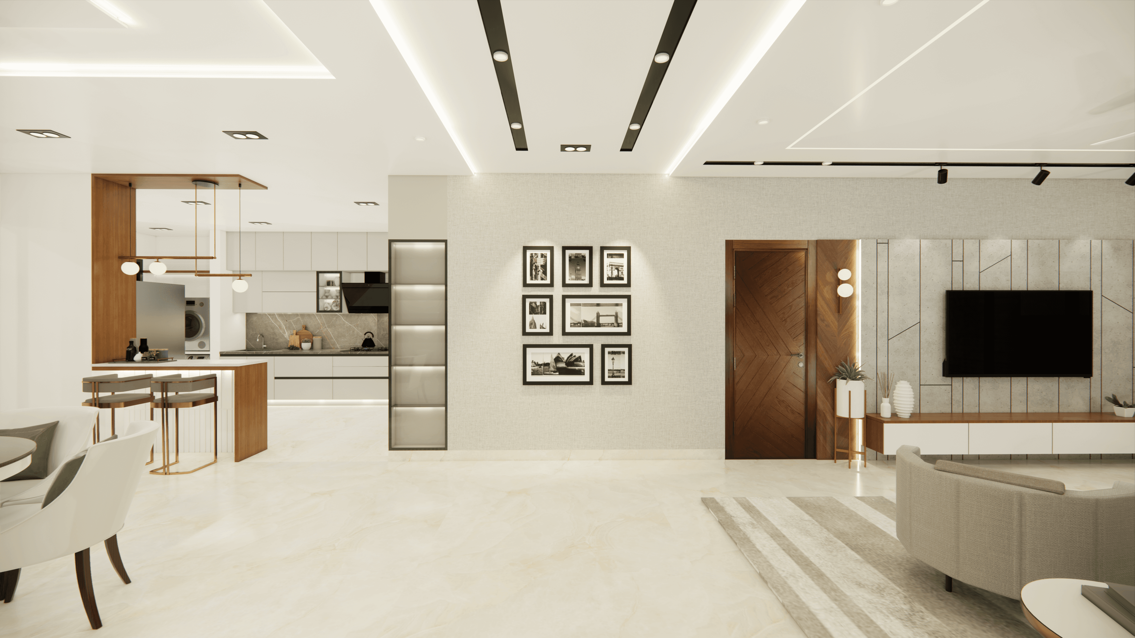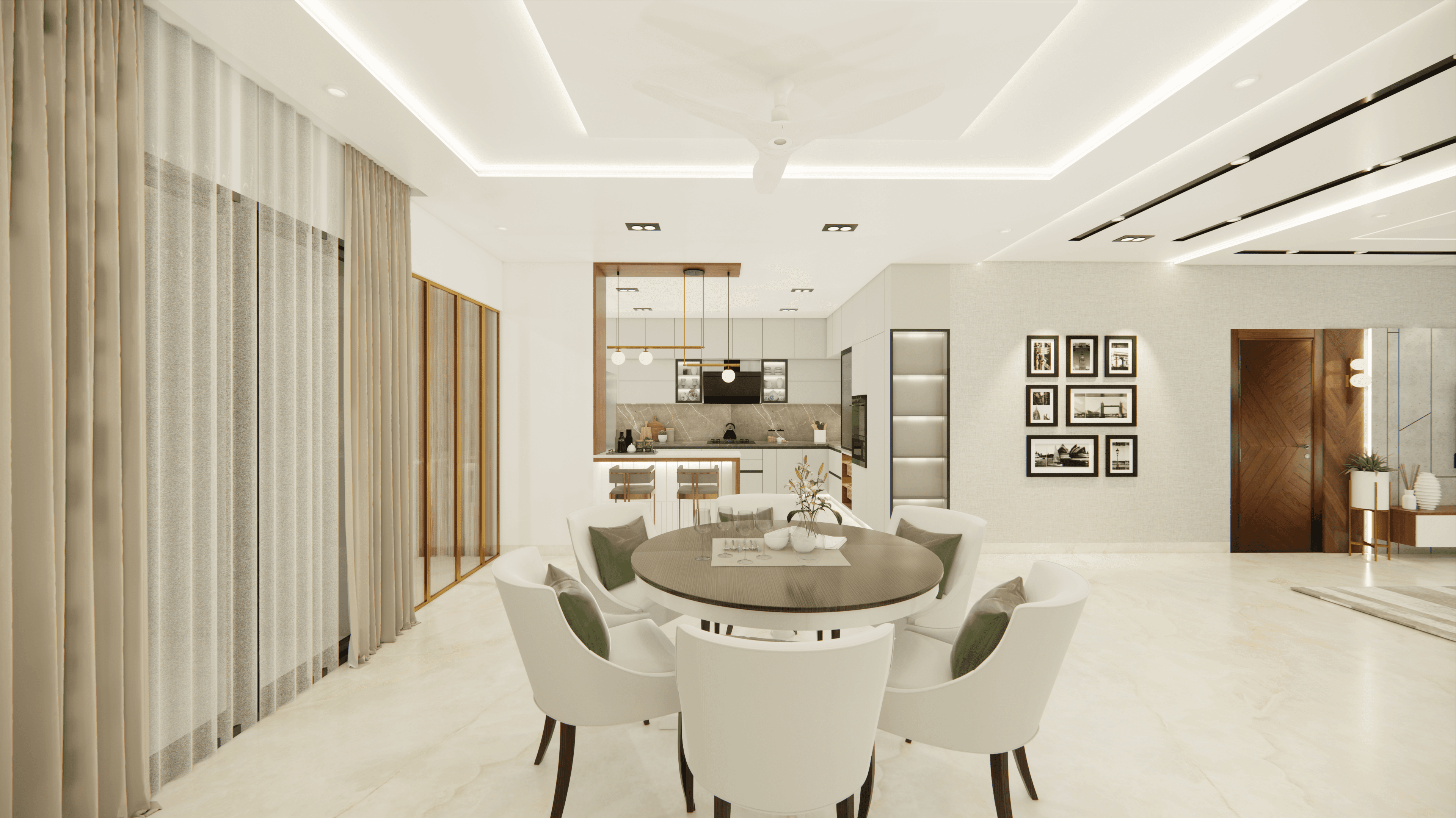 Welcome to Sophisticated Serenity, a stunning 3-bedroom apartment that exudes refined sophistication and contemporary design in Bangalore. As you walk through the entrance, you will be greeted by a striking statement wall with beautiful louvers on either side and a statement table in the middle, setting the tone for the elegance that awaits you. The opposite wall is equally lovely, filled with louvers, a shoe rack, and a seating area. The living room exudes elegance with neutral tones and French paneling. The L-shaped kitchen is a masterpiece of functionality, complemented by a sleek crockery unit. Step into tranquility in the veneer-paneled pooja room with gold-accented fluted glass. Each bedroom is a serene retreat, adorned with pastel colors and French moldings. From the kids' room with soothing blues to the guest room's warm browns and the master bedroom's understated elegance, find your sanctuary at Sophisticated Serenity.