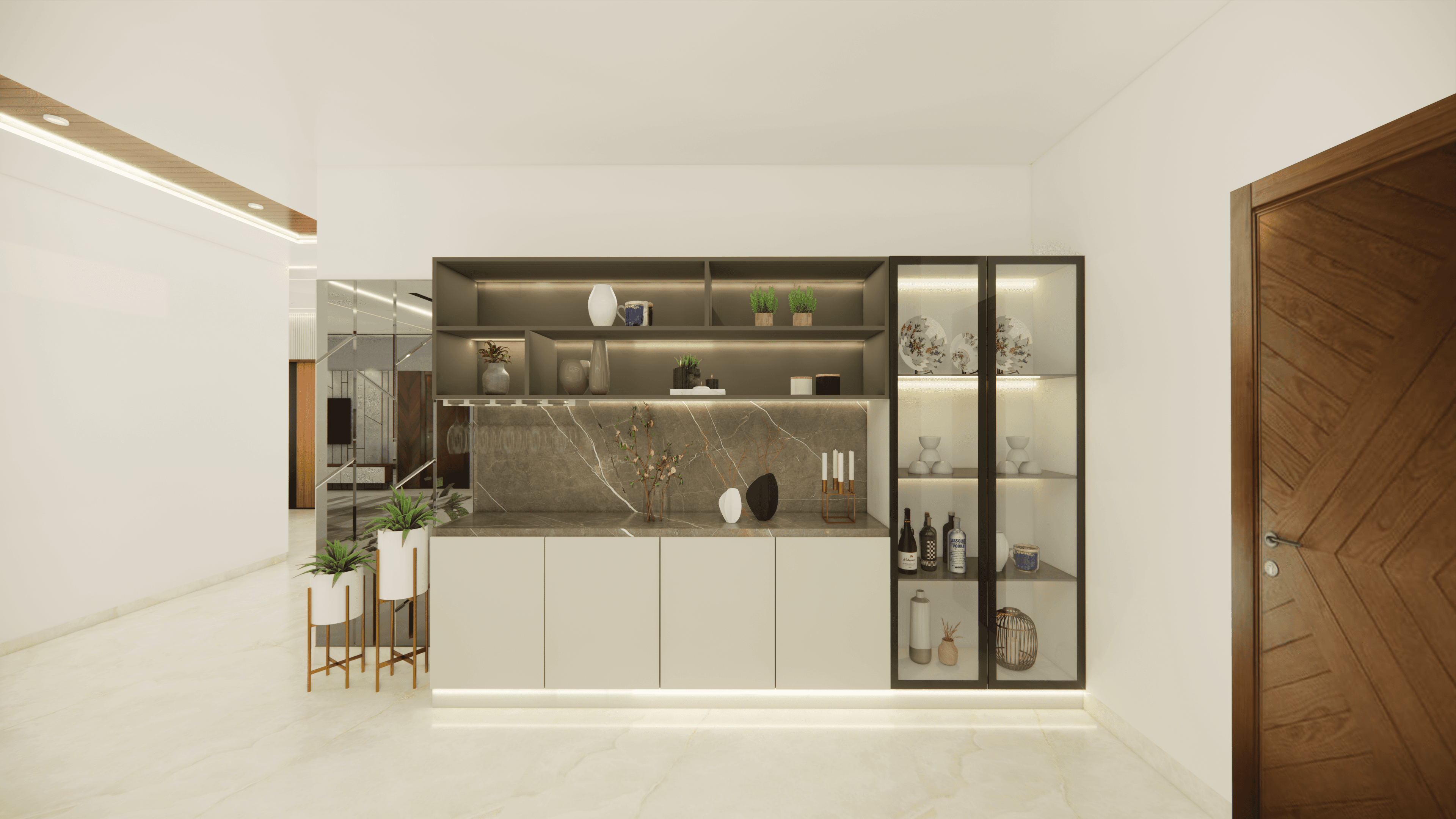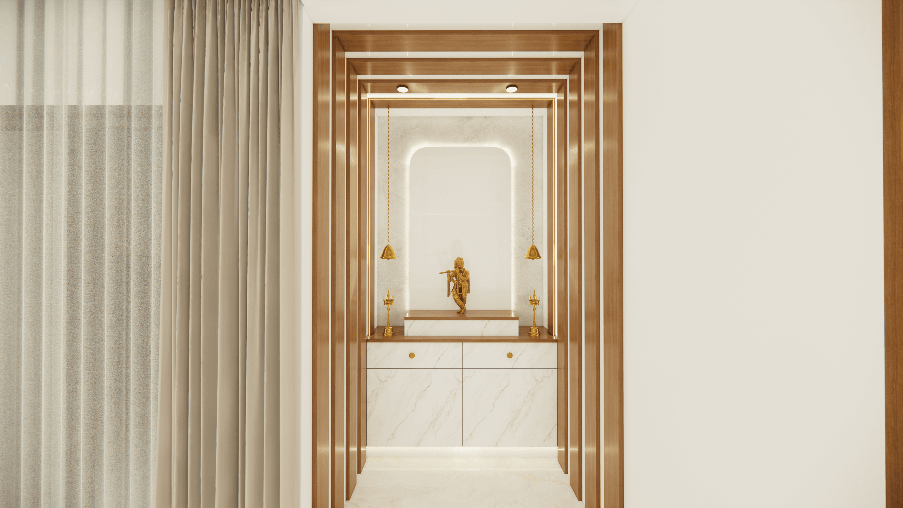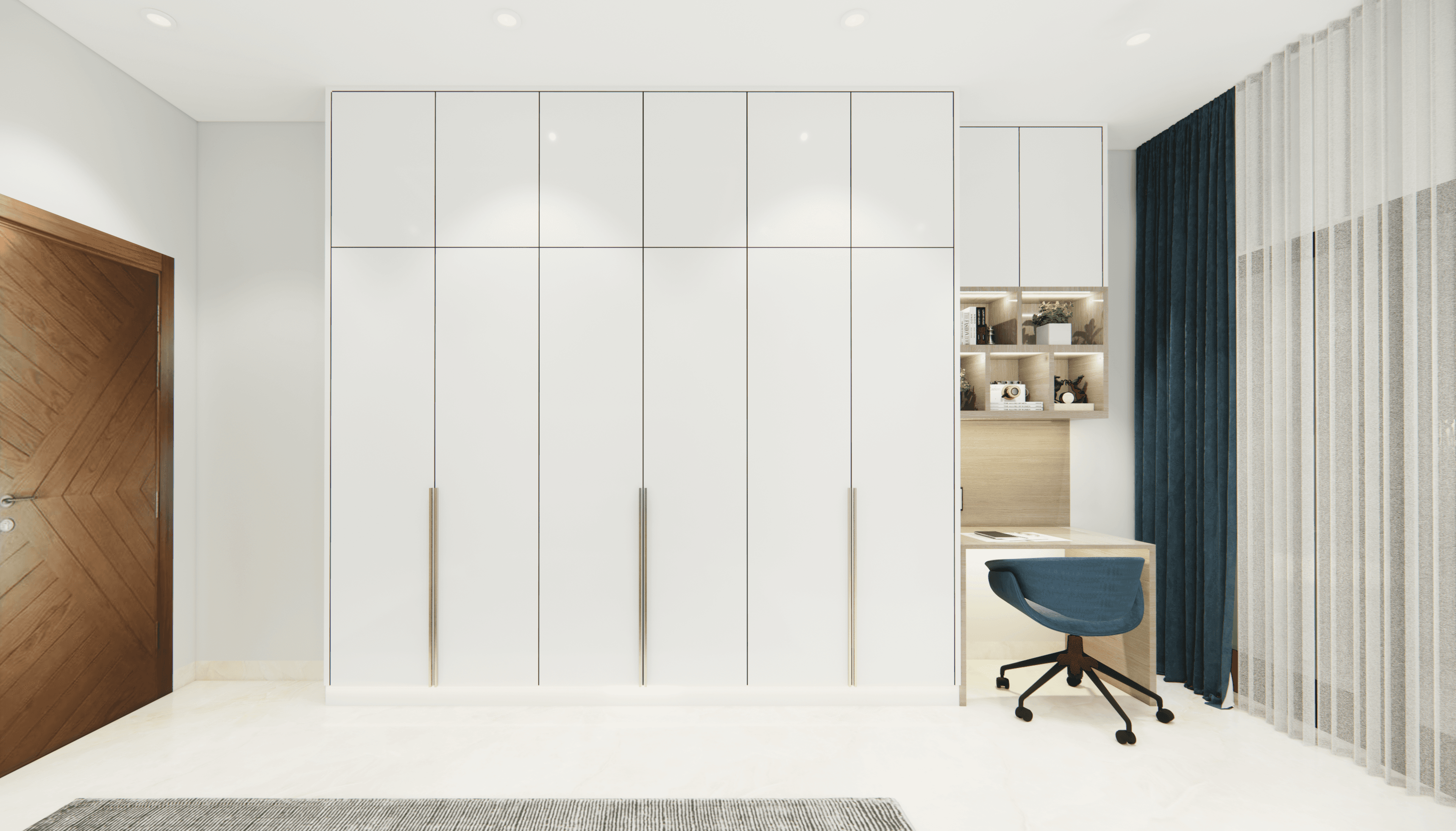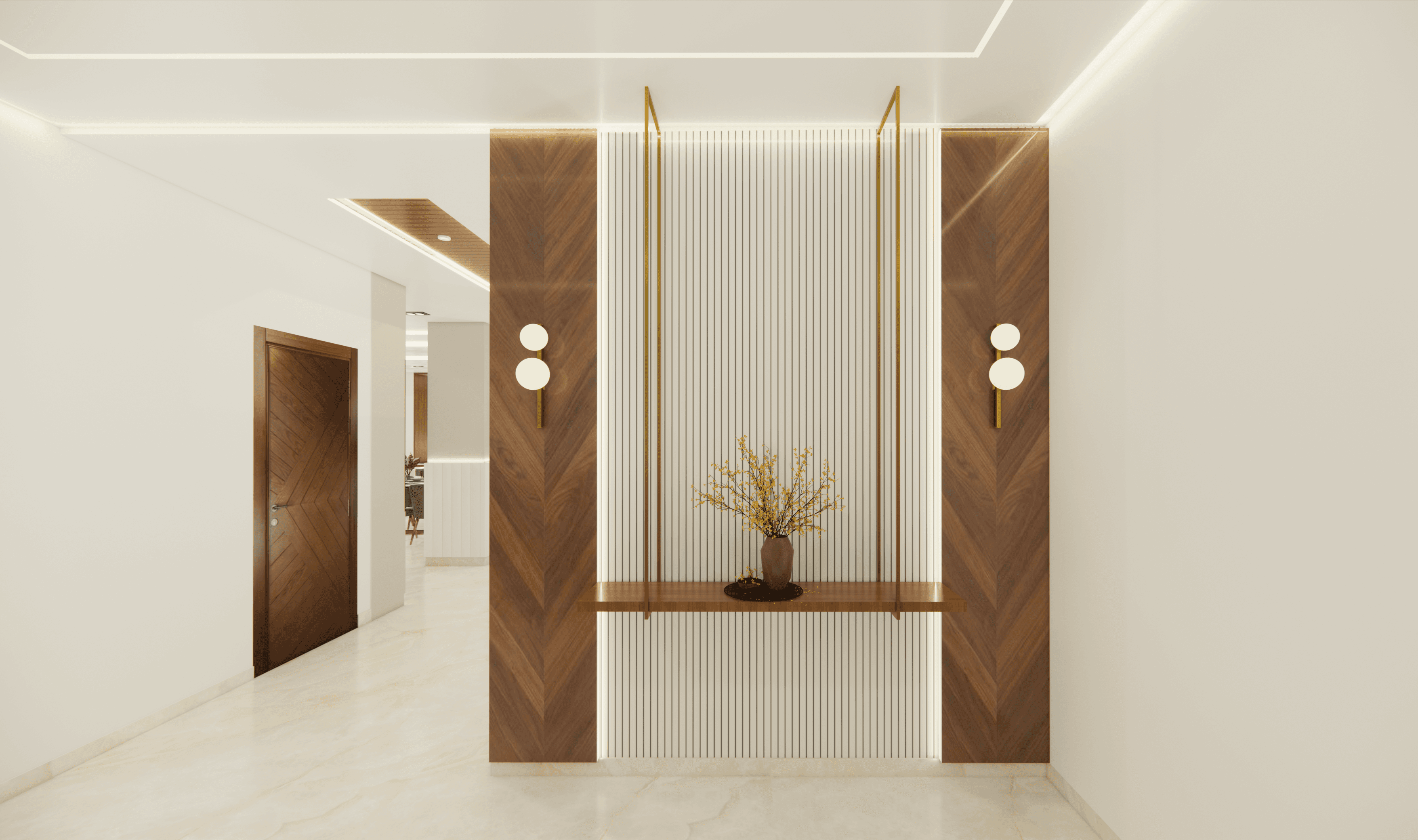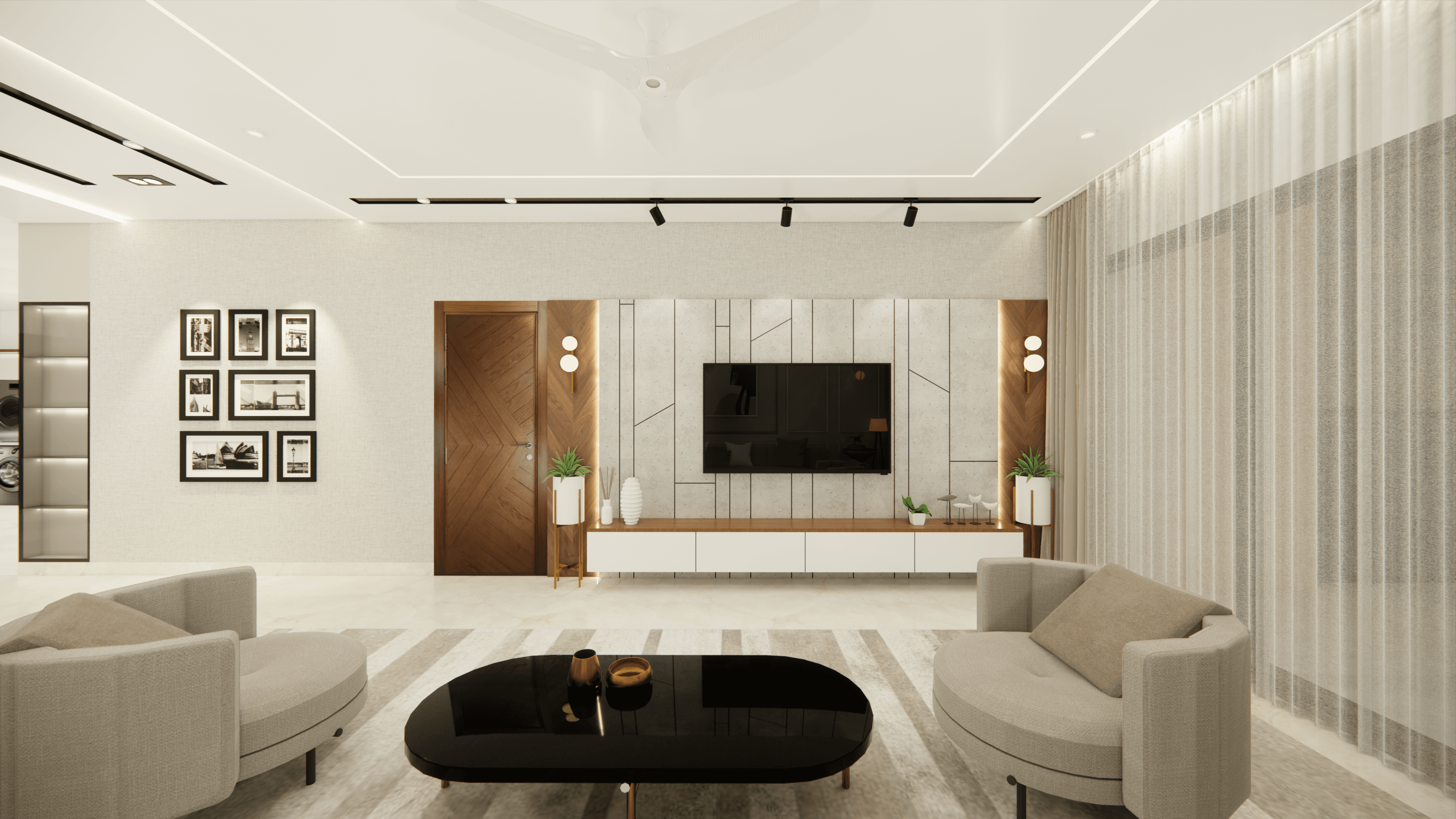 Welcome to Sophisticated Serenity, a stunning 3-bedroom apartment that exudes refined sophistication and contemporary design in Bangalore. As you walk through the entrance, you will be greeted by a striking statement wall with beautiful louvers on either side and a statement table in the middle, setting the tone for the elegance that awaits you. The opposite wall is equally lovely, filled with louvers, a shoe rack, and a seating area. The living room exudes elegance with neutral tones and French paneling. The L-shaped kitchen is a masterpiece of functionality, complemented by a sleek crockery unit. Step into tranquility in the veneer-paneled pooja room with gold-accented fluted glass. Each bedroom is a serene retreat, adorned with pastel colors and French moldings. From the kids' room with soothing blues to the guest room's warm browns and the master bedroom's understated elegance, find your sanctuary at Sophisticated Serenity.