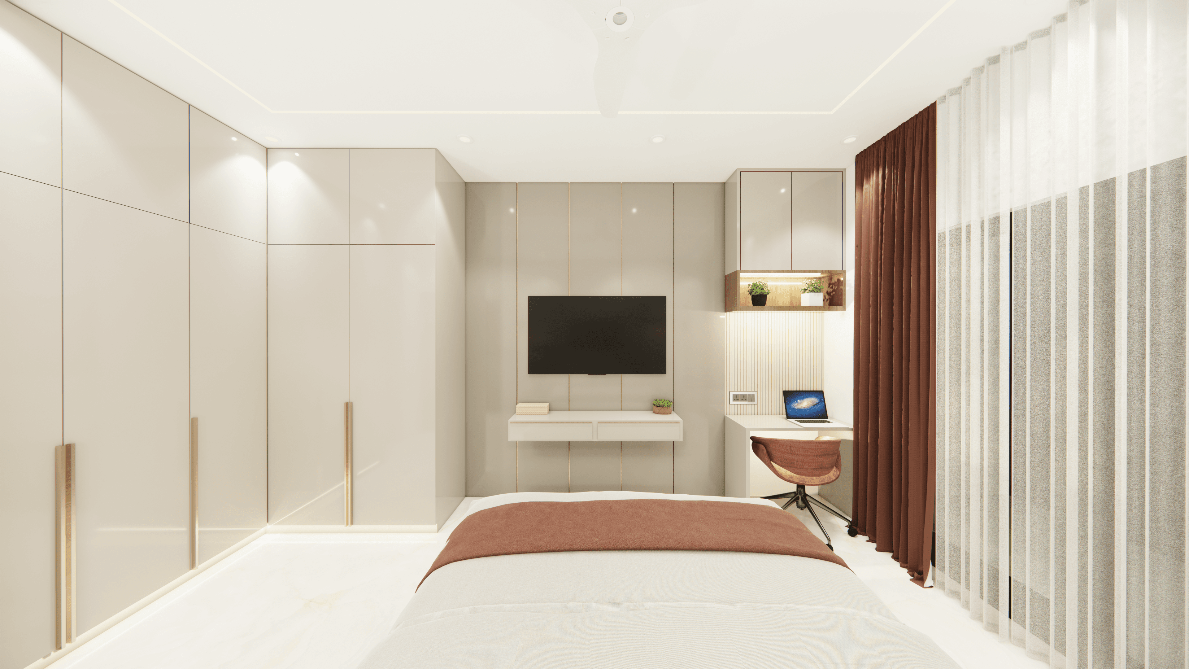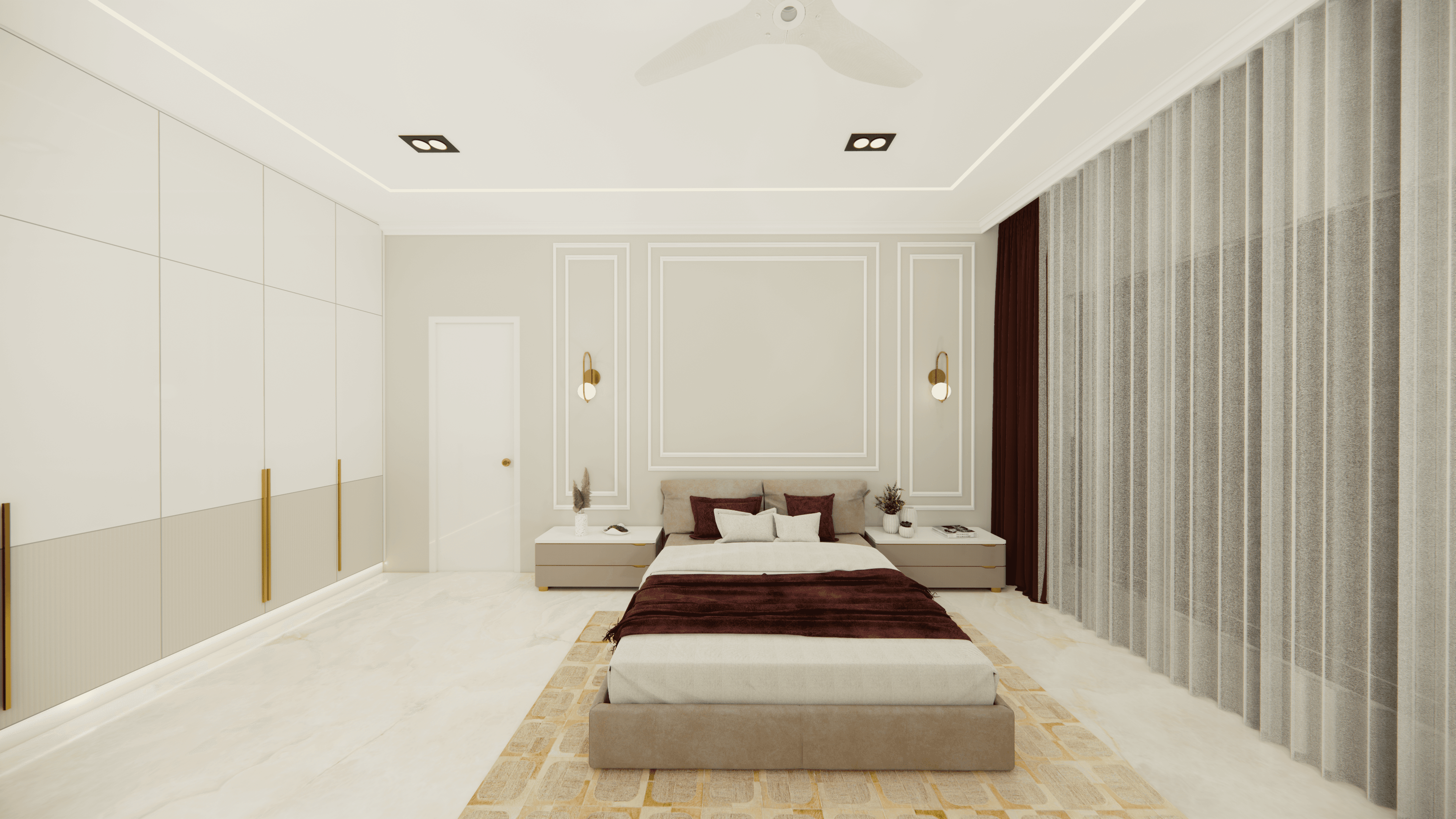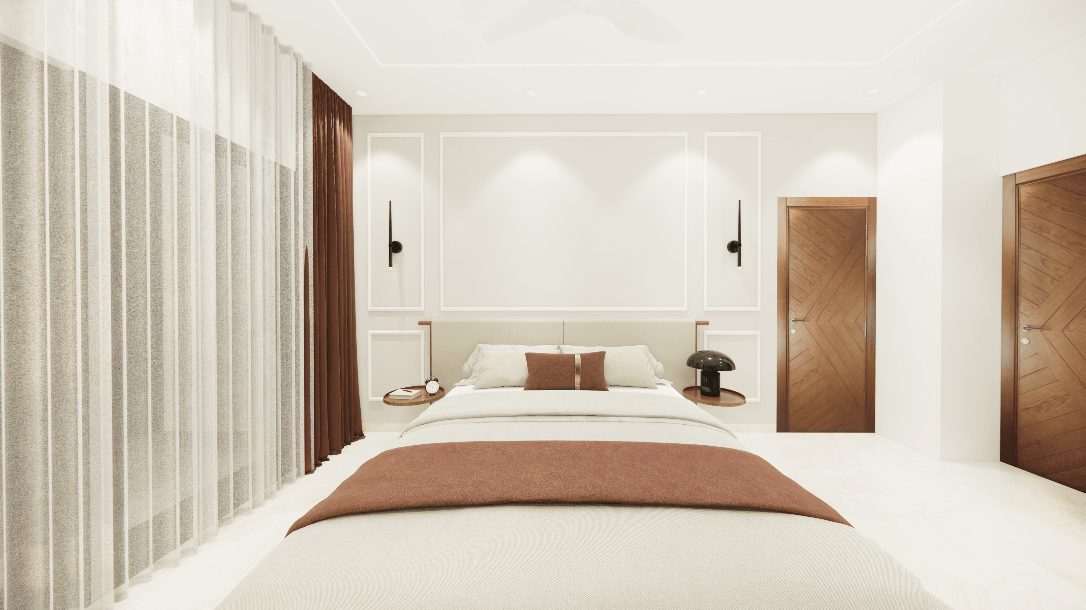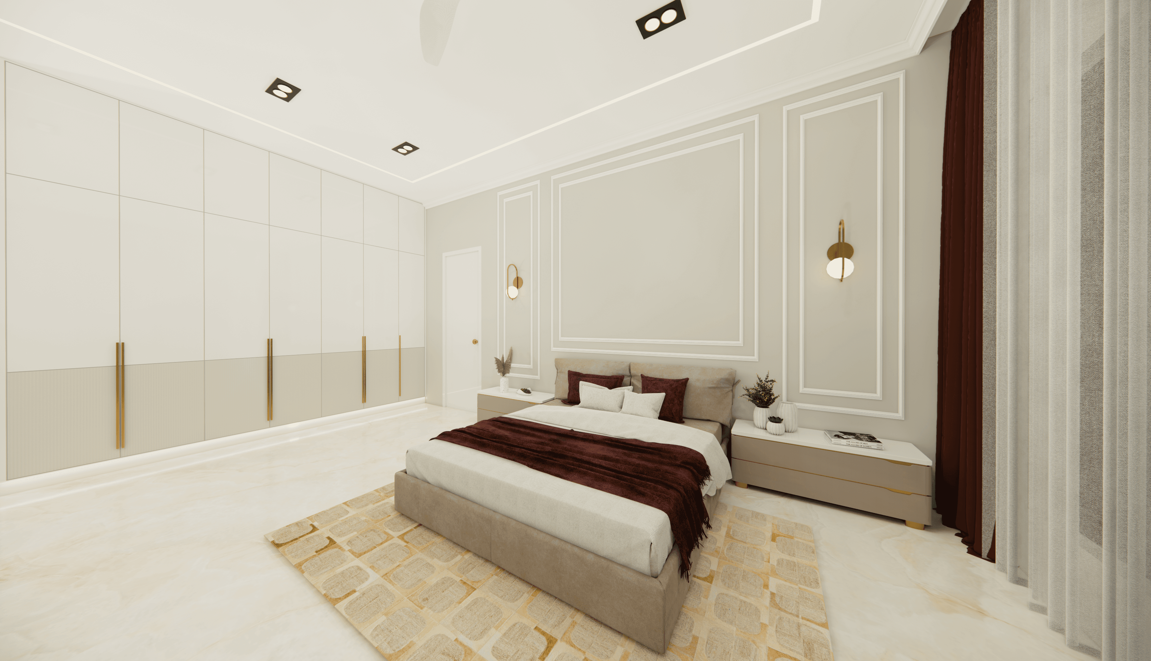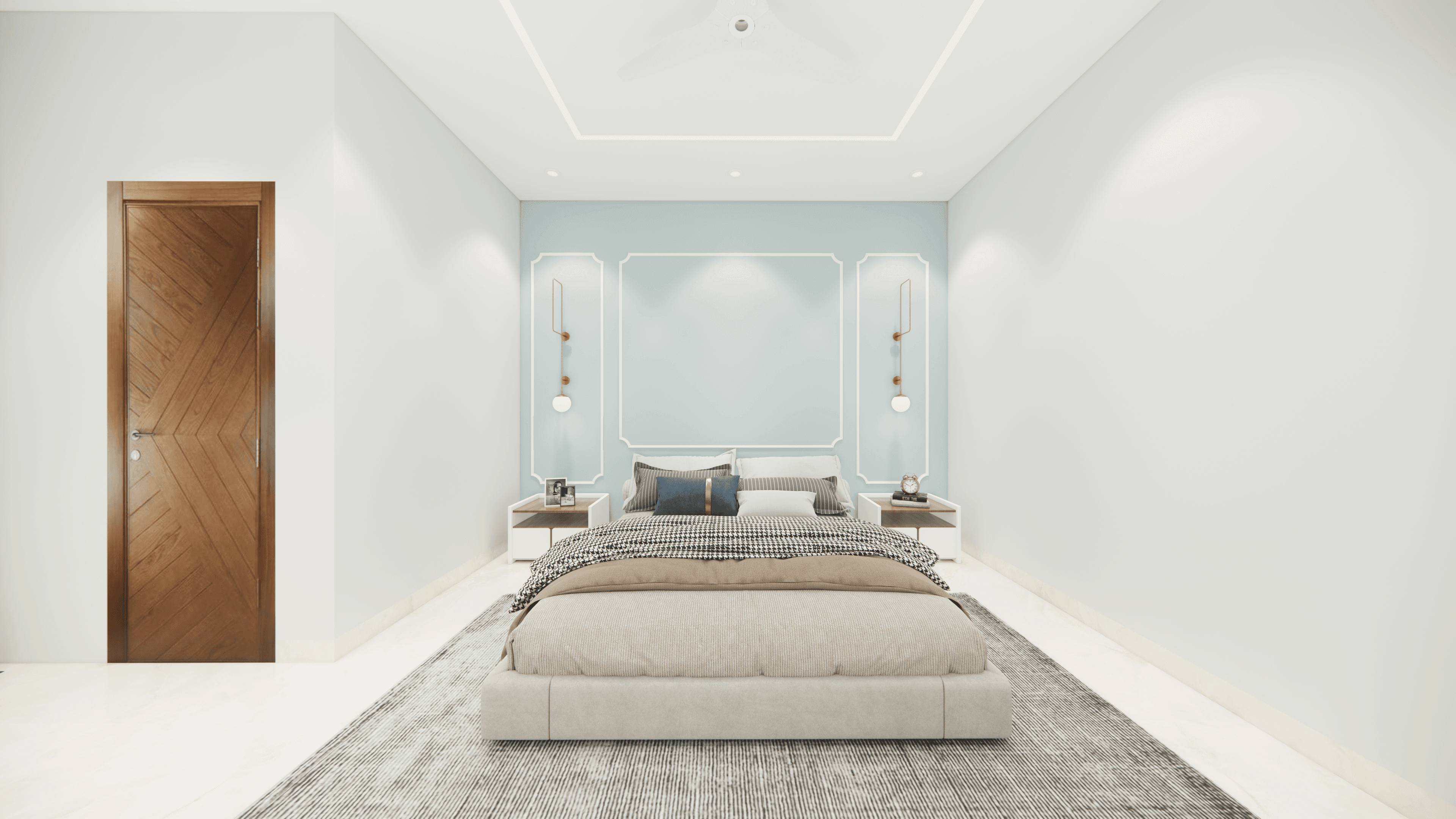 Welcome to Sophisticated Serenity, a stunning 3-bedroom apartment that exudes refined sophistication and contemporary design in Bangalore. As you walk through the entrance, you will be greeted by a striking statement wall with beautiful louvers on either side and a statement table in the middle, setting the tone for the elegance that awaits you. The opposite wall is equally lovely, filled with louvers, a shoe rack, and a seating area. The living room exudes elegance with neutral tones and French paneling. The L-shaped kitchen is a masterpiece of functionality, complemented by a sleek crockery unit. Step into tranquility in the veneer-paneled pooja room with gold-accented fluted glass. Each bedroom is a serene retreat, adorned with pastel colors and French moldings. From the kids' room with soothing blues to the guest room's warm browns and the master bedroom's understated elegance, find your sanctuary at Sophisticated Serenity.