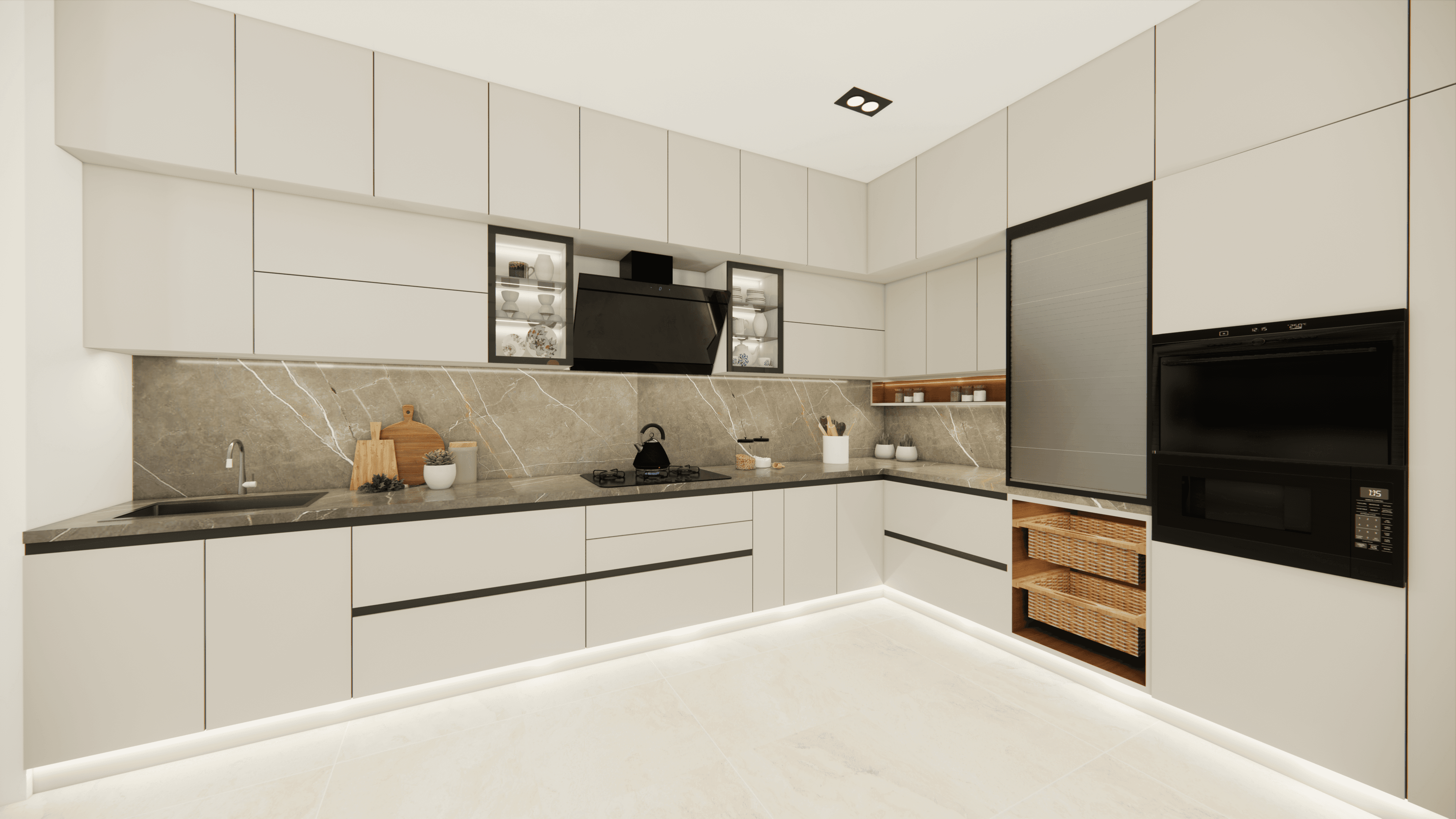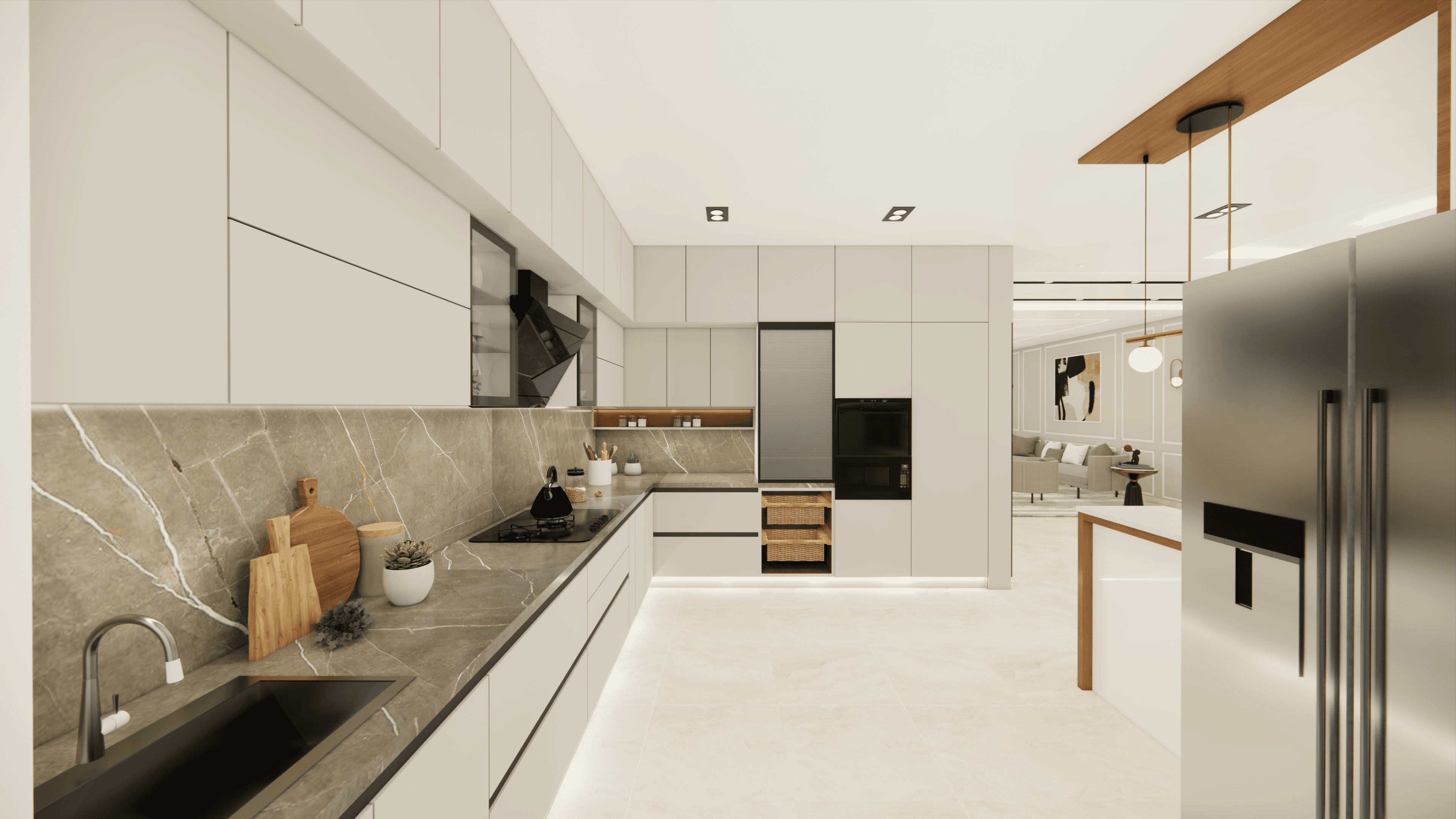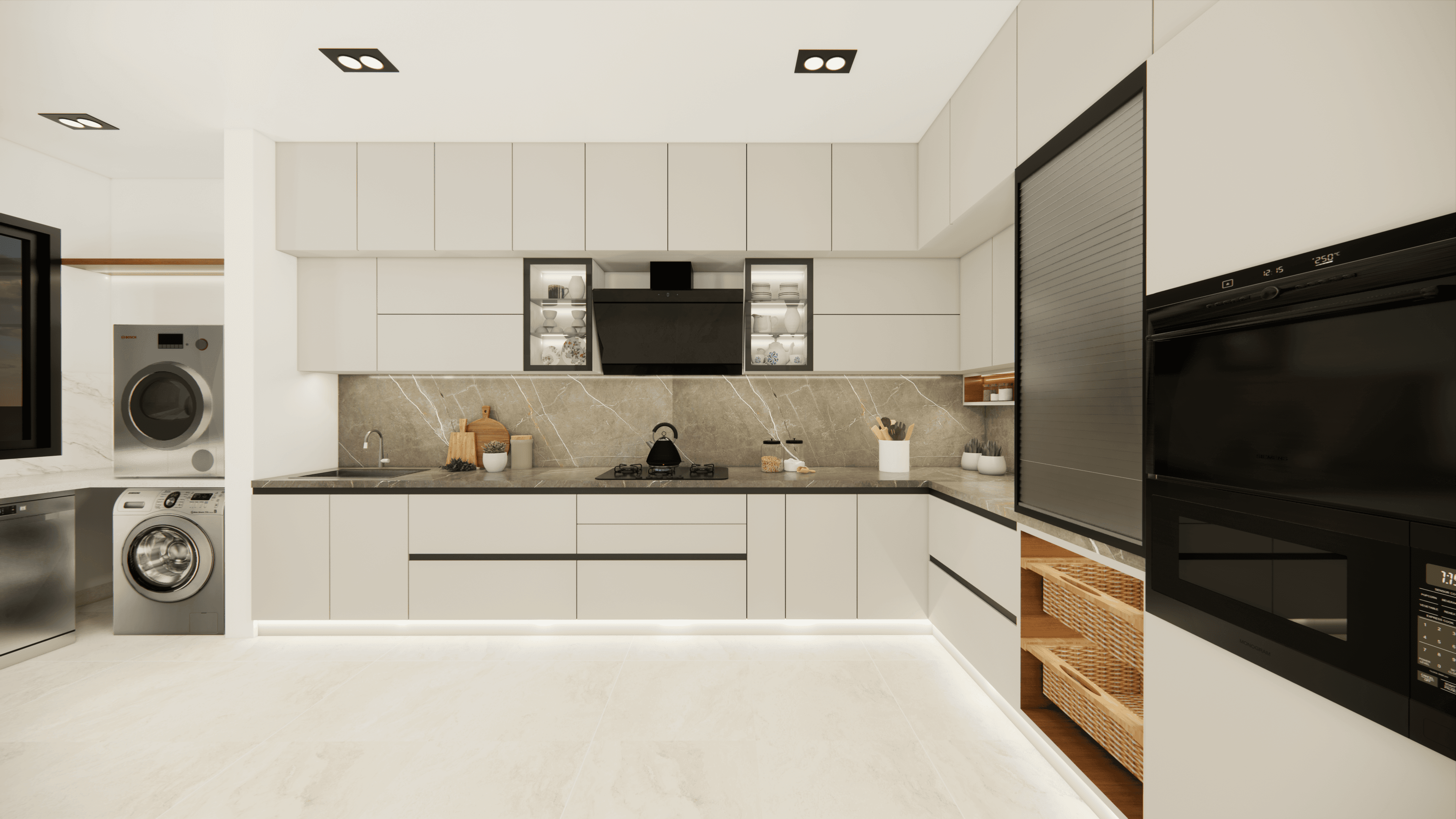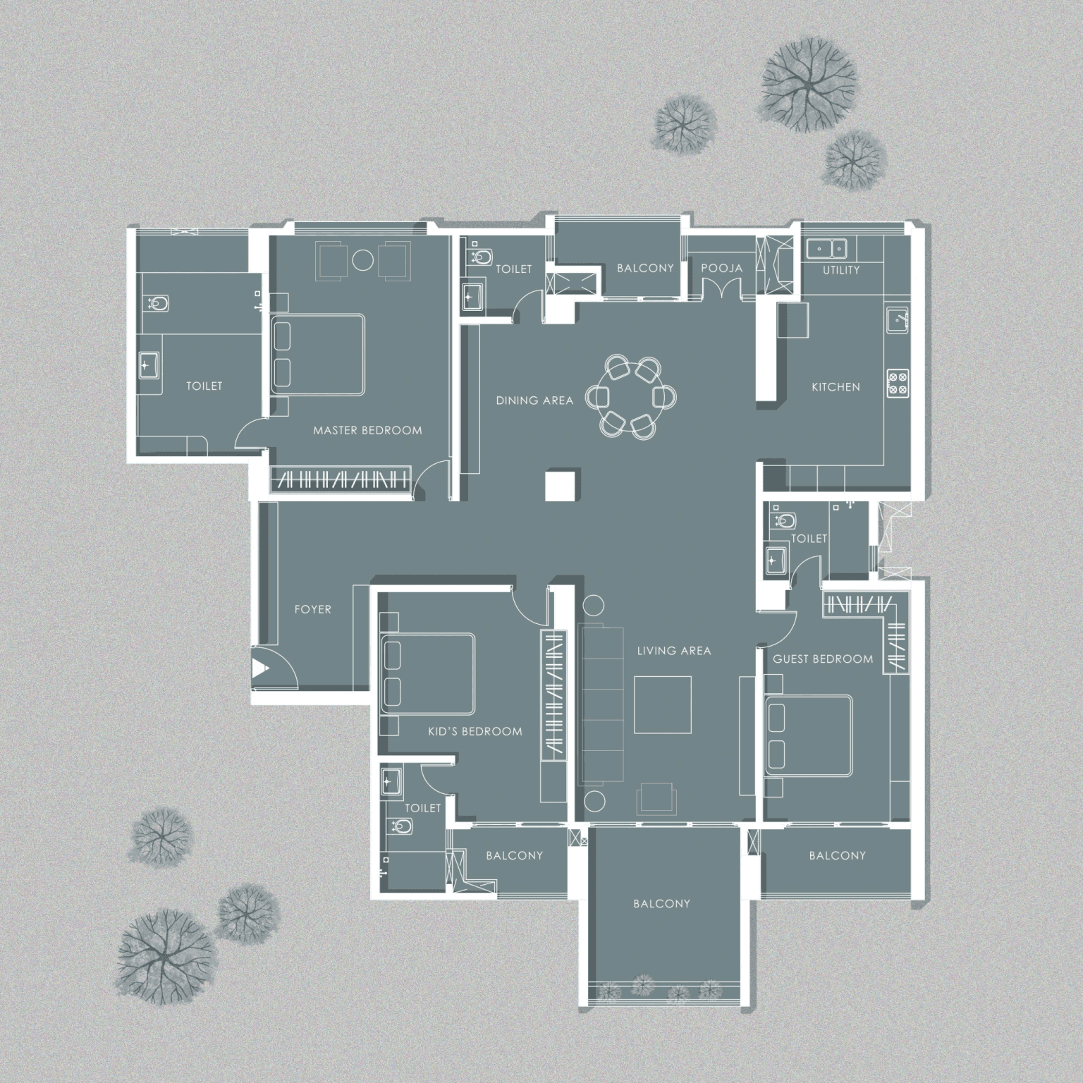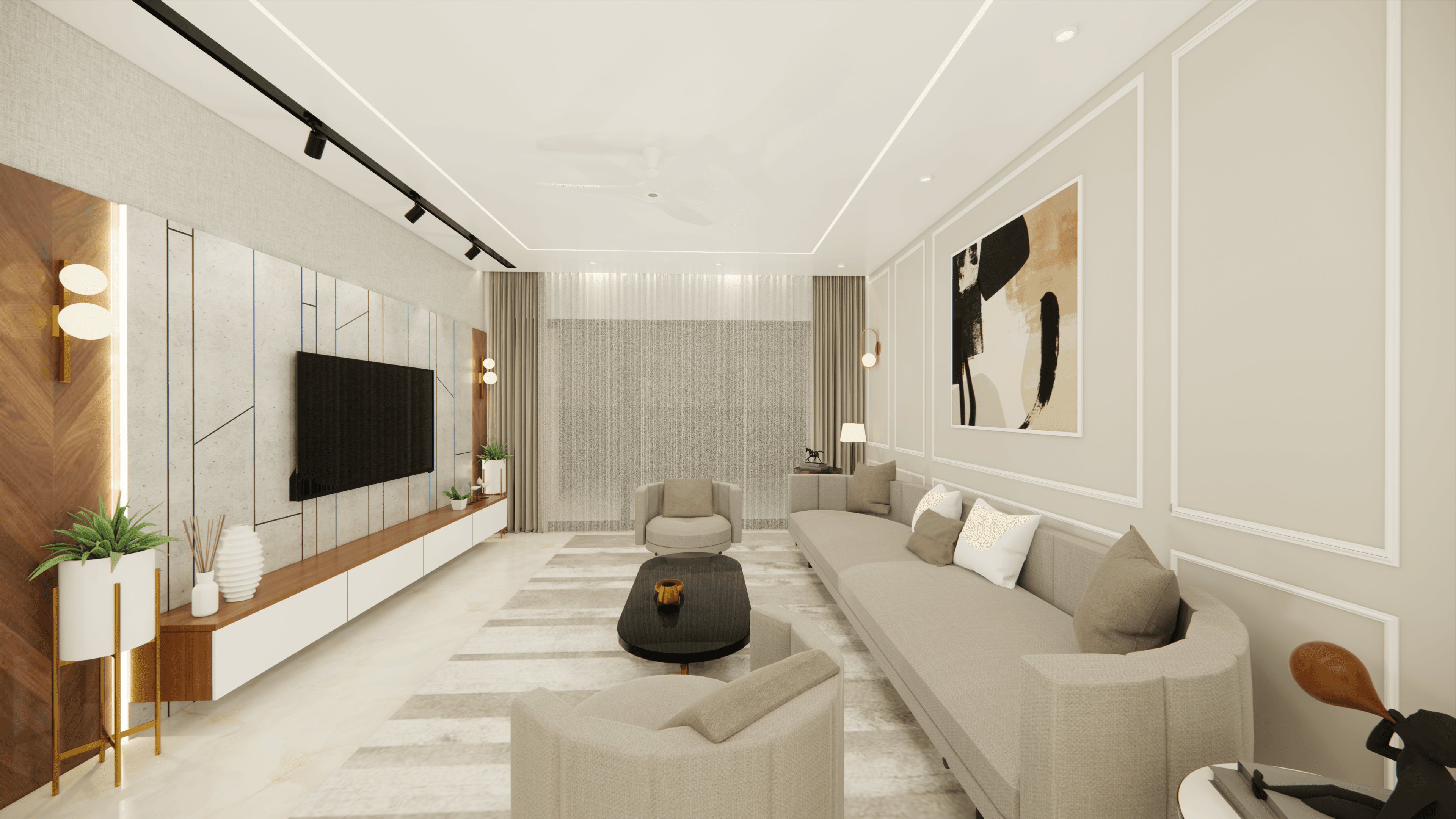 Welcome to Sophisticated Serenity, a stunning 3-bedroom apartment that exudes refined sophistication and contemporary design in Bangalore. As you walk through the entrance, you will be greeted by a striking statement wall with beautiful louvers on either side and a statement table in the middle, setting the tone for the elegance that awaits you. The opposite wall is equally lovely, filled with louvers, a shoe rack, and a seating area. The living room exudes elegance with neutral tones and French paneling. The L-shaped kitchen is a masterpiece of functionality, complemented by a sleek crockery unit. Step into tranquility in the veneer-paneled pooja room with gold-accented fluted glass. Each bedroom is a serene retreat, adorned with pastel colors and French moldings. From the kids' room with soothing blues to the guest room's warm browns and the master bedroom's understated elegance, find your sanctuary at Sophisticated Serenity.