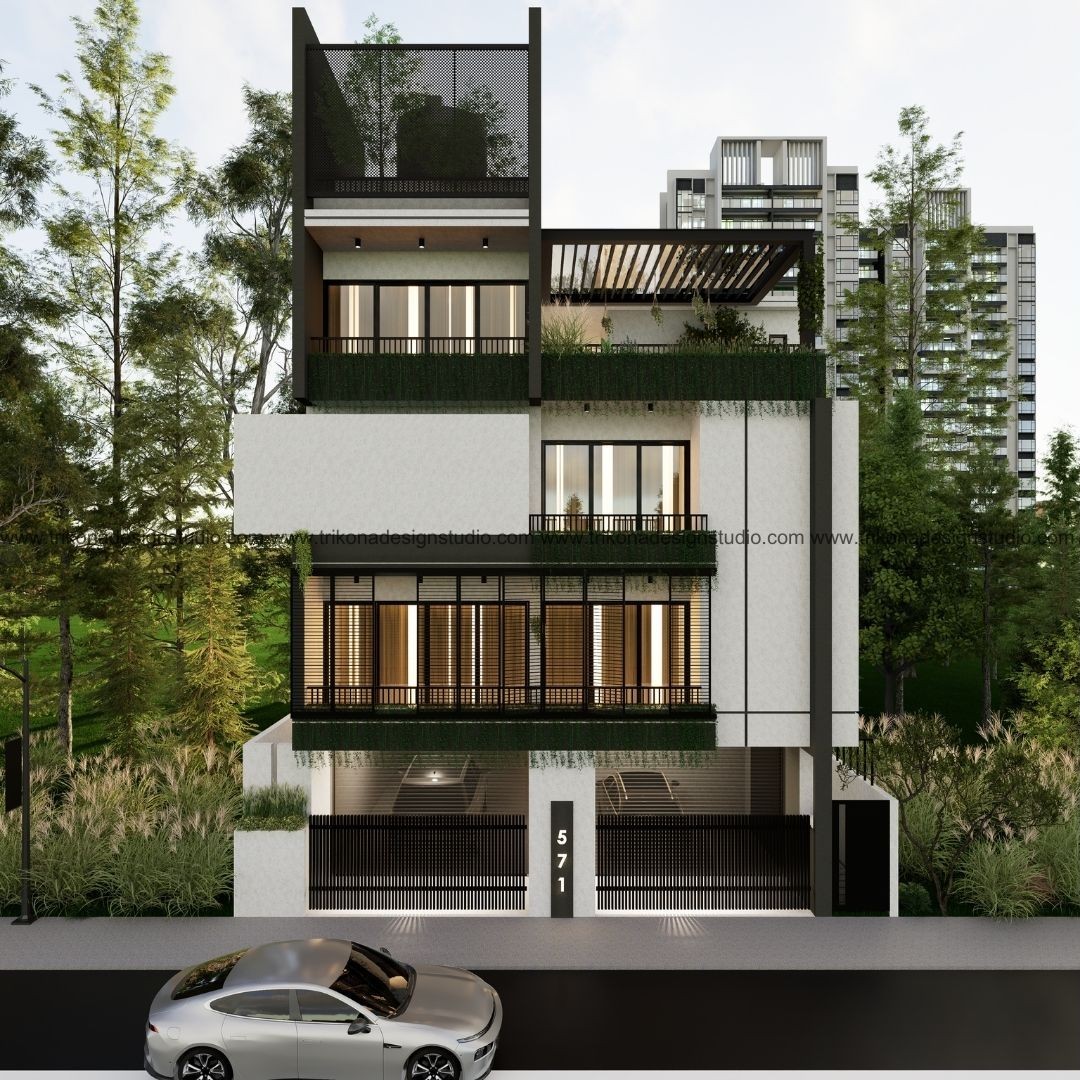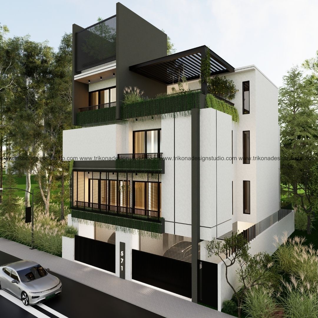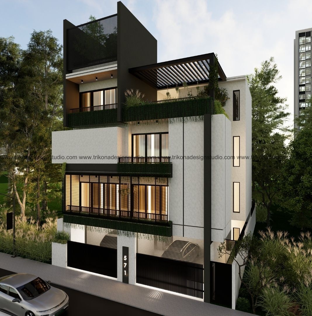 This project presents a contemporary vertical residence with a bold and minimal façade. The design features a balanced composition of solid volumes, metal elements, and large openings. Green terraces and planter bands add a natural layer, softening the structure while enhancing privacy. The pergola and screened upper level create visual interest, while the overall design emphasizes light, ventilation, and a strong urban presence.